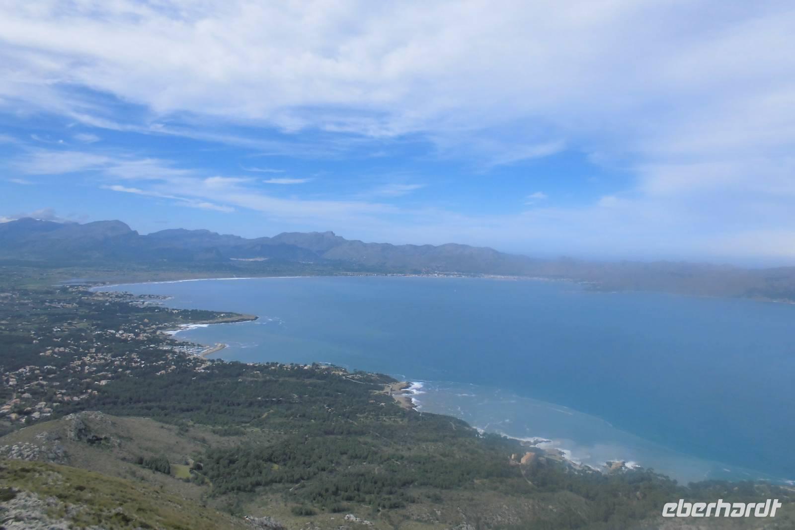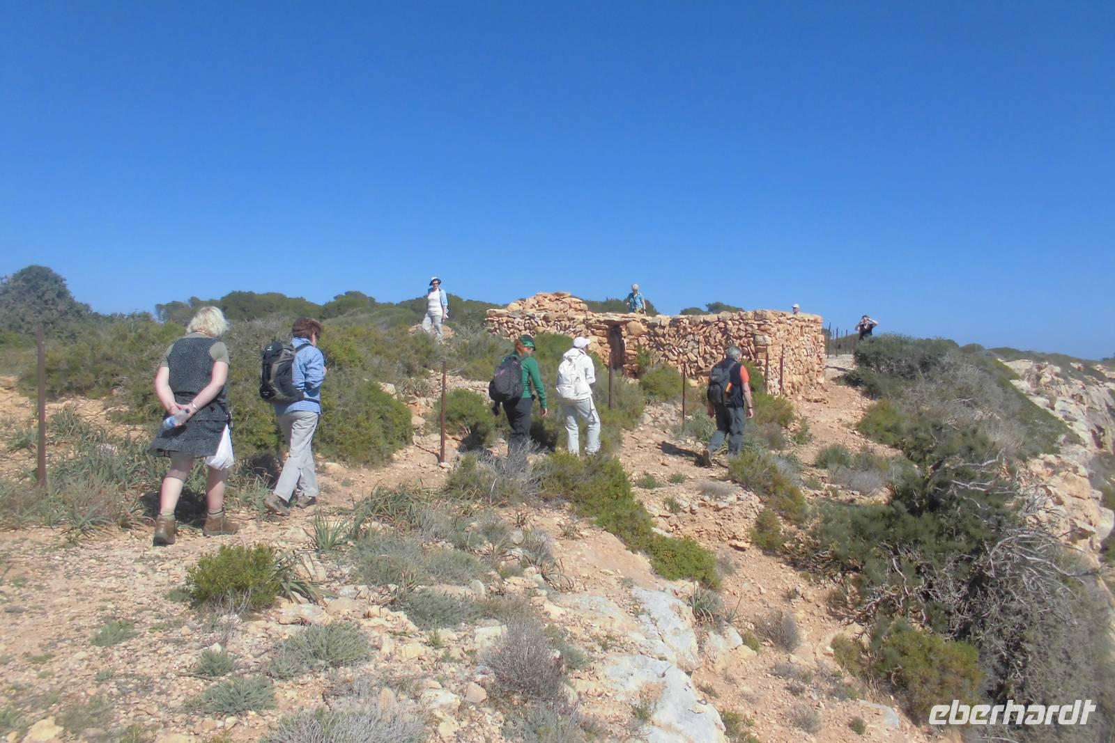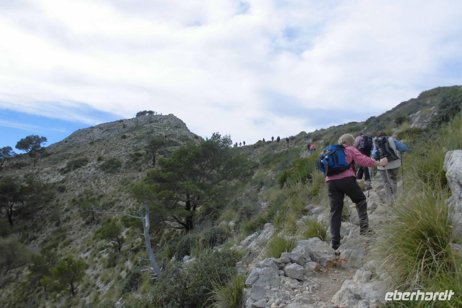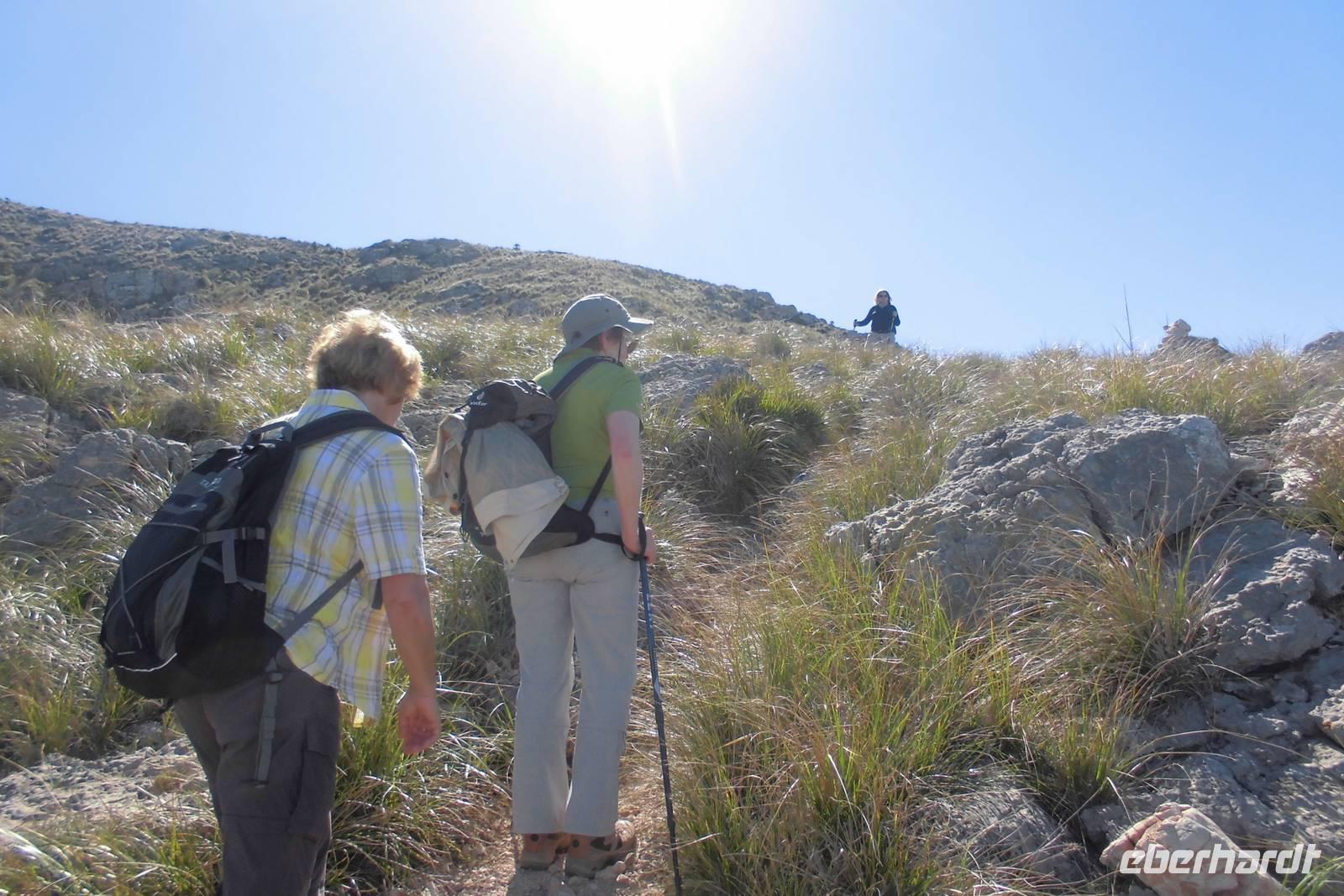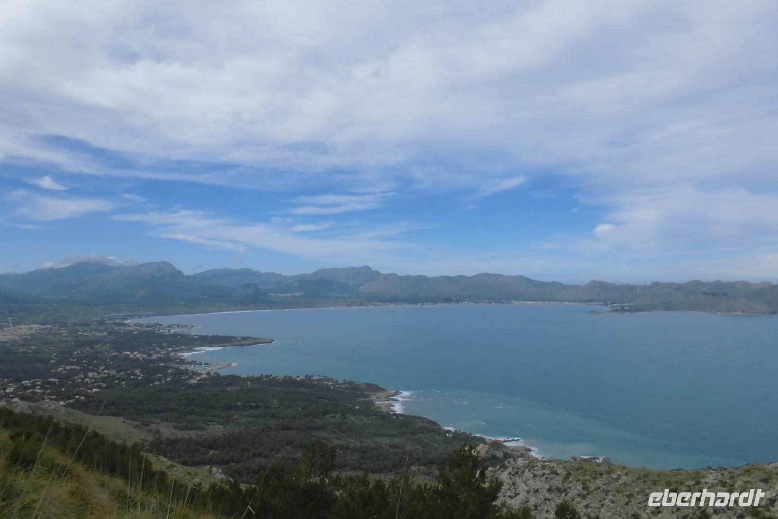 Unsere Fahrt führt uns weiter gen Norden auf die Halbinsel Alcúdia. Isabèl zeigt uns unterwegs „Ihre" Badestellen - echte Geheimtipps. Der Bus schlängelt sich entlang der Serpentinen immer weiter nach oben, bis wir nach einer kurzweiligen Fahrt die Ermita de la Victòria erreichen - den Anfangspunkt unserer heutigen Wanderung. Nachdem wir kurz in eine kleine Heiratskapelle lugen, beginnt der erste Teil des Anstieges. Der breite Weg führt uns durch ein kleines Kiefernwäldchen. Hier und da machen wir halt und lassen uns von Isabèl die hier typische Flora erklären. Der Weg wird mit der Zeit etwas flacher und das einzig größe Hindernis ist ein kleiner Zaun, über den wir alle natürlich sportlich drüber klettern. Die Kiefern werden links und rechts weniger, sodass wir bald nur noch an Sträuchern vorbei wandern. Bald schon erkennen wir unser nächstes Tagesziel - die Talaia d'Alcúdia, einen Berggipfel mit den Überresten eines alten Wachturms. Der breite Weg verengt sich nun zusehends zu einem Trampelpfad. Auch die Steigung nimmt wieder merklich zu. Zum Schluss kraxeln wir fast, um den Gipfel zu erreichen. Dafür werden wir mit einem atemberaubenden Rundblick belohnt! Die gesamte Nordostküste Mallorcas liegt uns bei strahlend blauem Himmel zu Füßen. Im Norden das Cap Formentor, im Südosten das Cap Ferrutx, dazwischen jeweils die Bucht von Pollença und die Bucht von Alcúdia. Um diesen traumhaften Ausblick so lange wie möglich genießen zu können, beschließen wir, hier oben unser Picknick zu machen - ein spanischer Wein zum Anstoßen ist da natürlich obligatorisch! Umso schwerfälliger sind dann auch die ersten Meter abwärts. Erstaunt und auch etwas kopfschüttlend machen wir kurzer Zeit später ein paar jungen Männern platz, die ihre Mountainbikes auf den Gipfel tragen, nur, um wenig später auf selbigen über den schmalen Weg und die Schottersteine wieder bergab zu fahren. Ab und an schauen wir uns noch um und blicken doch ungläubig den Sportlern hinterher. Natürlich bevorzugen wir weiterhin die Fortbewegung per pedes! Langsam wird auch unser nun schon bekannter Weg wieder breiter, sodass auch das nächste Etappenziel wieder näher rückt. An der Ermita machen wir erneut eine kleine Pause, bevor wir abermals zu einem weiteren Tagesziel aufbrechen.