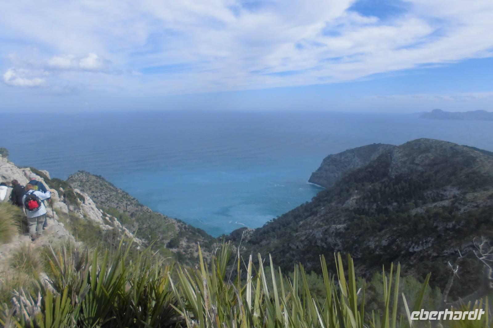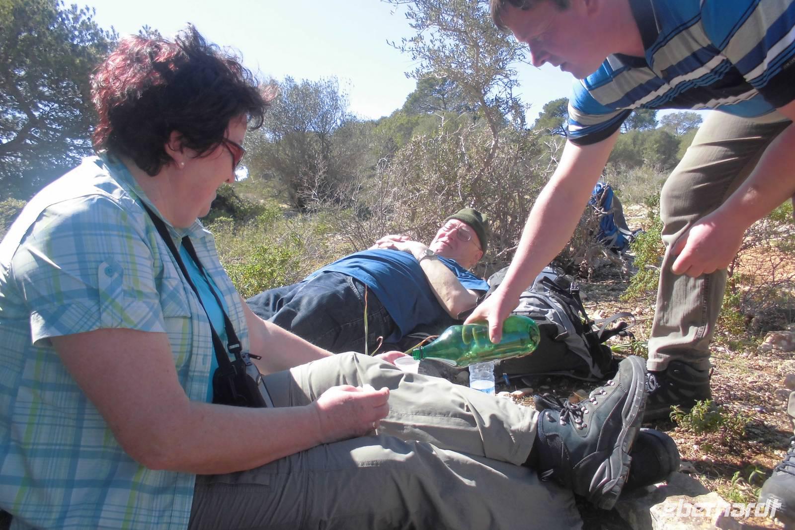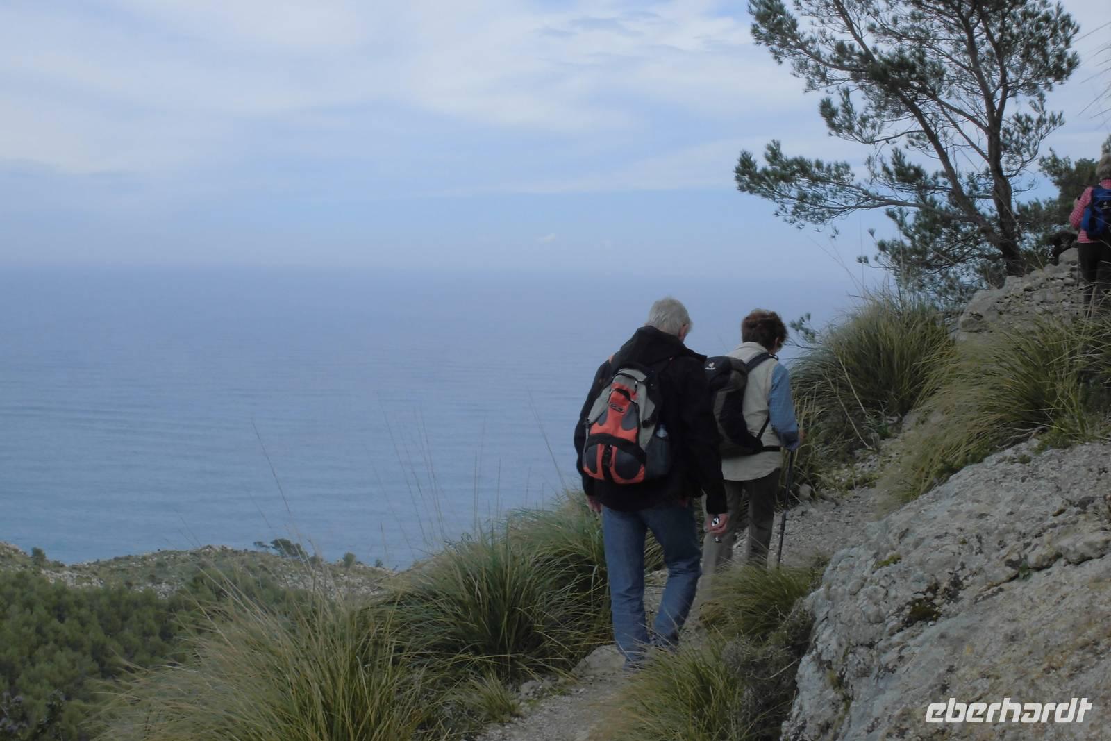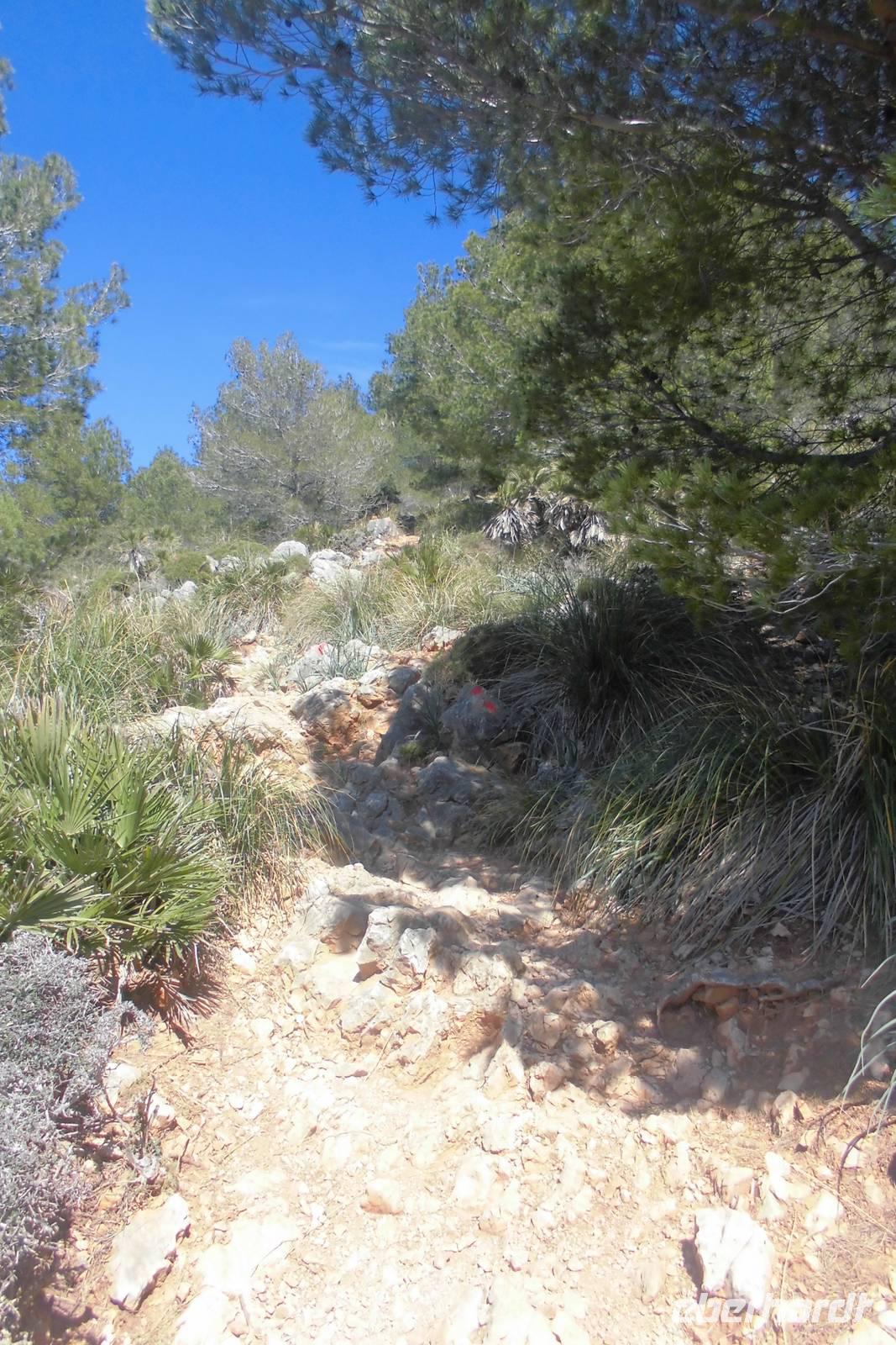Unsere Fahrt führt uns weiter gen Norden auf die Halbinsel Alcúdia. Isabèl zeigt uns unterwegs „Ihre" Badestellen - echte Geheimtipps. Der Bus schlängelt sich entlang der Serpentinen immer weiter nach oben, bis wir nach einer kurzweiligen Fahrt die Ermita de la Victòria erreichen - den Anfangspunkt unserer heutigen Wanderung. Nachdem wir kurz in eine kleine Heiratskapelle lugen, beginnt der erste Teil des Anstieges. Der breite Weg führt uns durch ein kleines Kiefernwäldchen. Hier und da machen wir halt und lassen uns von Isabèl die hier typische Flora erklären. Der Weg wird mit der Zeit etwas flacher und das einzig größe Hindernis ist ein kleiner Zaun, über den wir alle natürlich sportlich drüber klettern. Die Kiefern werden links und rechts weniger, sodass wir bald nur noch an Sträuchern vorbei wandern. Bald schon erkennen wir unser nächstes Tagesziel - die Talaia d'Alcúdia, einen Berggipfel mit den Überresten eines alten Wachturms. Der breite Weg verengt sich nun zusehends zu einem Trampelpfad. Auch die Steigung nimmt wieder merklich zu. Zum Schluss kraxeln wir fast, um den Gipfel zu erreichen. Dafür werden wir mit einem atemberaubenden Rundblick belohnt! Die gesamte Nordostküste Mallorcas liegt uns bei strahlend blauem Himmel zu Füßen. Im Norden das Cap Formentor, im Südosten das Cap Ferrutx, dazwischen jeweils die Bucht von Pollença und die Bucht von Alcúdia. Um diesen traumhaften Ausblick so lange wie möglich genießen zu können, beschließen wir, hier oben unser Picknick zu machen - ein spanischer Wein zum Anstoßen ist da natürlich obligatorisch! Umso schwerfälliger sind dann auch die ersten Meter abwärts. Erstaunt und auch etwas kopfschüttlend machen wir kurzer Zeit später ein paar jungen Männern platz, die ihre Mountainbikes auf den Gipfel tragen, nur, um wenig später auf selbigen über den schmalen Weg und die Schottersteine wieder bergab zu fahren. Ab und an schauen wir uns noch um und blicken doch ungläubig den Sportlern hinterher. Natürlich bevorzugen wir weiterhin die Fortbewegung per pedes! Langsam wird auch unser nun schon bekannter Weg wieder breiter, sodass auch das nächste Etappenziel wieder näher rückt. An der Ermita machen wir erneut eine kleine Pause, bevor wir abermals zu einem weiteren Tagesziel aufbrechen.