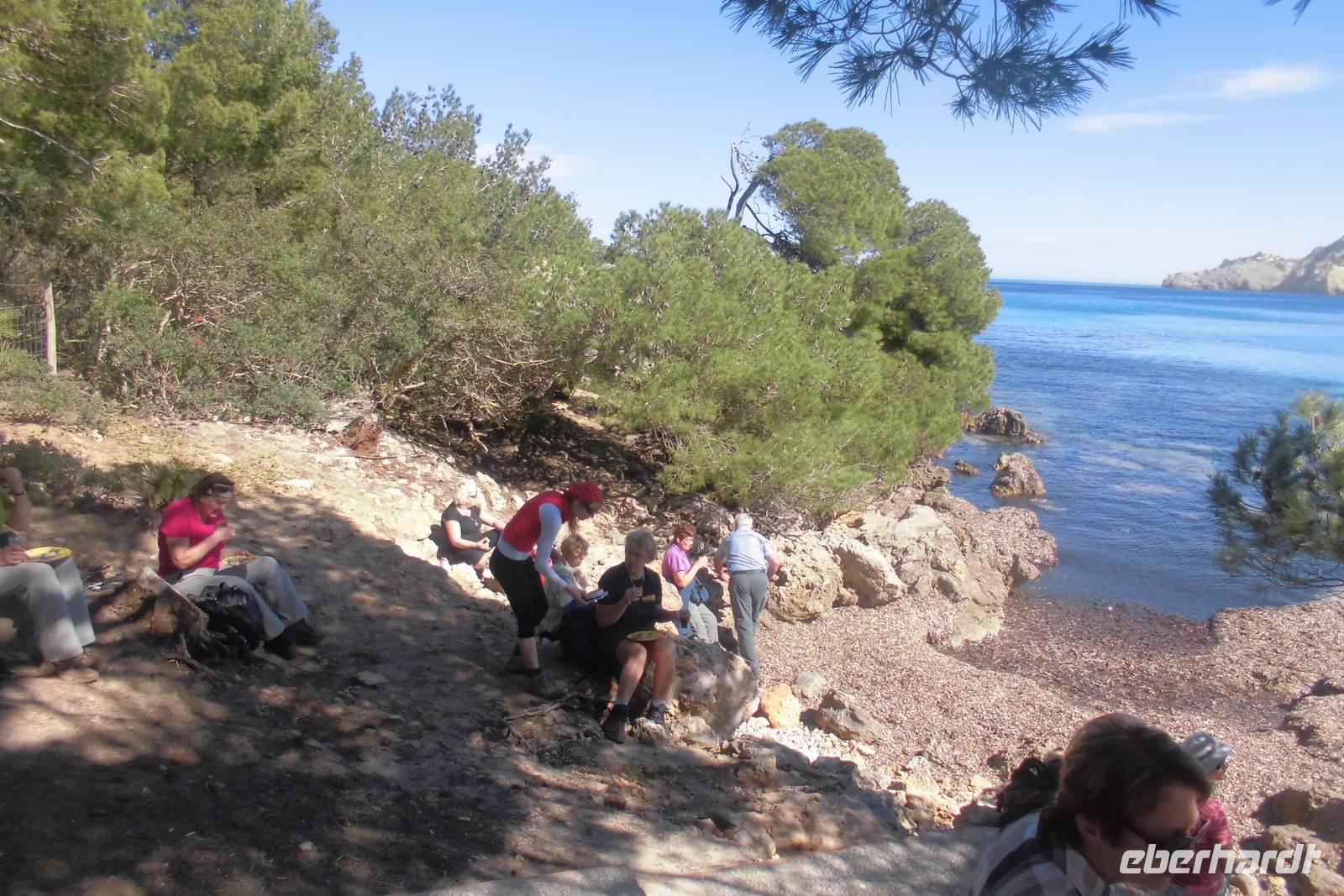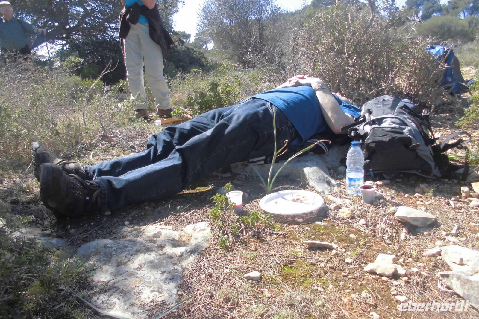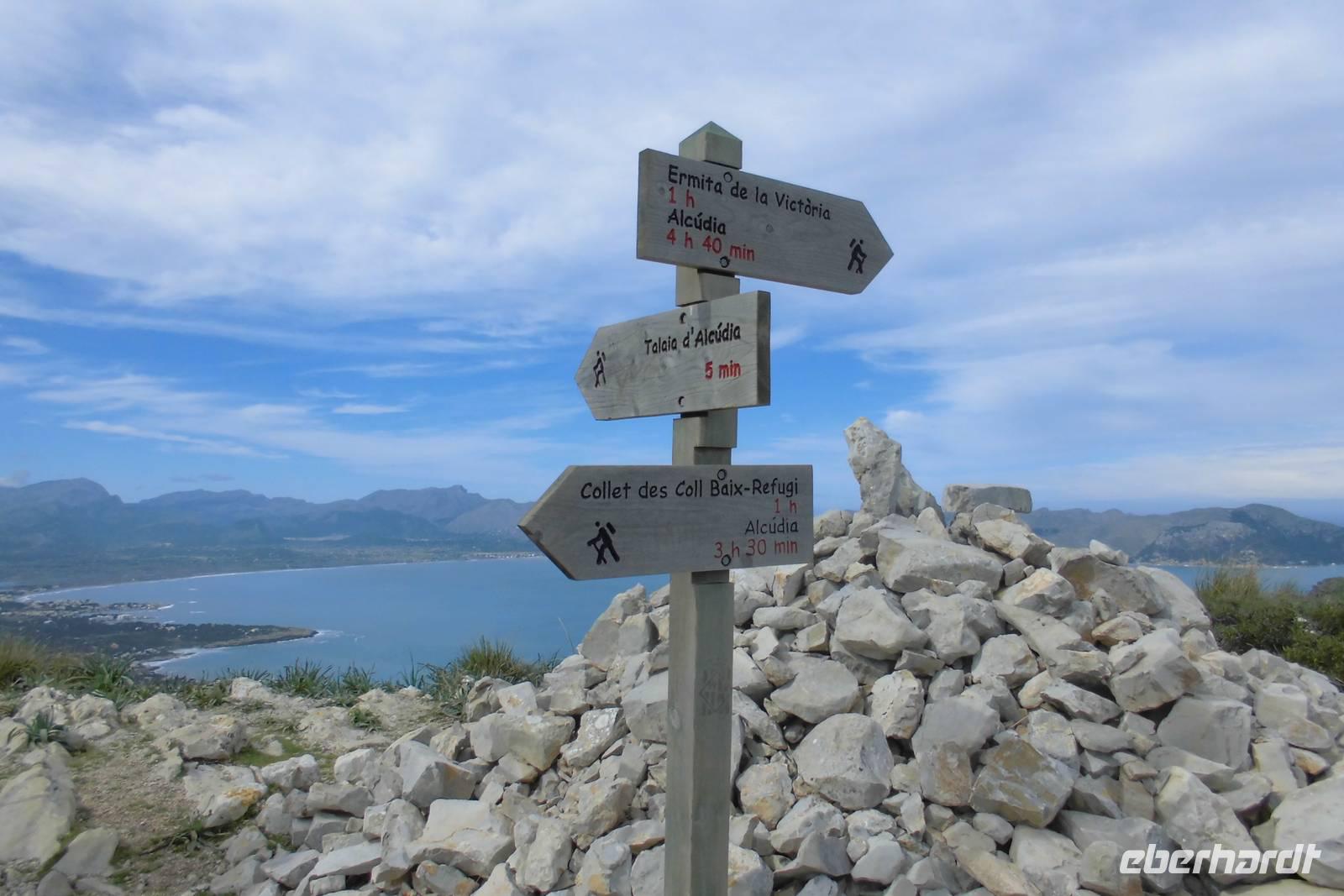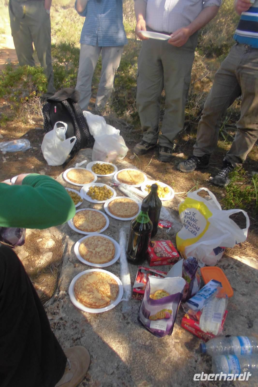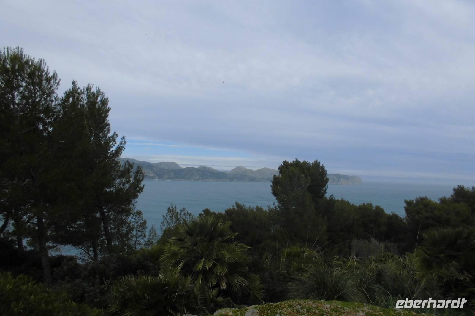 Unsere Fahrt führt uns weiter gen Norden auf die Halbinsel Alcúdia. Isabèl zeigt uns unterwegs „Ihre" Badestellen - echte Geheimtipps. Der Bus schlängelt sich entlang der Serpentinen immer weiter nach oben, bis wir nach einer kurzweiligen Fahrt die Ermita de la Victòria erreichen - den Anfangspunkt unserer heutigen Wanderung. Nachdem wir kurz in eine kleine Heiratskapelle lugen, beginnt der erste Teil des Anstieges. Der breite Weg führt uns durch ein kleines Kiefernwäldchen. Hier und da machen wir halt und lassen uns von Isabèl die hier typische Flora erklären. Der Weg wird mit der Zeit etwas flacher und das einzig größe Hindernis ist ein kleiner Zaun, über den wir alle natürlich sportlich drüber klettern. Die Kiefern werden links und rechts weniger, sodass wir bald nur noch an Sträuchern vorbei wandern. Bald schon erkennen wir unser nächstes Tagesziel - die Talaia d'Alcúdia, einen Berggipfel mit den Überresten eines alten Wachturms. Der breite Weg verengt sich nun zusehends zu einem Trampelpfad. Auch die Steigung nimmt wieder merklich zu. Zum Schluss kraxeln wir fast, um den Gipfel zu erreichen. Dafür werden wir mit einem atemberaubenden Rundblick belohnt! Die gesamte Nordostküste Mallorcas liegt uns bei strahlend blauem Himmel zu Füßen. Im Norden das Cap Formentor, im Südosten das Cap Ferrutx, dazwischen jeweils die Bucht von Pollença und die Bucht von Alcúdia. Um diesen traumhaften Ausblick so lange wie möglich genießen zu können, beschließen wir, hier oben unser Picknick zu machen - ein spanischer Wein zum Anstoßen ist da natürlich obligatorisch! Umso schwerfälliger sind dann auch die ersten Meter abwärts. Erstaunt und auch etwas kopfschüttlend machen wir kurzer Zeit später ein paar jungen Männern platz, die ihre Mountainbikes auf den Gipfel tragen, nur, um wenig später auf selbigen über den schmalen Weg und die Schottersteine wieder bergab zu fahren. Ab und an schauen wir uns noch um und blicken doch ungläubig den Sportlern hinterher. Natürlich bevorzugen wir weiterhin die Fortbewegung per pedes! Langsam wird auch unser nun schon bekannter Weg wieder breiter, sodass auch das nächste Etappenziel wieder näher rückt. An der Ermita machen wir erneut eine kleine Pause, bevor wir abermals zu einem weiteren Tagesziel aufbrechen.