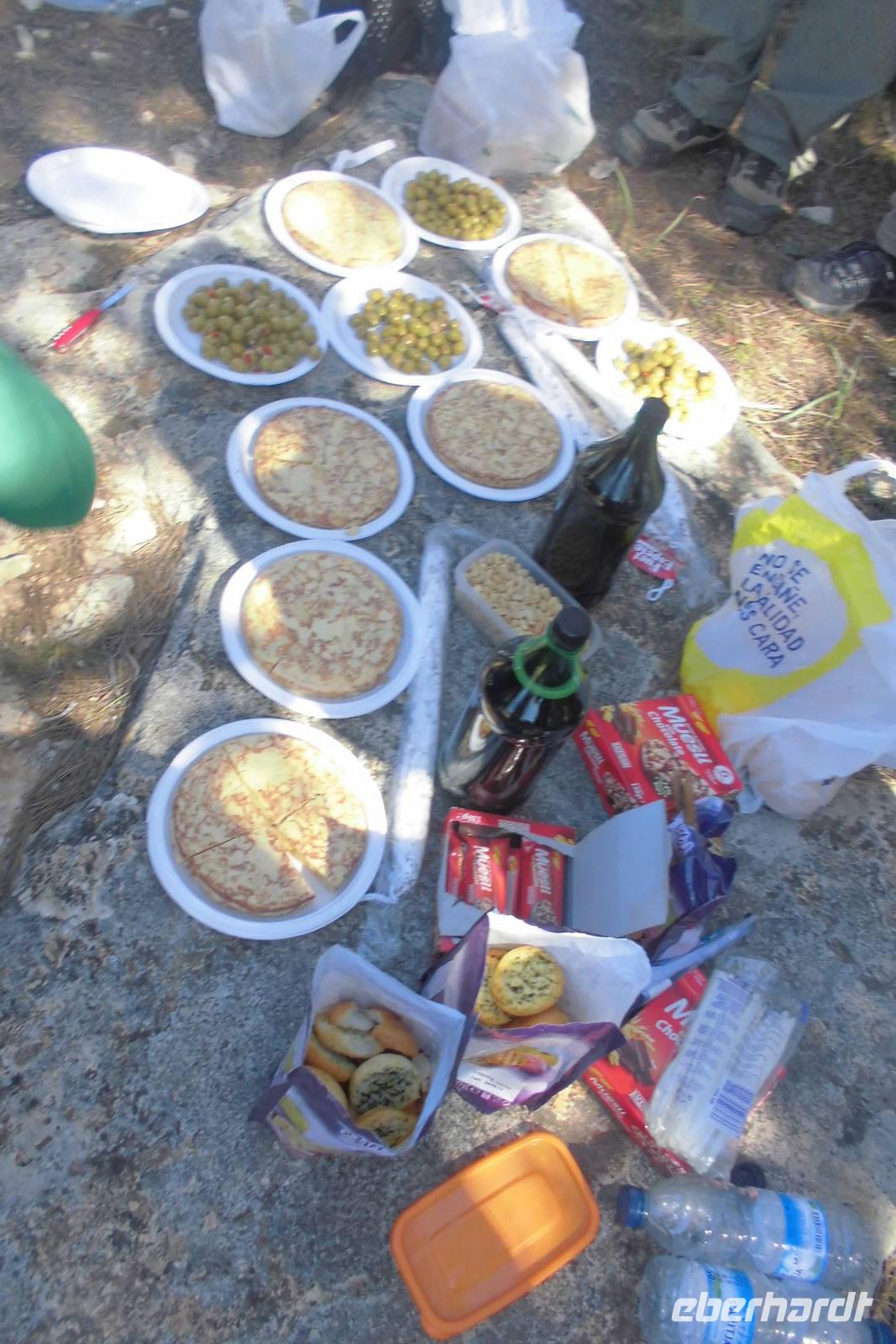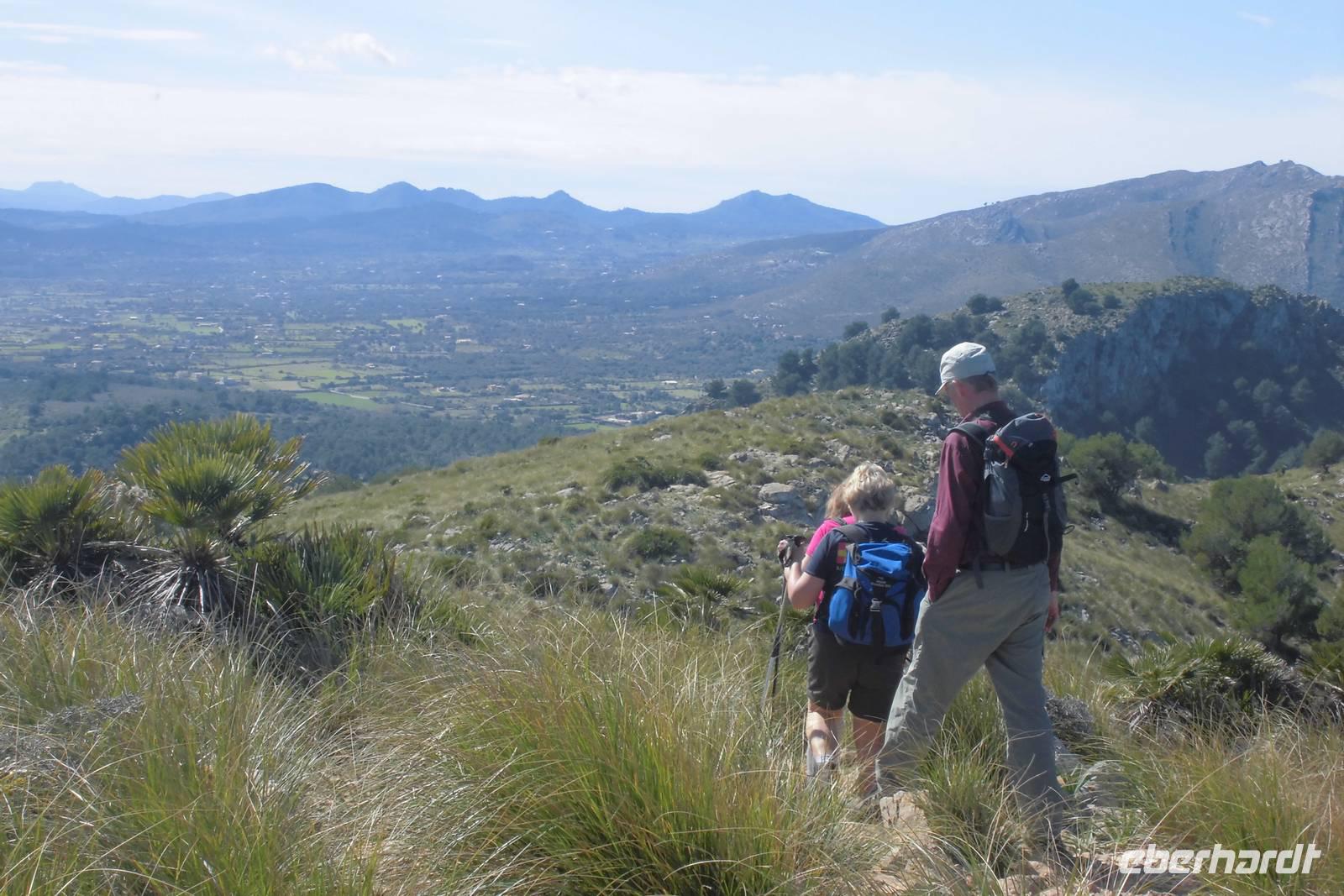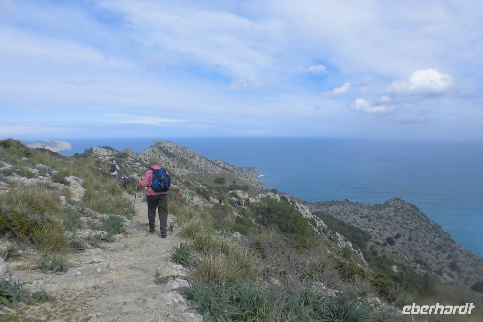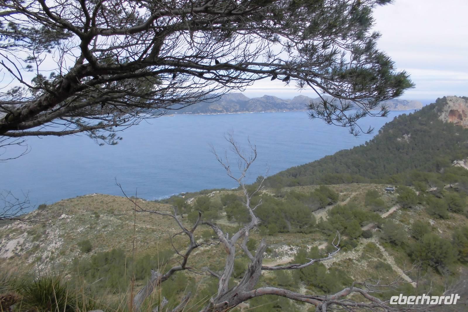 Unsere Fahrt führt uns weiter gen Norden auf die Halbinsel Alcúdia. Isabèl zeigt uns unterwegs „Ihre" Badestellen - echte Geheimtipps. Der Bus schlängelt sich entlang der Serpentinen immer weiter nach oben, bis wir nach einer kurzweiligen Fahrt die Ermita de la Victòria erreichen - den Anfangspunkt unserer heutigen Wanderung. Nachdem wir kurz in eine kleine Heiratskapelle lugen, beginnt der erste Teil des Anstieges. Der breite Weg führt uns durch ein kleines Kiefernwäldchen. Hier und da machen wir halt und lassen uns von Isabèl die hier typische Flora erklären. Der Weg wird mit der Zeit etwas flacher und das einzig größe Hindernis ist ein kleiner Zaun, über den wir alle natürlich sportlich drüber klettern. Die Kiefern werden links und rechts weniger, sodass wir bald nur noch an Sträuchern vorbei wandern. Bald schon erkennen wir unser nächstes Tagesziel - die Talaia d'Alcúdia, einen Berggipfel mit den Überresten eines alten Wachturms. Der breite Weg verengt sich nun zusehends zu einem Trampelpfad. Auch die Steigung nimmt wieder merklich zu. Zum Schluss kraxeln wir fast, um den Gipfel zu erreichen. Dafür werden wir mit einem atemberaubenden Rundblick belohnt! Die gesamte Nordostküste Mallorcas liegt uns bei strahlend blauem Himmel zu Füßen. Im Norden das Cap Formentor, im Südosten das Cap Ferrutx, dazwischen jeweils die Bucht von Pollença und die Bucht von Alcúdia. Um diesen traumhaften Ausblick so lange wie möglich genießen zu können, beschließen wir, hier oben unser Picknick zu machen - ein spanischer Wein zum Anstoßen ist da natürlich obligatorisch! Umso schwerfälliger sind dann auch die ersten Meter abwärts. Erstaunt und auch etwas kopfschüttlend machen wir kurzer Zeit später ein paar jungen Männern platz, die ihre Mountainbikes auf den Gipfel tragen, nur, um wenig später auf selbigen über den schmalen Weg und die Schottersteine wieder bergab zu fahren. Ab und an schauen wir uns noch um und blicken doch ungläubig den Sportlern hinterher. Natürlich bevorzugen wir weiterhin die Fortbewegung per pedes! Langsam wird auch unser nun schon bekannter Weg wieder breiter, sodass auch das nächste Etappenziel wieder näher rückt. An der Ermita machen wir erneut eine kleine Pause, bevor wir abermals zu einem weiteren Tagesziel aufbrechen.