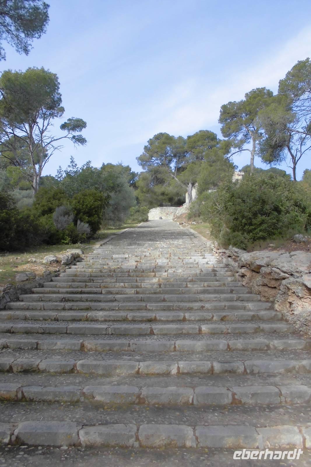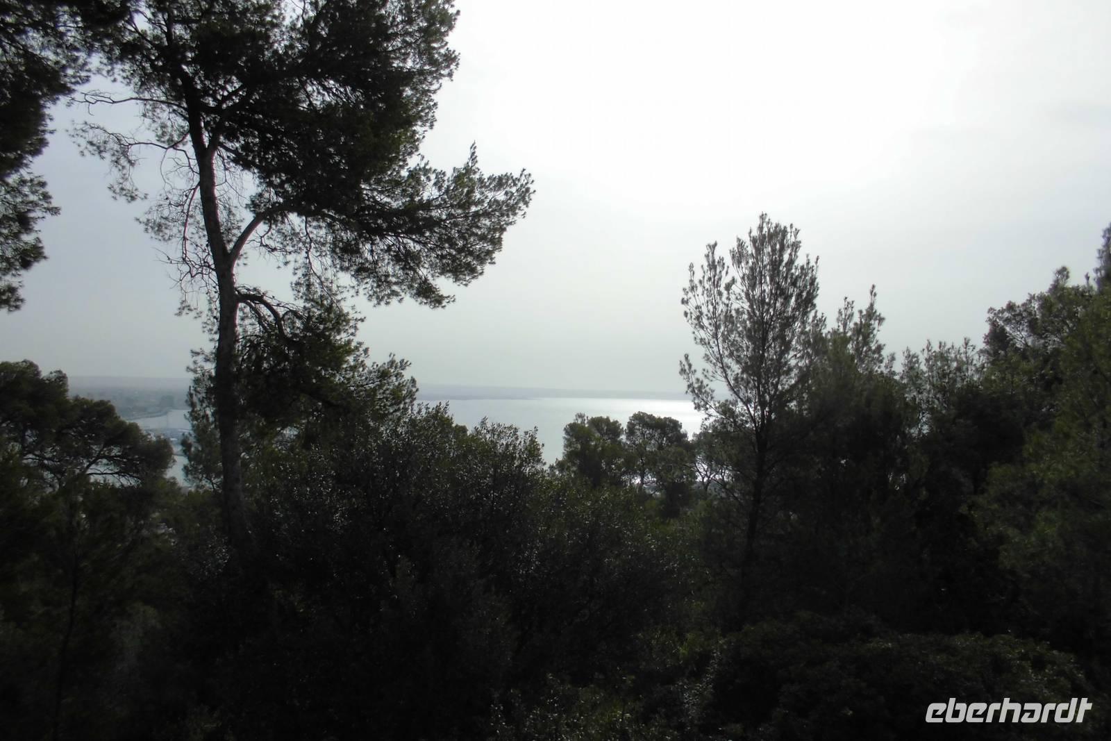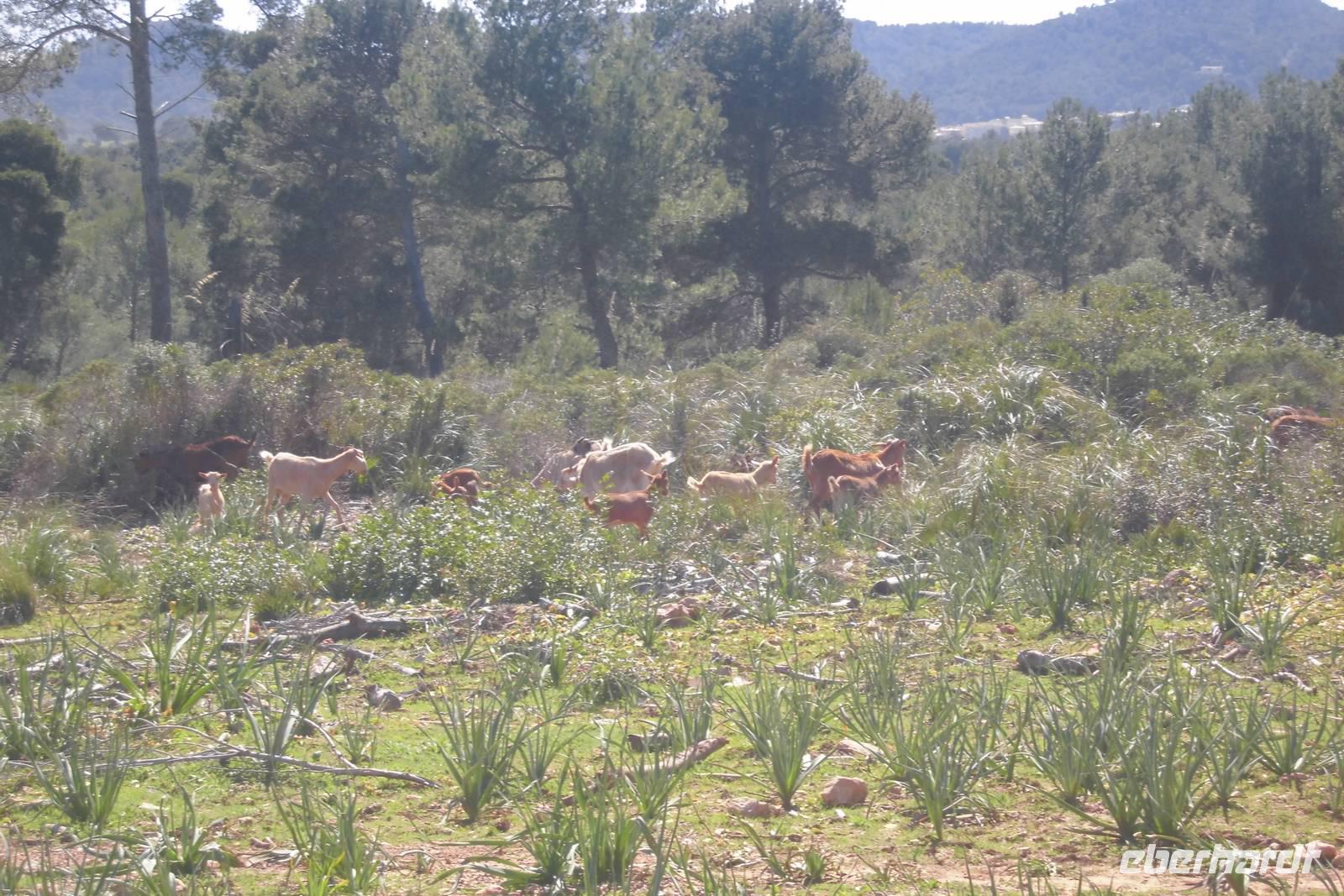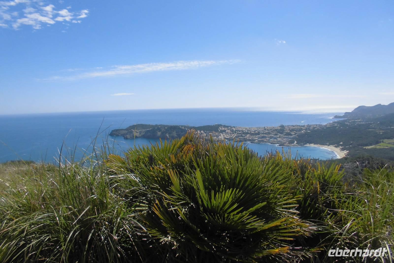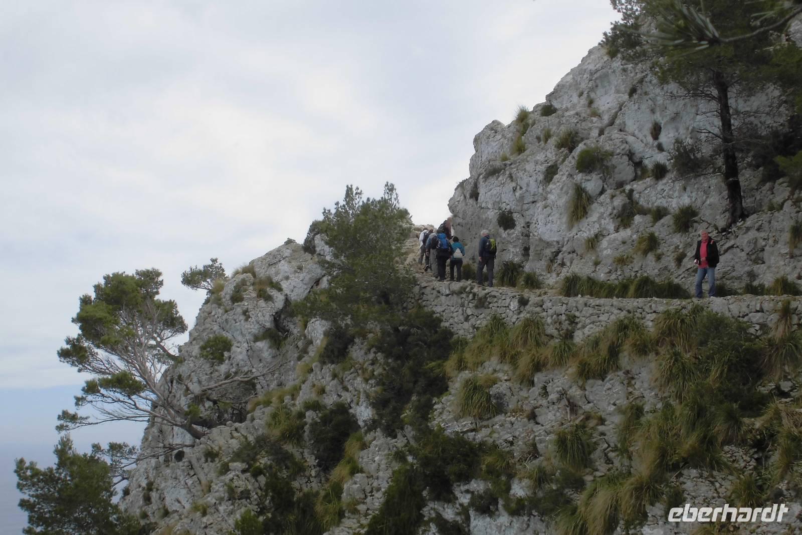 Unsere Fahrt führt uns weiter gen Norden auf die Halbinsel Alcúdia. Isabèl zeigt uns unterwegs „Ihre" Badestellen - echte Geheimtipps. Der Bus schlängelt sich entlang der Serpentinen immer weiter nach oben, bis wir nach einer kurzweiligen Fahrt die Ermita de la Victòria erreichen - den Anfangspunkt unserer heutigen Wanderung. Nachdem wir kurz in eine kleine Heiratskapelle lugen, beginnt der erste Teil des Anstieges. Der breite Weg führt uns durch ein kleines Kiefernwäldchen. Hier und da machen wir halt und lassen uns von Isabèl die hier typische Flora erklären. Der Weg wird mit der Zeit etwas flacher und das einzig größe Hindernis ist ein kleiner Zaun, über den wir alle natürlich sportlich drüber klettern. Die Kiefern werden links und rechts weniger, sodass wir bald nur noch an Sträuchern vorbei wandern. Bald schon erkennen wir unser nächstes Tagesziel - die Talaia d'Alcúdia, einen Berggipfel mit den Überresten eines alten Wachturms. Der breite Weg verengt sich nun zusehends zu einem Trampelpfad. Auch die Steigung nimmt wieder merklich zu. Zum Schluss kraxeln wir fast, um den Gipfel zu erreichen. Dafür werden wir mit einem atemberaubenden Rundblick belohnt! Die gesamte Nordostküste Mallorcas liegt uns bei strahlend blauem Himmel zu Füßen. Im Norden das Cap Formentor, im Südosten das Cap Ferrutx, dazwischen jeweils die Bucht von Pollença und die Bucht von Alcúdia. Um diesen traumhaften Ausblick so lange wie möglich genießen zu können, beschließen wir, hier oben unser Picknick zu machen - ein spanischer Wein zum Anstoßen ist da natürlich obligatorisch! Umso schwerfälliger sind dann auch die ersten Meter abwärts. Erstaunt und auch etwas kopfschüttlend machen wir kurzer Zeit später ein paar jungen Männern platz, die ihre Mountainbikes auf den Gipfel tragen, nur, um wenig später auf selbigen über den schmalen Weg und die Schottersteine wieder bergab zu fahren. Ab und an schauen wir uns noch um und blicken doch ungläubig den Sportlern hinterher. Natürlich bevorzugen wir weiterhin die Fortbewegung per pedes! Langsam wird auch unser nun schon bekannter Weg wieder breiter, sodass auch das nächste Etappenziel wieder näher rückt. An der Ermita machen wir erneut eine kleine Pause, bevor wir abermals zu einem weiteren Tagesziel aufbrechen.