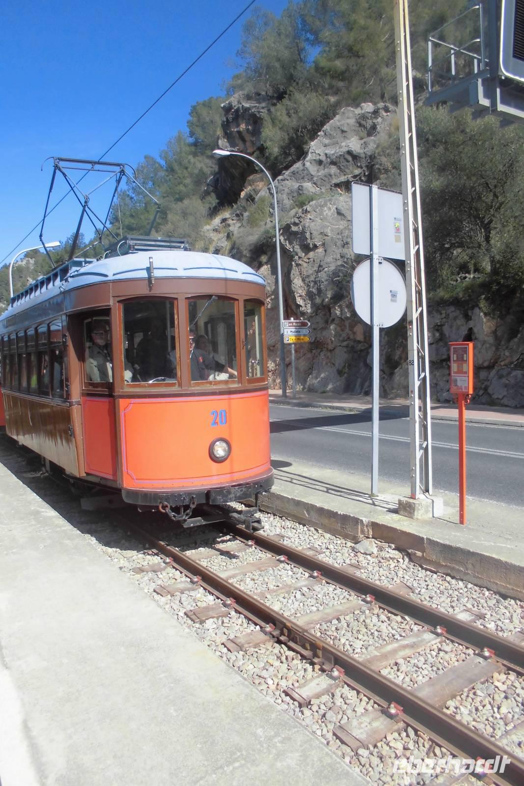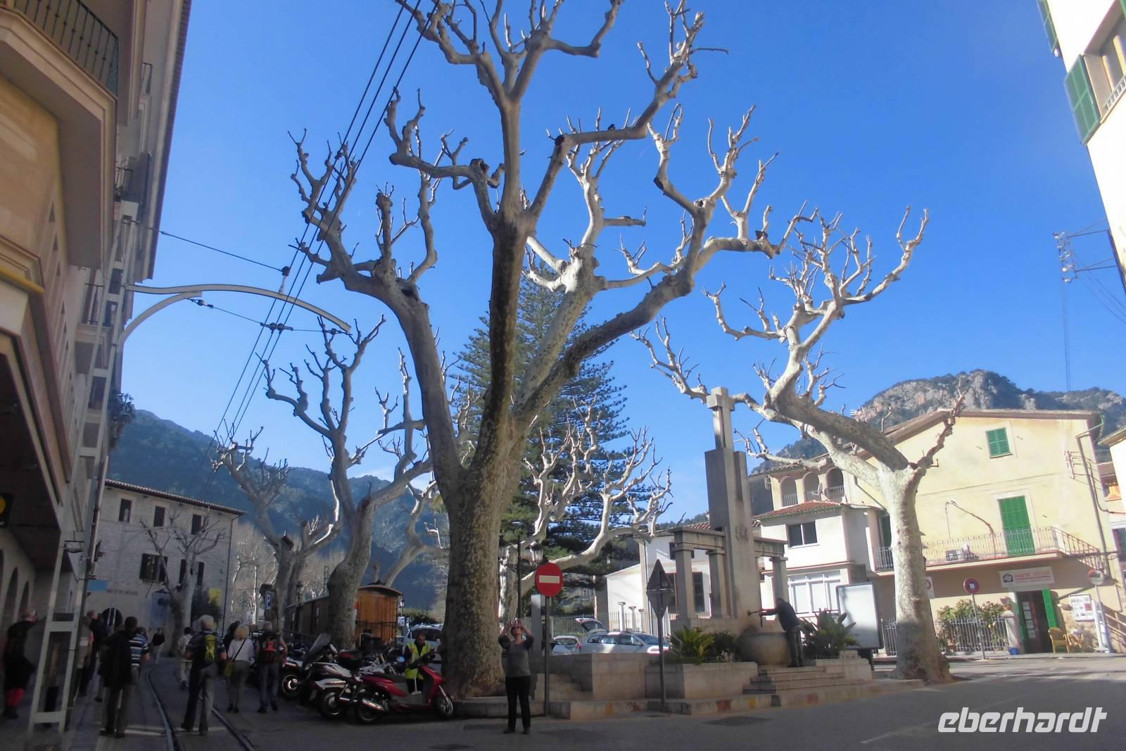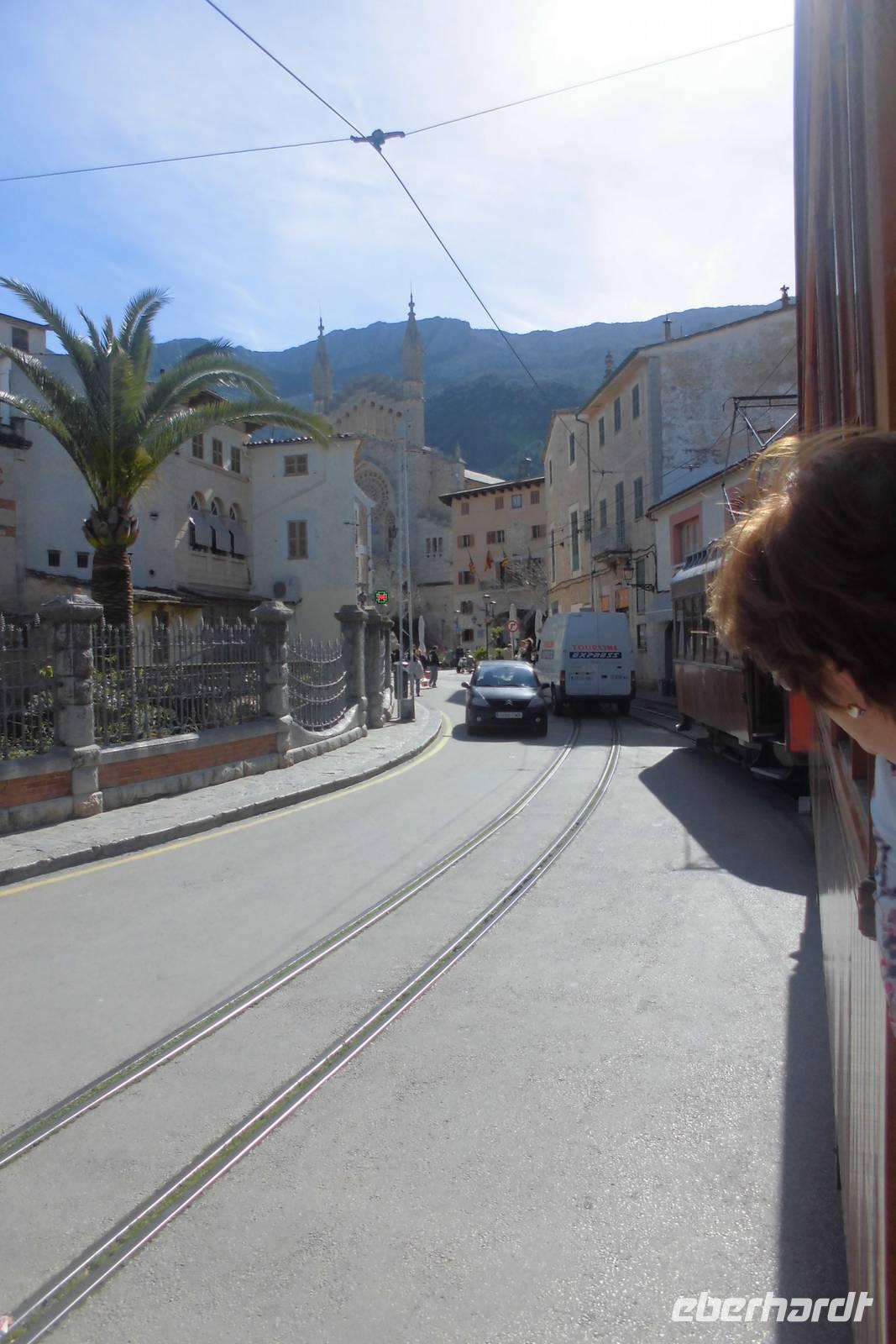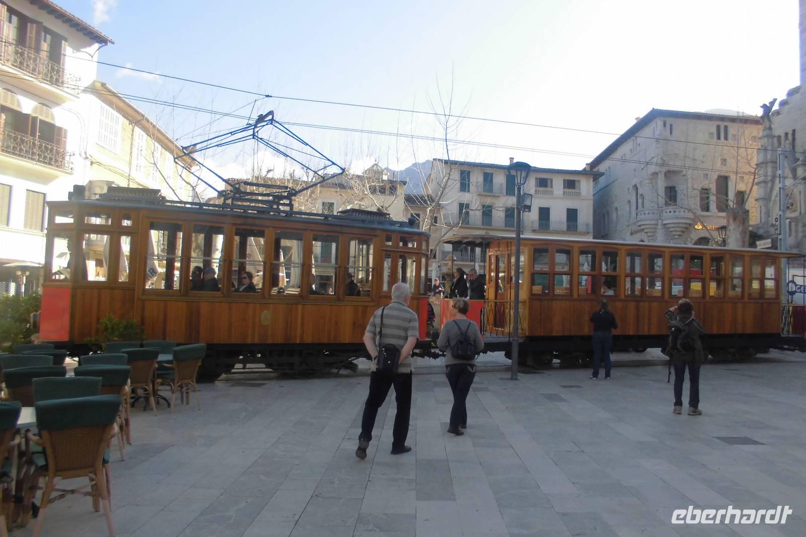 Am heutigen Tag lassen wir die Wanderschuhe mal im Hotel und machen uns auf, per Bus und Tram den Westen Mallorcas zu erkunden. Wir starten mit der uns schon wohlbekannten Busfahrt Richtung Palma, von wo aus es nun ins Tramuntana-Gebirge geht. In Soller, einer kleinen, noch etwas verschlafen wirkenden Stadt machen wir halt und spazieren entlang kleiner Gärten und Haine voller Orangen- und Zitronenbäume. Im Zentrum werden die Strassen immer mehr zu Gassen und am Hauptplatz passieren wir das erste Mal die Schienen der alten Straßenbahn, welche Soller mit Port de Soller verbindet. Im alten Bahnhof der Stadt sehen wir kurz den „Roten Blitz", die berühmte Bahn, welche von hier gen Palma fährt. Wer Lust hat, wirft einen kurzen Blick in das Museum, welches die gemeinsame Zeit von Dalí und Picasso in Soller dokumentiert. Isabèl empfiehlt uns, unbedingt auf dem Markplatz einen frisch gepressten Orangensaft zu trinken - machen wir natürlich und sind begeistert. Wir bummeln noch etwas durch die vielen Souvenirgeschäfte, ehe es vom Bahnhof mit der Tram weitergeht in das Hafenstädtchen Port de Soller. Während der Fahrt mit der urigen Straßenbahn lassen wir uns den frischen Wind um die Nase wehen und genießen die vorbeiziehende Landschaft.
