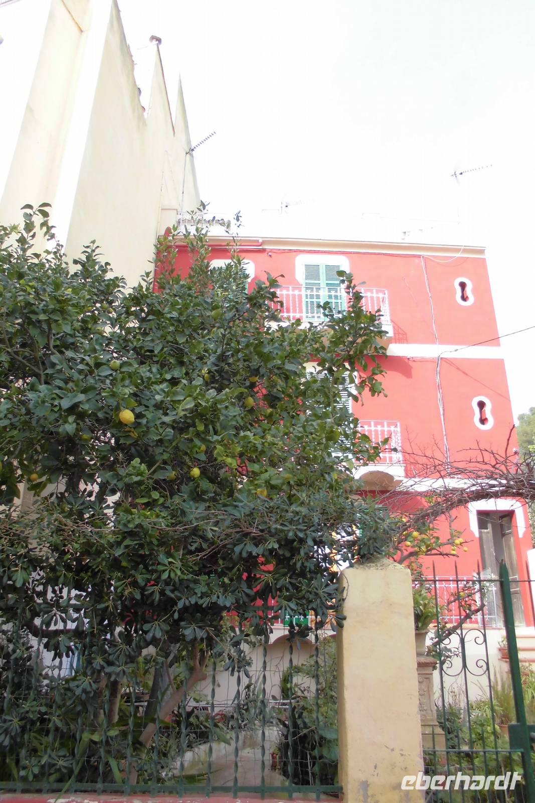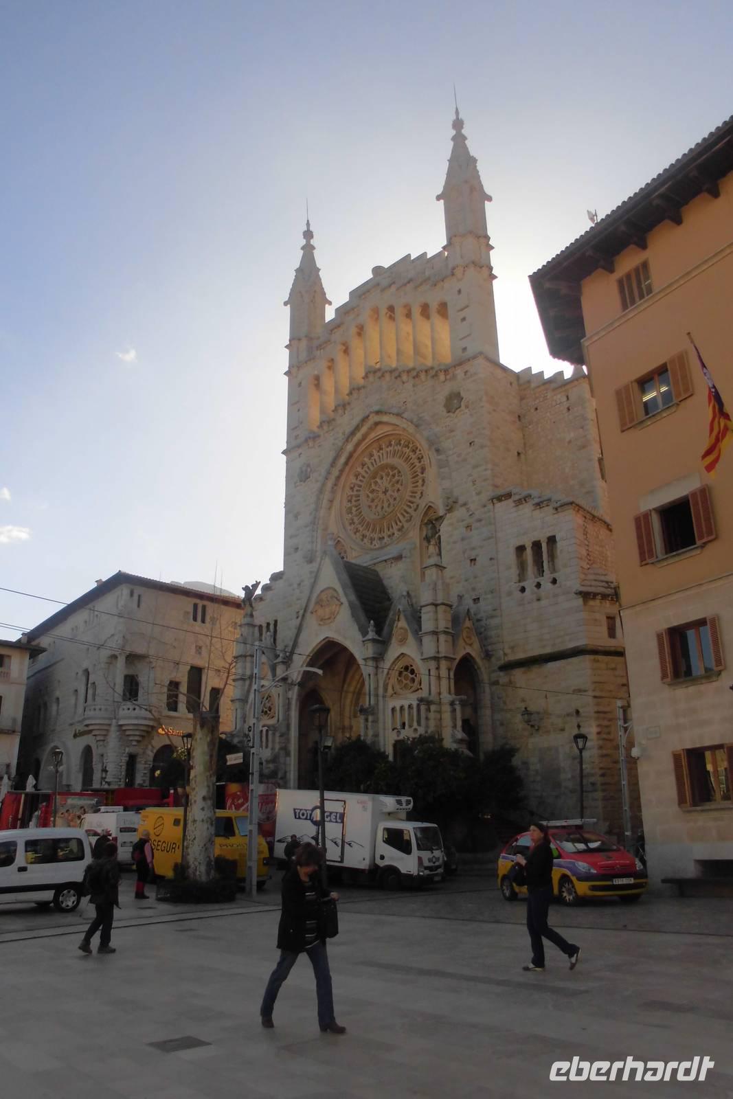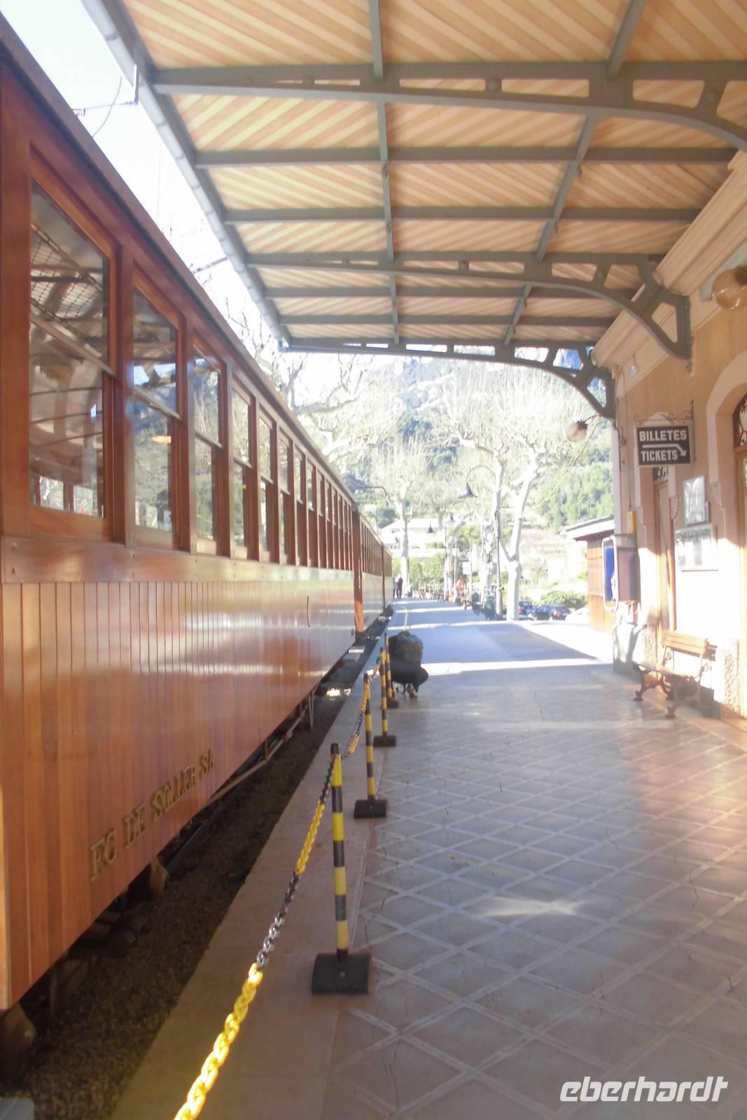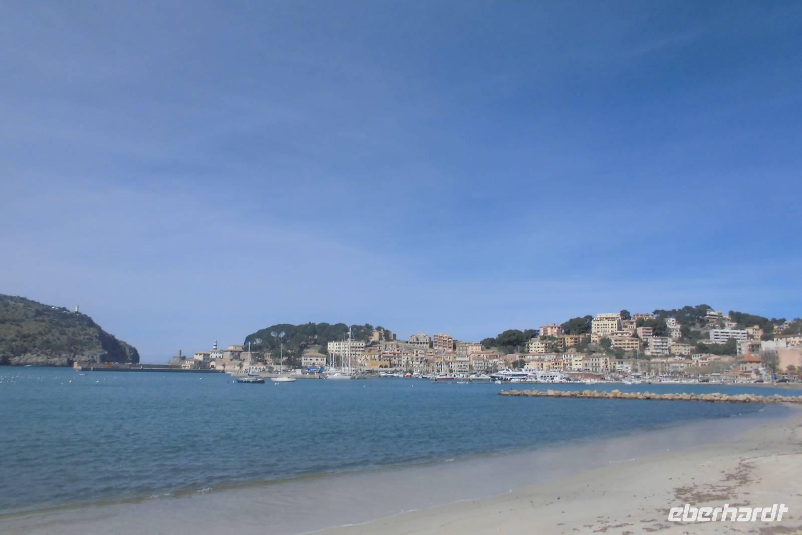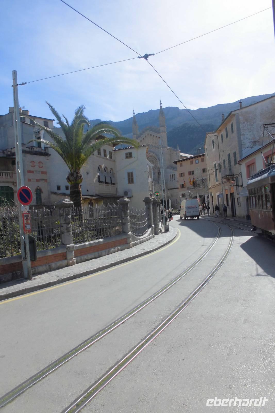 Am heutigen Tag lassen wir die Wanderschuhe mal im Hotel und machen uns auf, per Bus und Tram den Westen Mallorcas zu erkunden. Wir starten mit der uns schon wohlbekannten Busfahrt Richtung Palma, von wo aus es nun ins Tramuntana-Gebirge geht. In Soller, einer kleinen, noch etwas verschlafen wirkenden Stadt machen wir halt und spazieren entlang kleiner Gärten und Haine voller Orangen- und Zitronenbäume. Im Zentrum werden die Strassen immer mehr zu Gassen und am Hauptplatz passieren wir das erste Mal die Schienen der alten Straßenbahn, welche Soller mit Port de Soller verbindet. Im alten Bahnhof der Stadt sehen wir kurz den „Roten Blitz", die berühmte Bahn, welche von hier gen Palma fährt. Wer Lust hat, wirft einen kurzen Blick in das Museum, welches die gemeinsame Zeit von Dalí und Picasso in Soller dokumentiert. Isabèl empfiehlt uns, unbedingt auf dem Markplatz einen frisch gepressten Orangensaft zu trinken - machen wir natürlich und sind begeistert. Wir bummeln noch etwas durch die vielen Souvenirgeschäfte, ehe es vom Bahnhof mit der Tram weitergeht in das Hafenstädtchen Port de Soller. Während der Fahrt mit der urigen Straßenbahn lassen wir uns den frischen Wind um die Nase wehen und genießen die vorbeiziehende Landschaft.
