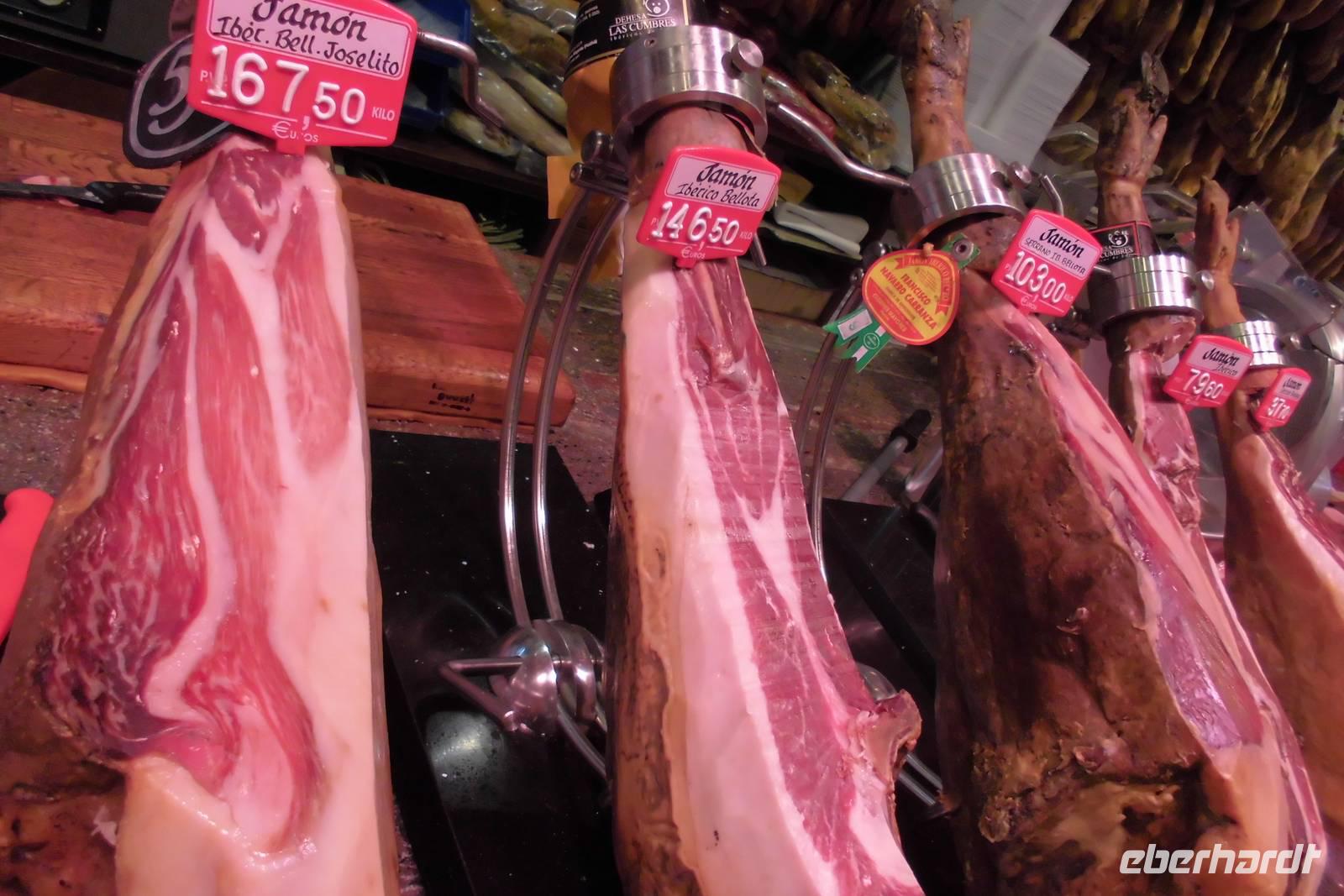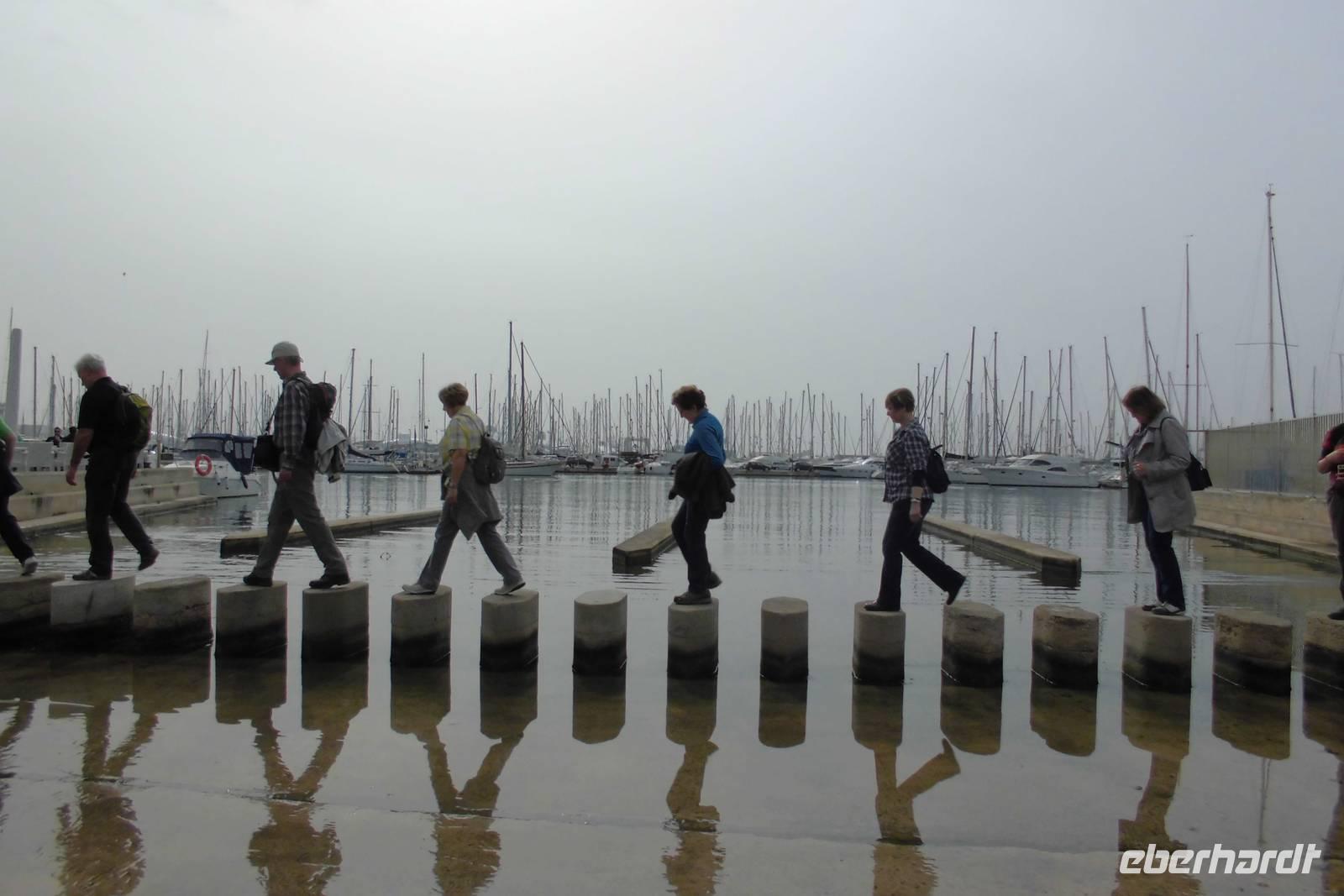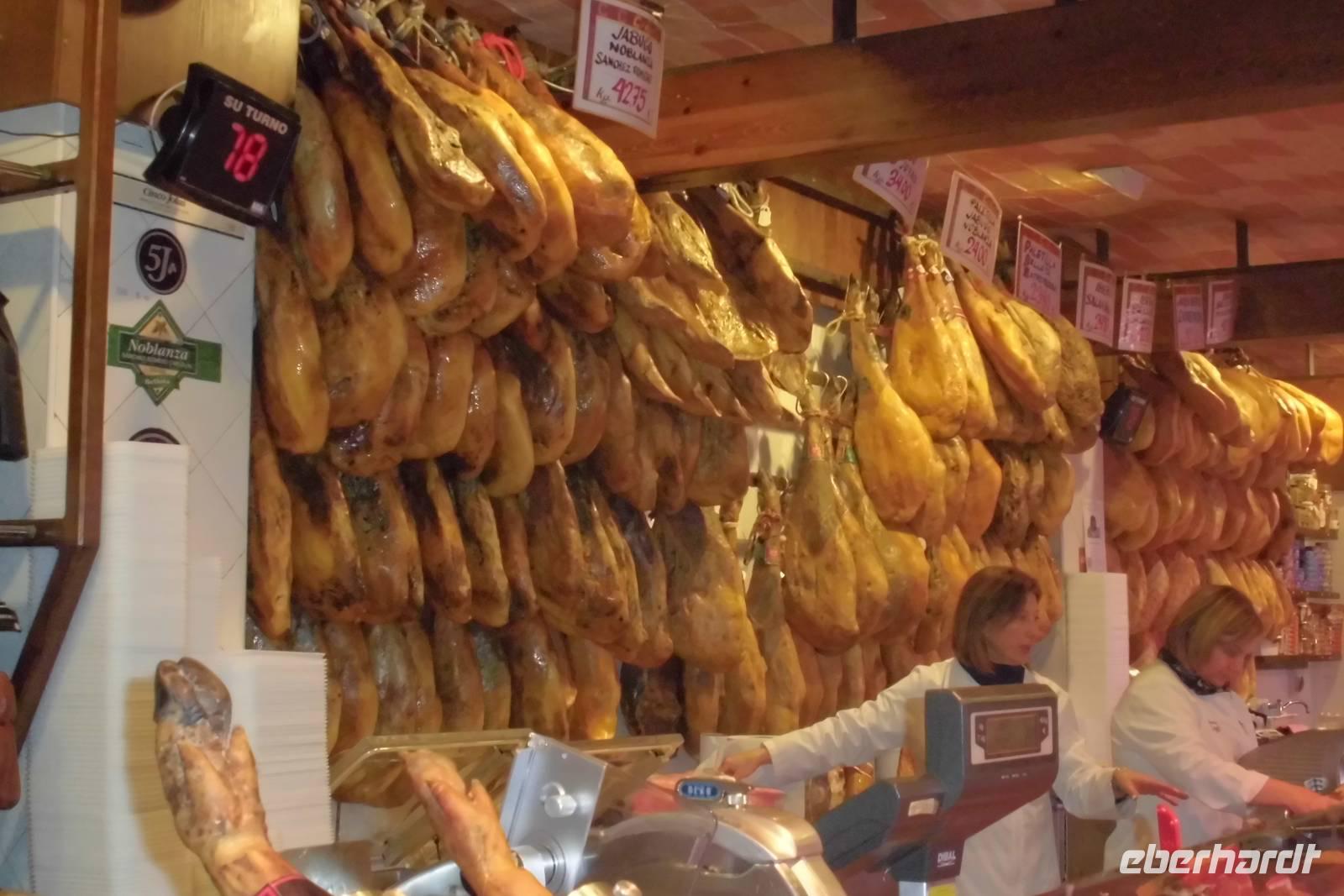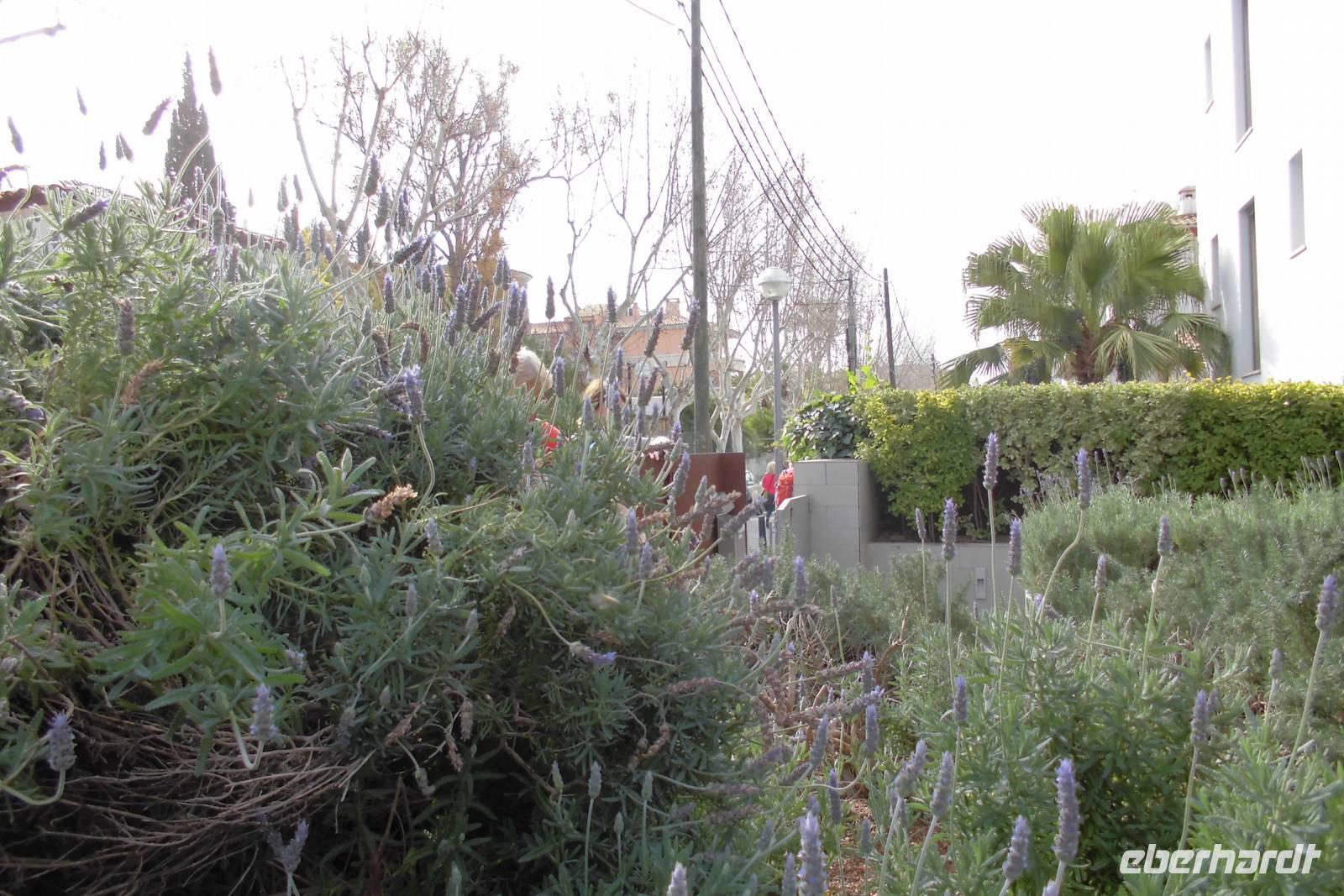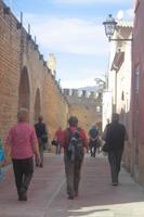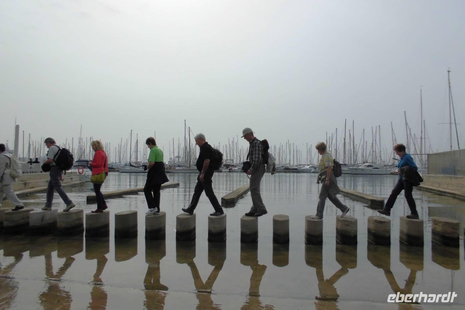 José fährt uns zum Ausgangspunkt unserer heutigen Wanderung, Schloss Bellver. Oberhalb von Palma gelegen, haben wir von hier einen atemberaubenden Ausblick auf Stadt, Hafen und Meer. Der Weg hinunter führt über Treppen. Immer wieder kommen uns Jogger entgegen, hier und da sieht man Einheimische beim Yoga oder bei Fitnessübungen. Wir genießen (noch) die Sonne und gehen heut Alles etwas gemütlicher an. Kurze Stopps sind heut oft an der Tagesordnung, wir schauen neugierig in die immer wieder einzigartig, teilweise wild-romantisch verwachsenen Hinterhöfe und Gärten, bleiben bei Lavendel stehen, der hier mitten in der Stadt wächst. Nachdem uns Isabel durch das Straßengewirr geführt hat, stehen wir auf einmal am Meer. Wir laufen entlang der Passeig Maritim, beobachten, wie kleine und große Boote im Hafen auf den Wellen schaukeln. An einem ganz besonderen Boot halten wir kurz - Isabel zeigt uns stolz „Edith II." - ihr eigenesJ. Vorbei am Almudaina -Palast führt uns unser Weg weiter zur La Rambla, Palmas Einkaufstraße. Es geht hier gemütlich zu, kaum zu glauben, dass hier im Sommer Millionen von Touristen entlang flanieren. Wir laufen durch die engen Gassen einer der ältesten Altstädte Europas, gerade die Damen unserer Gruppe bleiben oftmals vor den Schaufenstern stehen. Zur Mittagszeit erreichen wir den Mercat d'Olivár, eine riesige Markthalle, in der man angefangen bei Fisch über Schinken, Käse, Obst und Gemüse alles frisch erwerben kann. Isabel zeigt uns mallorquinische Spezialitäten wie Sobrasada, Wurst vom schwarzen Schwein. Und da man bekannterweise bei so vielen Leckereien selbst Hunger bekommt, machen wir in einem kleinen Spezialitätenladen im Obergeschosse der Markthalle Mittag. Natürlich gibt es frische Oliven, Snacks mit Sobrasada, Oliven- und Paprikacréme, typisch mallorquinisch belegte Pizza und einheimischen Wein - und wer mag, kann das soeben Gegessene auch gleich käuflich erwerden.