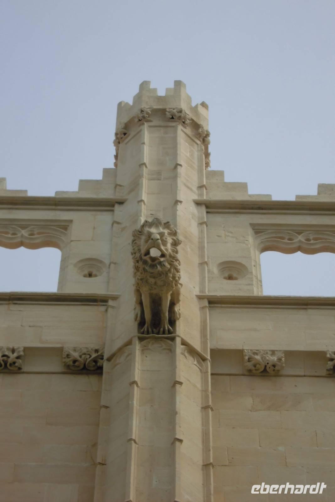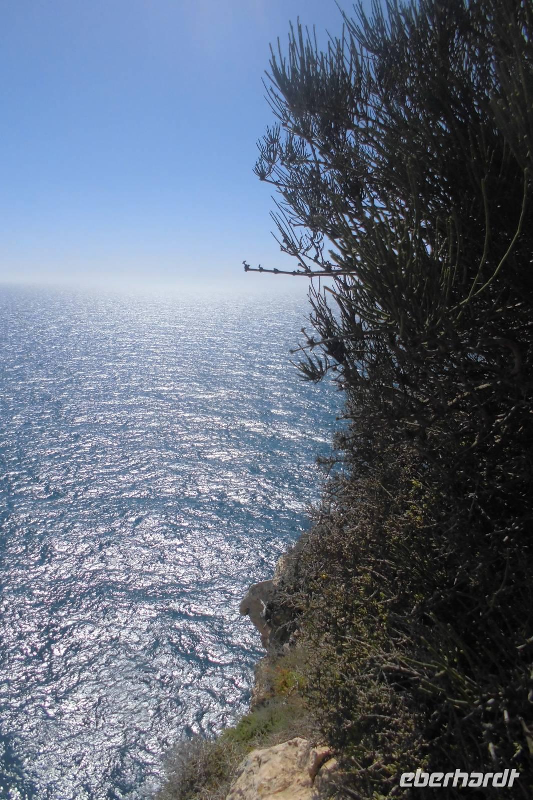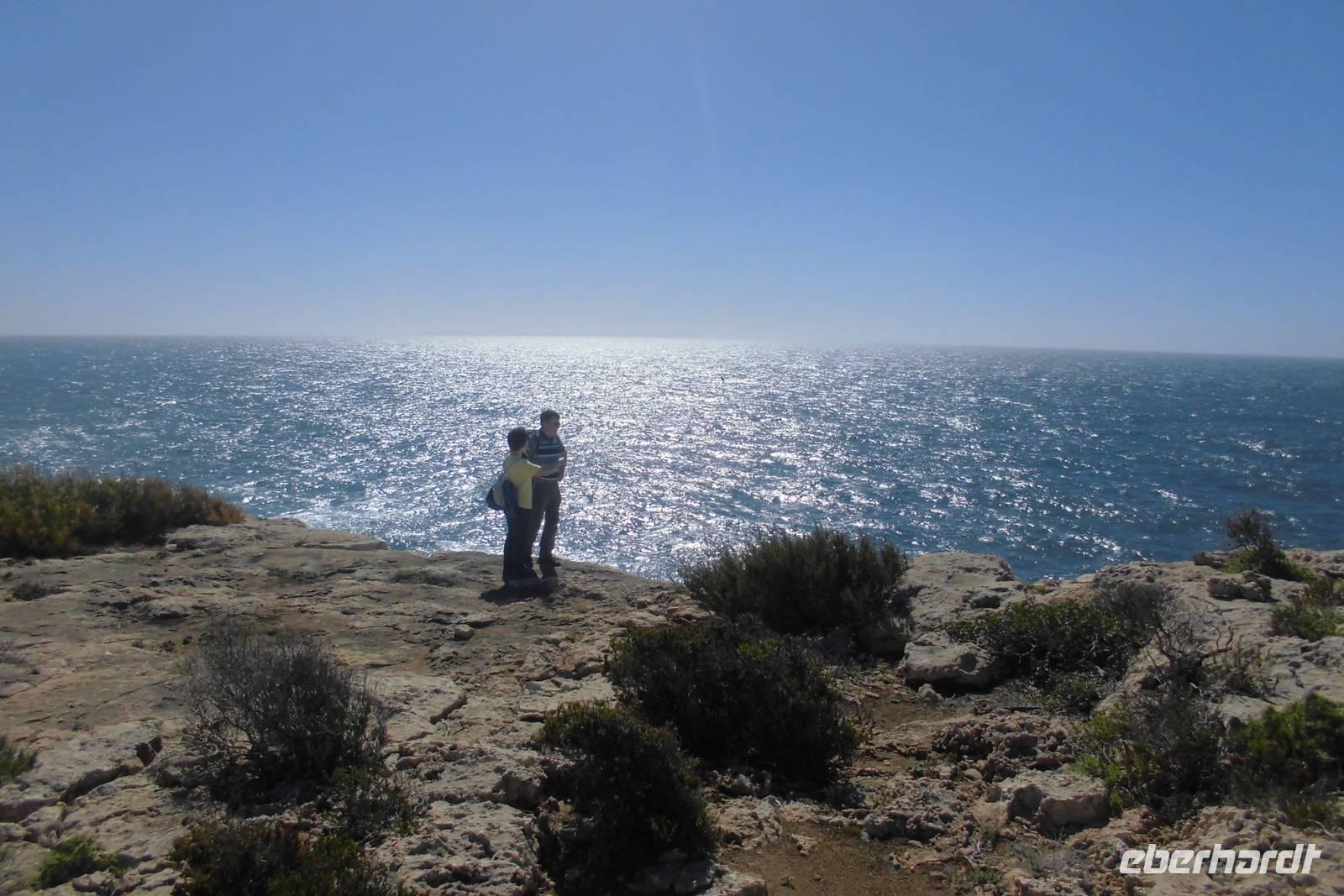 Die Busfahrt führt uns erneut entlang der schroffen Felsküste, unsere Blicke schweifen über die endlose Weite des Mittelmeeres. Auf halber Strecke machen wir halt, um uns San Marriog von oben anzusehen. Von dem Aussichtspunkt blicken wir auf eine Eigenart der Natur. Weit unten haben Wasser und Wind einen Felsen so ausgewaschen, dass man nun mittendurch ein großes Loch erkennen kann. Ein lohnender Fotostopp!