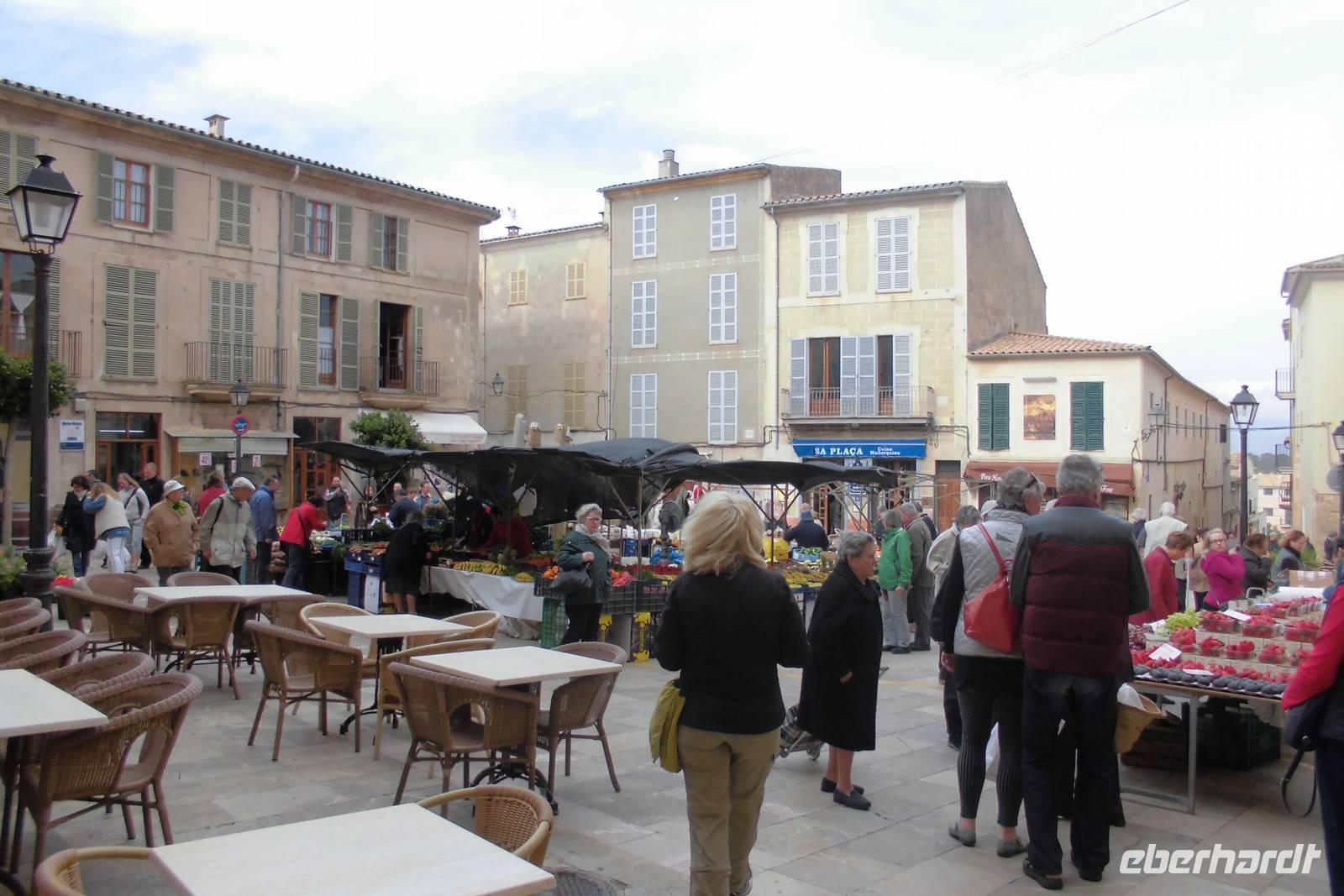 Für den heutigen Tag haben wir uns so einiges vorgenommen. Wir starten eine halbe Stunde früher als gewohnt um mit dem Bus zu unserem ersten Tagesziel zu fahren. Immer mittwochs wird aus dem verschlafenen Sineu ein Anziehungspunkt für Mallorquiner und Touristen gleichermaßen - es ist Markttag! Wir erreichen das kleine Städtchen in der Ebene noch vor dem großen Ansturm, sodass wir Zeit haben, uns die kleinen Stände in Ruhe anzusehen. Anfangs sehen wir eher „un-mallorquinsche" Waren wie Gürtel, Spielsachen und T-Shirts. Isabel führt uns jedoch zu den interessanten Ecken des Marktes. Hier werden noch Tiere wie Hühner, Esel, Tauben und auch kleine Hunde verkauft - für uns als Touristen ein etwas gewöhnungsbedürftiger Anblick, für die Inselbewohner Alltag. Wir suchen uns unseren Weg durch die engen Gassen, vorbei an Obst- und Gemüseständen, Süßwarenhändlern und kleinen Schmuckständen. Vor der kleinen Kirche des Ortes machen wir halt, genießen die Sonne und beobachten das geschäftige Treiben. Da wir heute aber auch noch wandern wollen, bleibt nicht allzu viel Zeit und so machen wir uns bald wieder auf zum Bus, wo José schon auf uns wartet.