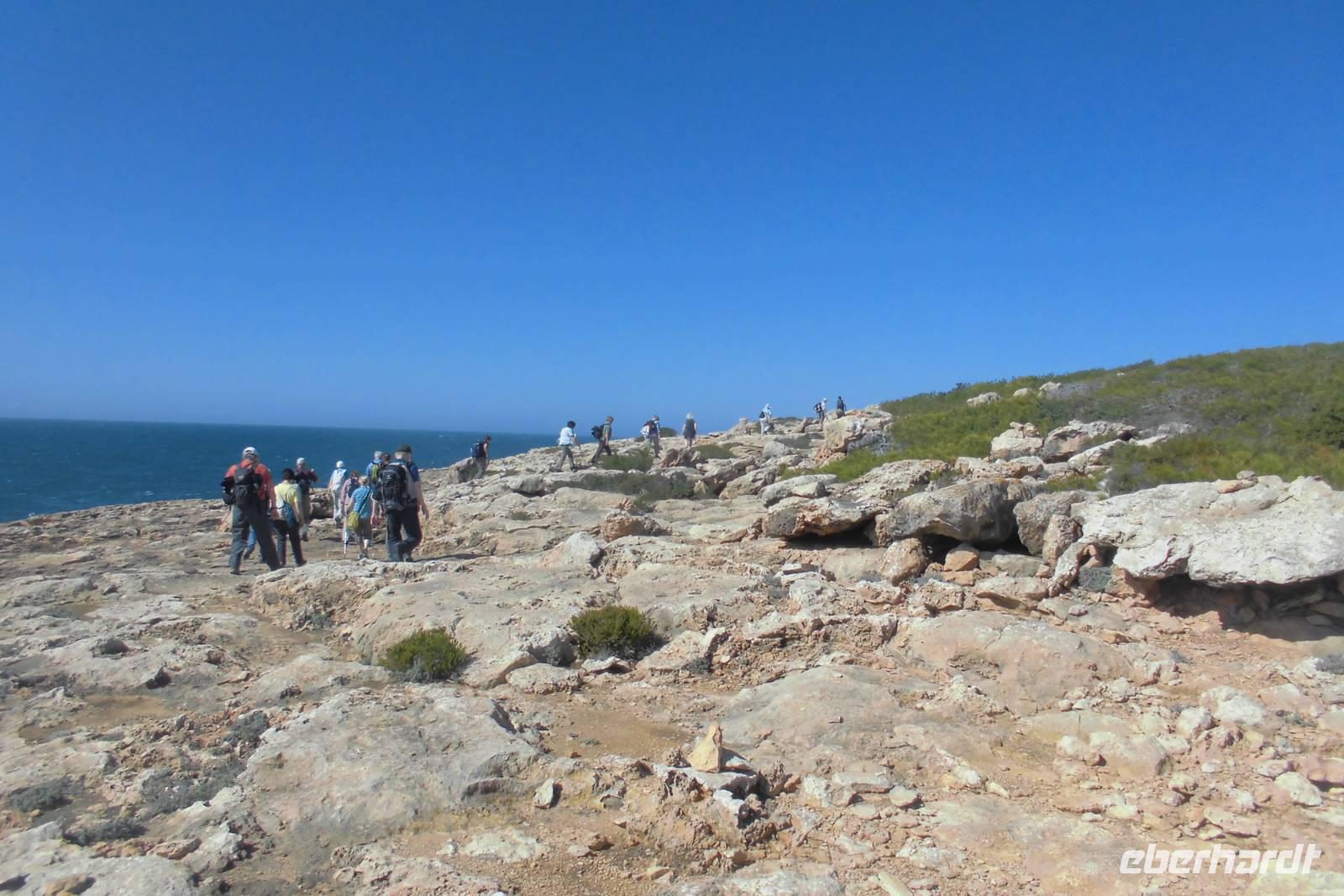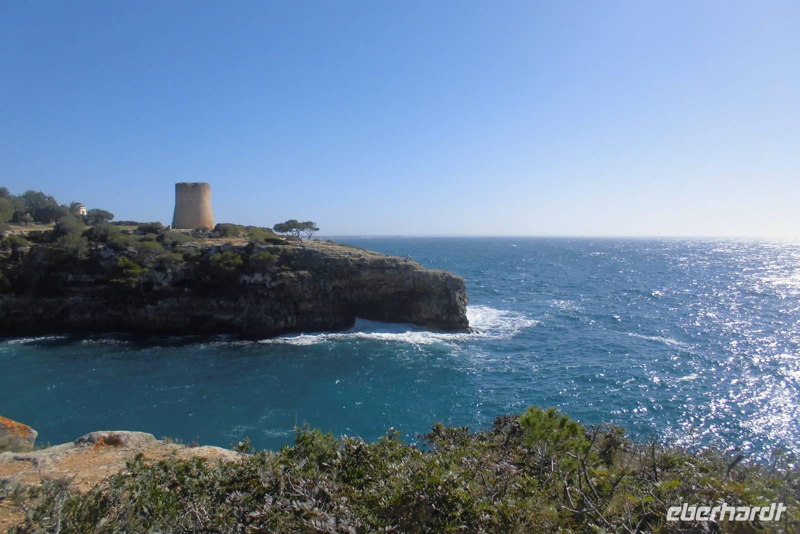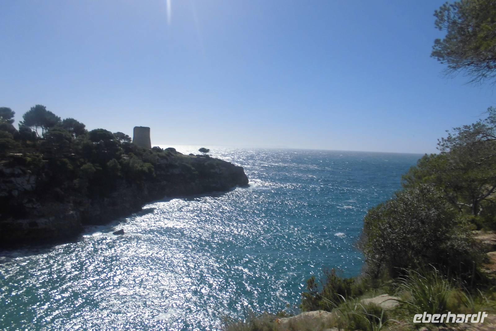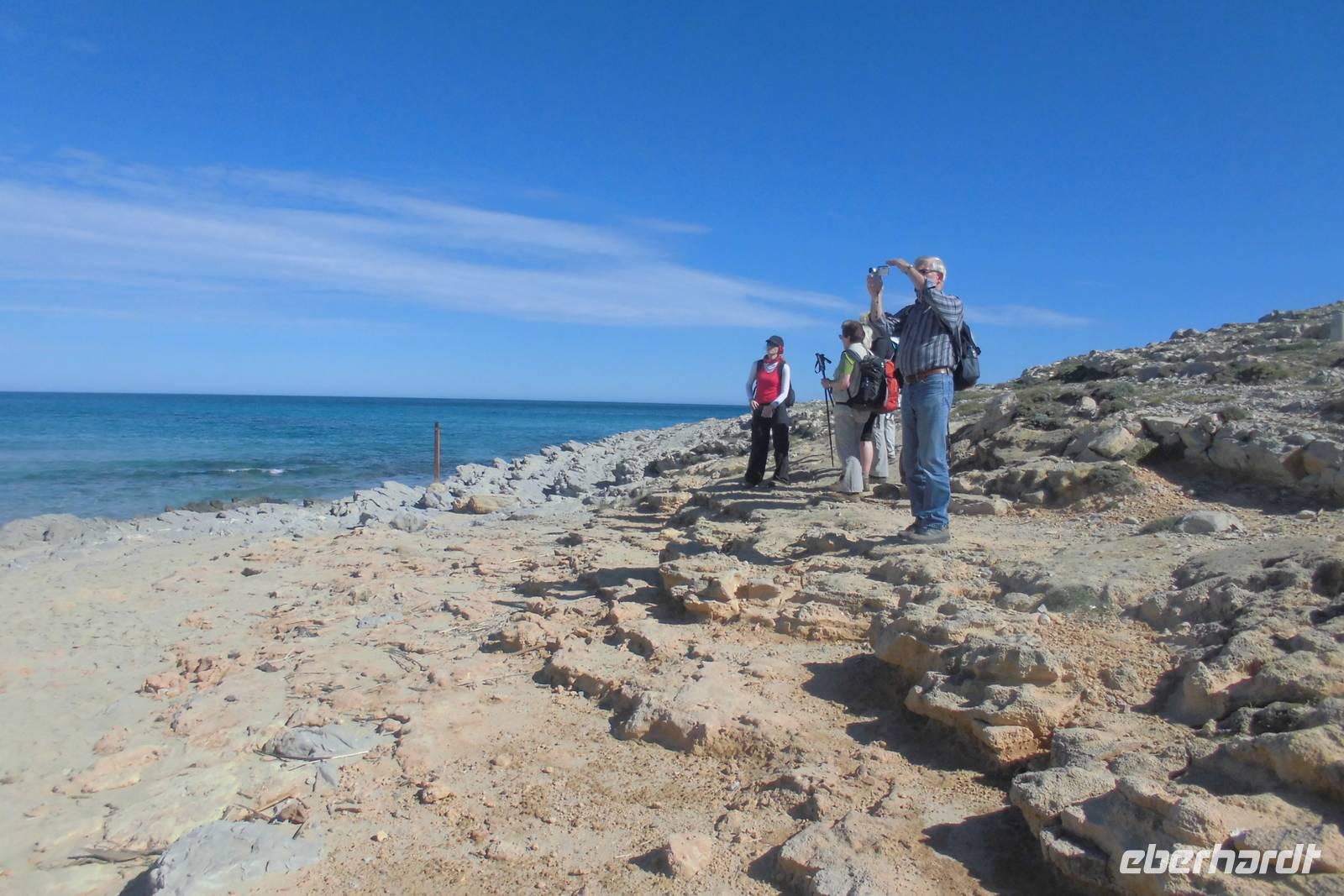 Den Süden Mallorcas haben wir bisher etwas stiefmütterlich behandelt, doch heute wartet auf uns eine Küstentour, welche wir ganz Süden der Insel in Angriff nehmen. Nach einer etwas einstündigen Busfahrt steigen wir in Cala Pi an einem alten Wachturm aus. Wir verteilen das heute wieder von Isabél organisierte Picknick auf alle Schultern und Rucksäcke und beginnen unsere Wanderung bei erneut schönstem Sonnenschein. Vorbei an ein paar noch geschlossenen Hotels folgen wir Isabél eine Steintreppe abwärts und befinden uns auf einmal in einer wunderschönen einsamen Bucht. Die Wellen schwappen hier ruhig an Land, nur am Ende der Bucht erkennt man die tosende Brandung. Wir queren den breiten Sandstrand. Vorbei an alten Bootsschuppen sind wir bemüht, dass unsere Füße nicht nass werden - wir behalten die Wellen ganz genau im Auge. Hinter den Schuppen führt dann ein kurzer aber steiler und steiniger Anstieg hinauf auf die andere Seite der Bucht - der schwerste Teil des heutigen Tages ist somit geschafft. Vor uns liegt nun eine Tour, die fast komplett parallel zum Meer verläuft. Oftmals verlieren wir uns in den wunderschönen Ausblicken über das weite Meer. Mehrere Meter unter uns sieht man immer wieder, wie die Wellen an den hohen Klippen brechen. Nachdem der erste Teil eher einem Trampelpfad durch den Wald gleicht, zieht sich die Vegetation nun merklich zurück und wir laufen über nackten und schroffen Fels. Ab und an entfernt sich unser Weg von der Küste, wird wieder etwas grüner, bevor sich vor uns erneut Stein und Geröll auftut. Wir werden von einer milden Brise begleitet, sodass man die heute brennende Sonne kaum spürt - des einen Freud, des anderen Leid ;-) . Nach circa 2 Stunden erreichen wir das Cap Blanc. Der Wachturm scheint auch hier bei einigen Gästen die Neugier zu wecken und so wird der Bau auch kurzerhand erobert - von oben hat man halt die beste Aussicht! Wir verweilen nur kurz und kehren um zu einem schattigen Plätzchen, um dort unser Picknick zu machen. Auch heute hat Isabél sich wieder eine Menge einfallen lassen, um uns kulinarisch zu überraschen. Neben dem obligatorischen Wein gibt es heute selbstgemachte Empanadas, Oliven, Knoblauchbrot, mallorquinsche Knüppelwurst und kleine Küchlein zum Nachtisch - lecker! Und natürlich sind auch nach diesem Picknick die ersten Meter wieder etwas schwerer, aber was soll man machen? Auf dem Rückweg haben wir die Sonne im Rücken, immer wieder schweifen unsere Blicke entlang der Steilküste. Hier und da entdeckt man Steinformationen oder Pflanzen, die einem auf dem Hinweg gar nicht so recht aufgefallen sind. Schlussendlich sind wir dann aber doch froh, alle wieder im Bus zu sein - Sonne hatten wir an diesem Tag mehr als genug.
