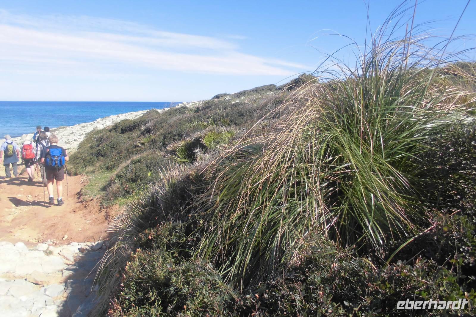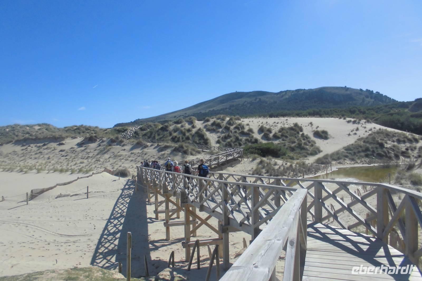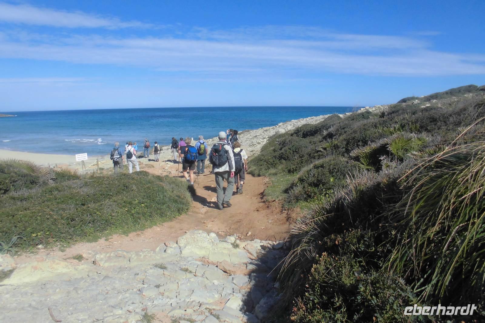 Unsere letzte Wanderung führt uns in den Osten der Insel. Auch hier zeigt Mallorca erneut seine Vielfältigkeit. Cala Mesquida hat einen wunderschönen, flach abfallenden Sandstrand, aber auch - zu unserem Erstaunen - große Sanddünen, welche sich über die Jahrhunderte durch den starken Nordostwind hier angestaut haben. Um diese Dünenlandschaft nicht zu gefährden, beginnen wir unsere Wanderung auf extra angelegten Holzbrücken, welche über die Dünen führen. Nach kurzer Zeit erreichen wir den bunt bewachsenen Fuß des Puig Negre, neben unserem Trampelpfad wachsen nicht nur der sogenannte Strandhafer sondern auch verschiedene Disteln, Strandwinden und Narzissen. Das Ziel vor Augen wird es ein doch anstrengender Aufstieg - die Sonne scheint, der Himmel ist strahlend blau. Nichtsdestotrotz haben wir genug Zeit, sodass jeder den Anstieg in seinem Tempo meistern kann. Und natürlich muss auch Zeit sein, um sich die unbekannten Gräser und Gewächse einmal genauer anzusehen. Nach vierzig Minuten stetigem Aufstiegs haben es alle geschafft. Erneut steht ein Wachturm auf dem Gipfel des Berges und bietet sich als Rastplatz an. Das traumhafte Wetter ermöglicht es uns sogar, die Nachbarinsel Menorca am Horizont zu erkennen. Wir verweilen etwas und genießen den Ausblick, ehe wir den Puig Negre in Richtung Cala Agulla verlassen. Auf diesem Wegstück finden wir nun wieder eine völlig andere Vegetation als beim Aufstieg auf der anderen Bergseite. Der Weg ist steiniger und führt in ein kleines Kiefernwäldchen. Wir laufen etwas langsamer, um auf den teils losen Steinen nicht zu rutschen. Nach unten hin wird der Weg immer flacher, wir treffen jetzt öfters weitere Wanderer und Spaziergänger. Am Ende des Weges angekommen, erreichen wir den perfekten Platz für ein Picknick. Am Strand der Cala Agulla suchen wir uns eine Schatten spendende Baumgruppe, setzen uns in den Sand oder auf die Wurzeln der Bäume und lassen unseren Blick über das türkisfarbene Wasser der Bucht schweifen. Einfach traumhaft!