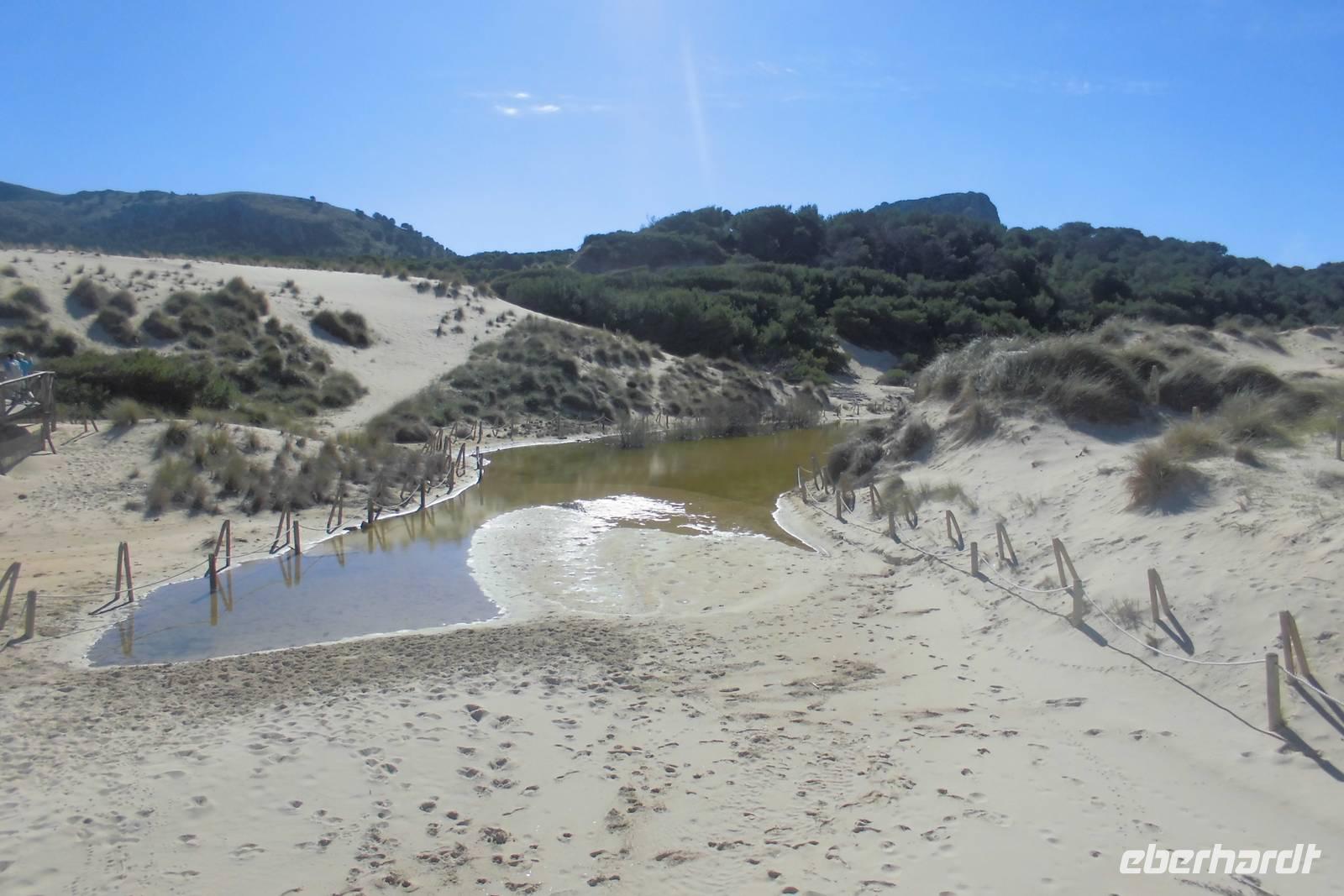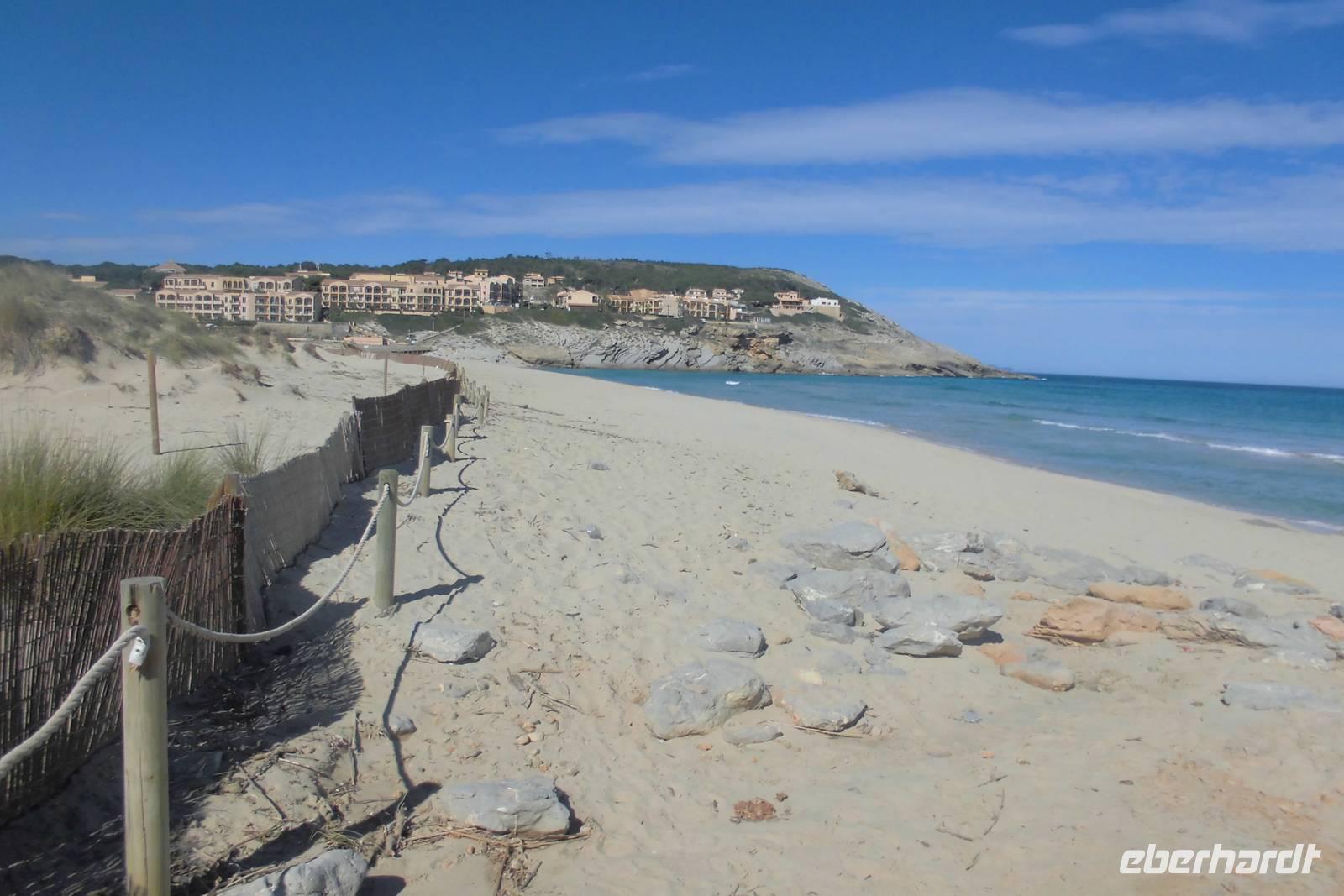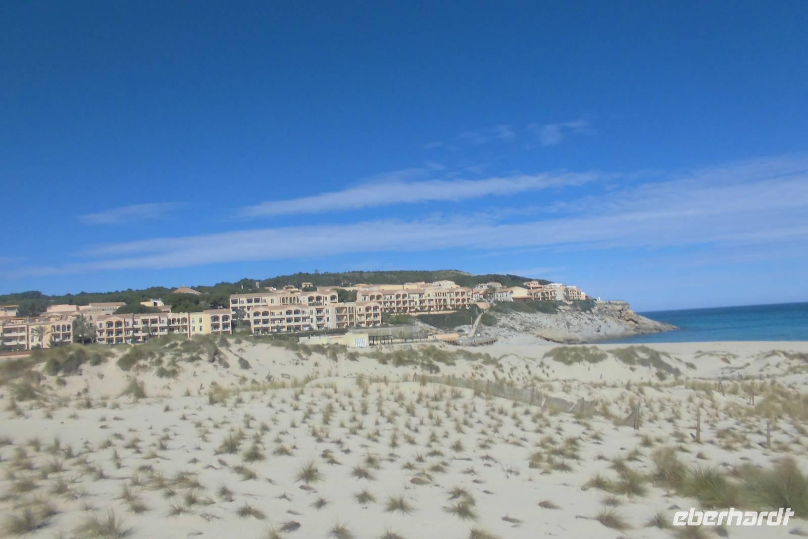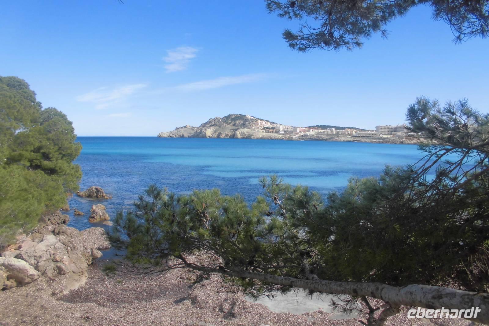 Unsere letzte Wanderung führt uns in den Osten der Insel. Auch hier zeigt Mallorca erneut seine Vielfältigkeit. Cala Mesquida hat einen wunderschönen, flach abfallenden Sandstrand, aber auch - zu unserem Erstaunen - große Sanddünen, welche sich über die Jahrhunderte durch den starken Nordostwind hier angestaut haben. Um diese Dünenlandschaft nicht zu gefährden, beginnen wir unsere Wanderung auf extra angelegten Holzbrücken, welche über die Dünen führen. Nach kurzer Zeit erreichen wir den bunt bewachsenen Fuß des Puig Negre, neben unserem Trampelpfad wachsen nicht nur der sogenannte Strandhafer sondern auch verschiedene Disteln, Strandwinden und Narzissen. Das Ziel vor Augen wird es ein doch anstrengender Aufstieg - die Sonne scheint, der Himmel ist strahlend blau. Nichtsdestotrotz haben wir genug Zeit, sodass jeder den Anstieg in seinem Tempo meistern kann. Und natürlich muss auch Zeit sein, um sich die unbekannten Gräser und Gewächse einmal genauer anzusehen. Nach vierzig Minuten stetigem Aufstiegs haben es alle geschafft. Erneut steht ein Wachturm auf dem Gipfel des Berges und bietet sich als Rastplatz an. Das traumhafte Wetter ermöglicht es uns sogar, die Nachbarinsel Menorca am Horizont zu erkennen. Wir verweilen etwas und genießen den Ausblick, ehe wir den Puig Negre in Richtung Cala Agulla verlassen. Auf diesem Wegstück finden wir nun wieder eine völlig andere Vegetation als beim Aufstieg auf der anderen Bergseite. Der Weg ist steiniger und führt in ein kleines Kiefernwäldchen. Wir laufen etwas langsamer, um auf den teils losen Steinen nicht zu rutschen. Nach unten hin wird der Weg immer flacher, wir treffen jetzt öfters weitere Wanderer und Spaziergänger. Am Ende des Weges angekommen, erreichen wir den perfekten Platz für ein Picknick. Am Strand der Cala Agulla suchen wir uns eine Schatten spendende Baumgruppe, setzen uns in den Sand oder auf die Wurzeln der Bäume und lassen unseren Blick über das türkisfarbene Wasser der Bucht schweifen. Einfach traumhaft!
