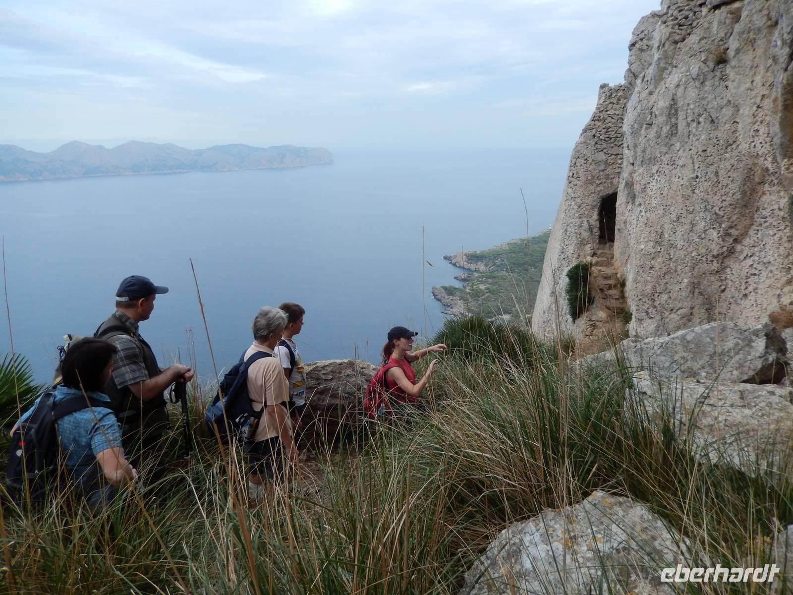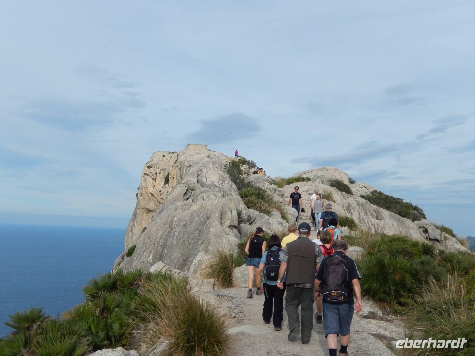 Trefflich gestärkt vom reichhaltigen Frühstücksbüffet machen wir uns mit dem Bus auf den Weg in den Norden der Insel. Zunächst legen wir einen kurzen Stopp am Traditionsmarkt von Sineu ein. Die angekündigte Einzigartigkeit, weil regional und vorrangig von Einheimischen besucht, finden wir so nicht bestätigt und so begeben wir uns schnell weiter auf den Weg nach Alcudia. Unsere Wanderung beginnen wir an der Ermita de la Victoria mit einem ca. einstündigen Aufstieg zum Talaia d' Alcudia. Dabei erleben wir ständig wechselnde Ausblicke auf die Bucht von Pollenca und bewegen uns schließlich im Schlussanstieg auf schmalem, steinigem Pfad. Belohnt werden wir am Gipfel mit einer herrlichen Rundumsicht. Um diese etwas länger genießen zu können, nutzen wir die Pause für eine Stärkung mit den mitgebrachten Lunchpaketen. Wir steigen den Weg ein Stück zurück und wandern noch zu einem anderen sehenswerten Punkt: den Penya Roja. Auf schmalem Pfad mit vielen Pflanzen gesäumt, bewegen wir uns am Steilhang entlang bis zu unserem Ziel. Der ehemalige Beobachtungsposten beeindruckt uns mit seiner gewählten Lage, welche einen wunderschönen Blick auf das Meer und die beiden Buchten von Alcudia und Pollenca gewährt. In früheren Zeiten standen hier Posten bereit, um bei der Annäherung feindlicher Schiffe rechtzeitig Alarm für das Hinterland geben zu können. Zurück am Bus fuhren wir nach Alcudia Dorf und genießen die altehrwürdigen Gassen der Stadt aus dem Mittelalter. Den Abschluss des heutigen Tages bildet einen Abstecher mit dem Bus zum Aussichtspunkt auf den Felsen Colomer. Faszinierend die von Wind und Wetter geformten Felsstrukturen! Nach einem langen und ereignisreichen Tag gehen wir mit gutem Appetit an das wieder köstliche Abendbuffet.