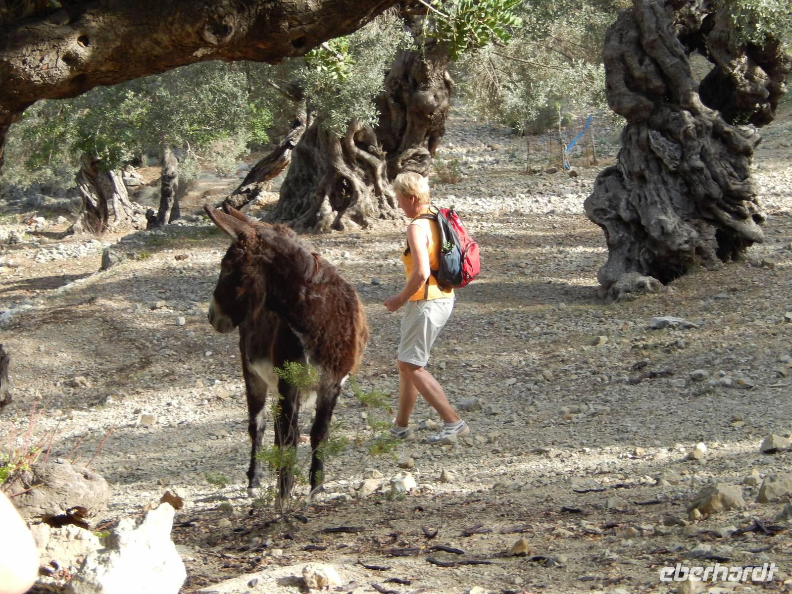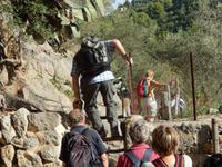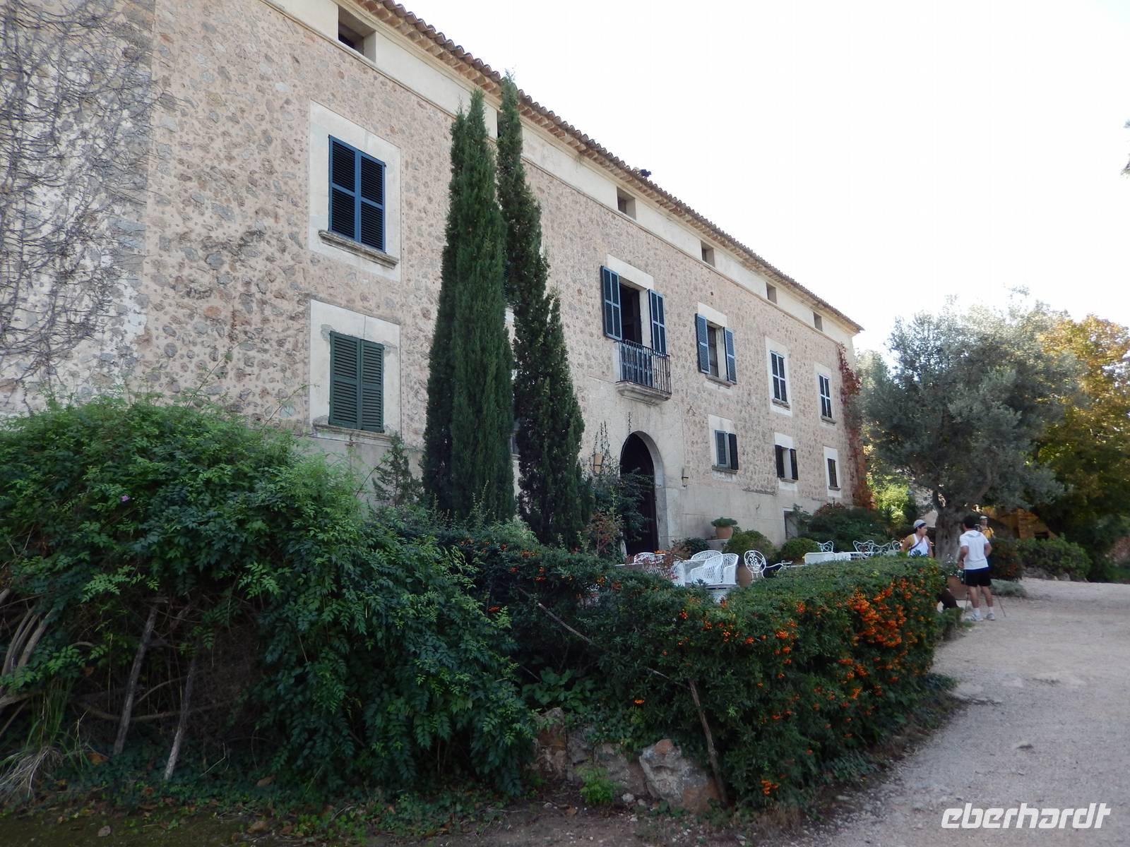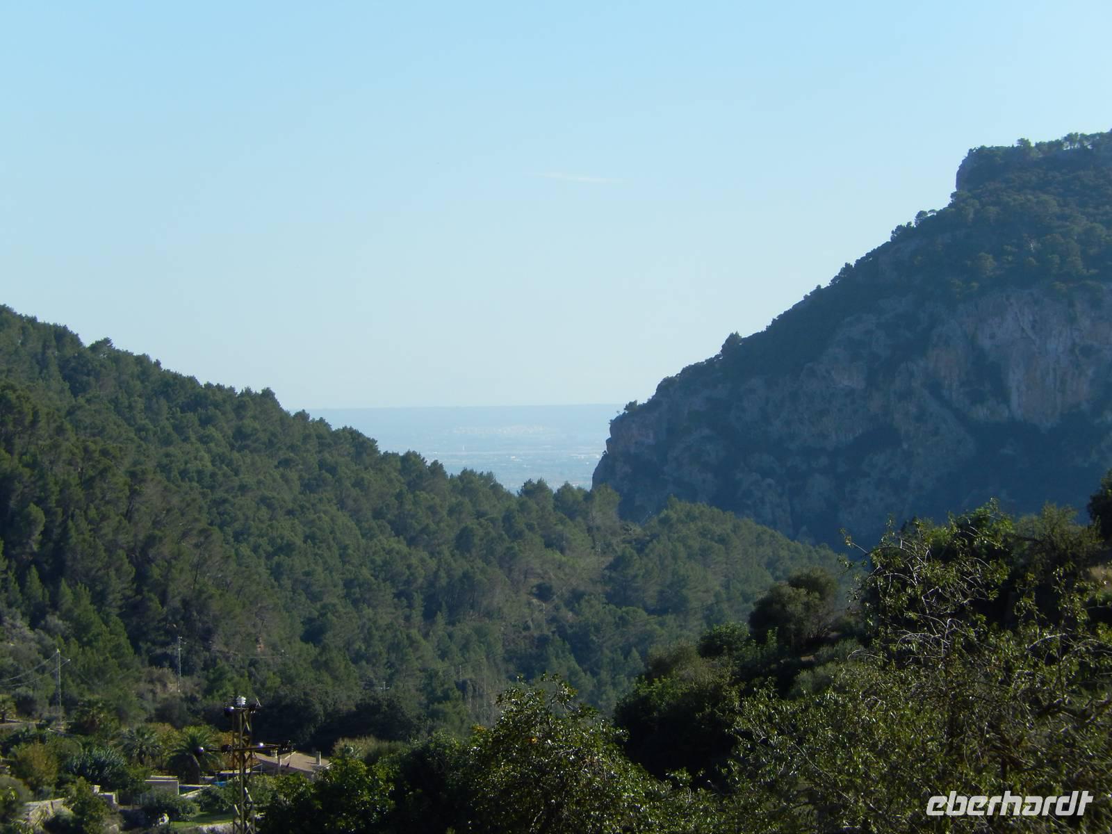 Heute steht die Wanderung durch das Tal Orient auf dem Programm. Zunächst fahren wir mit dem Bus zu dem gleichnamigen Ort und schauen uns die kleine Kirche und die alte Schule an. Dann führt uns unser Beginn der Wanderung durch eine uralte olivenbaumplantage, in der uns Isabell einiges wissenswertes über die Olivenproduktion auf Mallorca erzählt. Ein etwas steilerer Anstieg bringt uns dann zum Castell d'Aloro. Von diesem altehrwürdigen Gemäuer haben wir einen phantastischen Blick sowohl auf die höchsten Berge Mallorcas wie den Puig Major und den Puig de Masanella als auch auf das Tiefland jenseits des Tramuntana Gebirges bis nach Palma. Dabei genießen wir einen kleinen Kaffee und hervorragenden Kuchen, der hier oben selbst gebacken wird. Auf dem folgenden Abstieg macht uns Isabell mit einigen Besonderheiten der Flora der Insel vertraut. Und so probieren wir die uns fremden Früchte des Erdbeerbaumes, des Johannisbrotbaumes und der Mandelbäume. Faszinierend die exotischen Früchte. Als es Zeit ist für das Mittagsmahl führt uns Isabell in das Lokal Es Veger mitten am Berg. In diesem sehr einfachen Lokal essen wir die wohl beste Lammschulter unseres Lebens! Ein Gedicht! Zusammen mit dem regionalen Rotwein und dem selbst gebackenen Brot mit Alioli ein typisch mallorquinisches Essen. Bloß gut, dass uns unser weiterer Weg zum Dorf Alora nur noch bergab führt. Es erwartet uns unser Bus und bringt uns nach Paguera. Bis zum Abendessen verbleibt noch Zeit, dass wundervolle Sommerwetter zum Baden am Strand von Paguera zu nutzen.