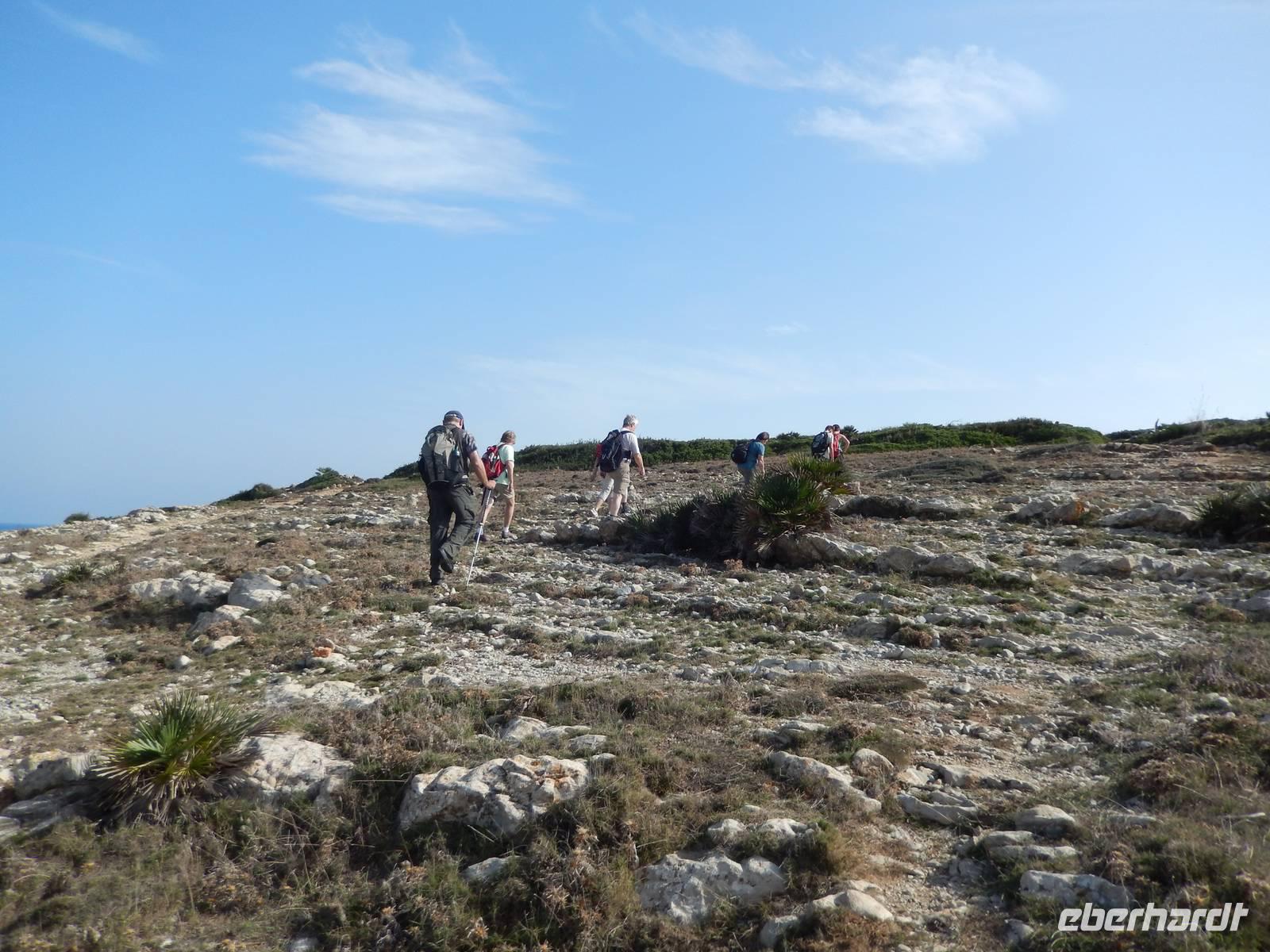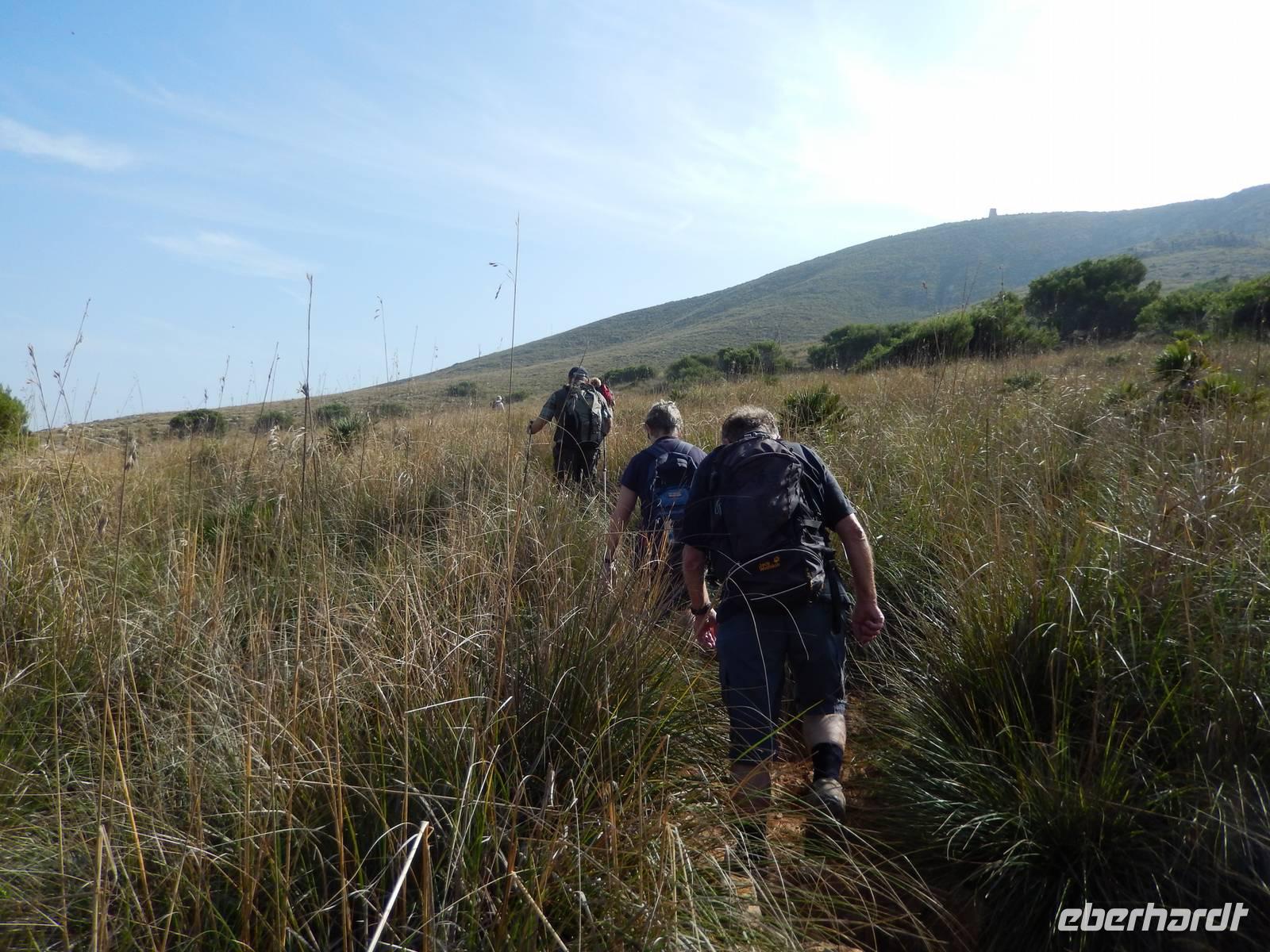Heute haben wir eine etwas längere Anfahrt bis zum Ausgangspunkt unserer Wanderung. Wir wollen heute den äußersten Nordosten der Insel erwandern. Und so fahren wir zunächst bis Cala Mesquida. Zuerst am Strand entlang, dann einen immer steiler werdenden Anstieg hinauf erreichen wir den alten Wachturm, von wo wir einen herrlichen Blick auf die Buchten Cala Mesquida und Cala Ratjada haben. Nach unserem Abstieg an den Strand von Cala Ratjada lassen wir uns zum Picknick nieder und genießen die mitgebrachten Spezialitäten. Und ein ordentlicher Schluck mallorquinische Wein darf dabei selbstverständlich nicht fehlen. Wir verlängern die Rast, um an dem wunderschönen Strand nach Herzenslust in den Wellen herum zu toben. Nachher gehen wir einen relativ flachen und leichten Weg zurück nach Cala Mesquida und unser Bus bringt uns zurück nach Paguera.