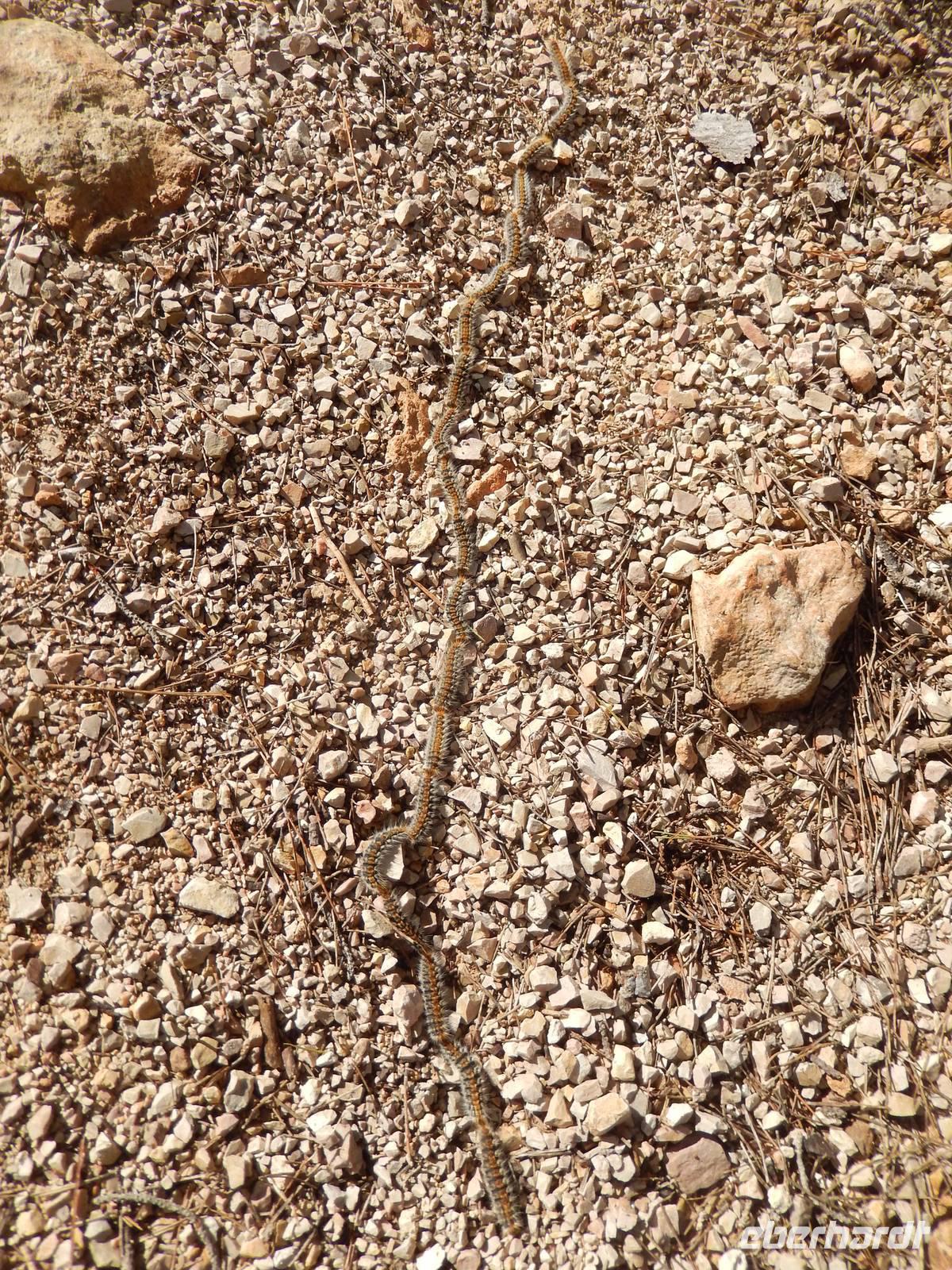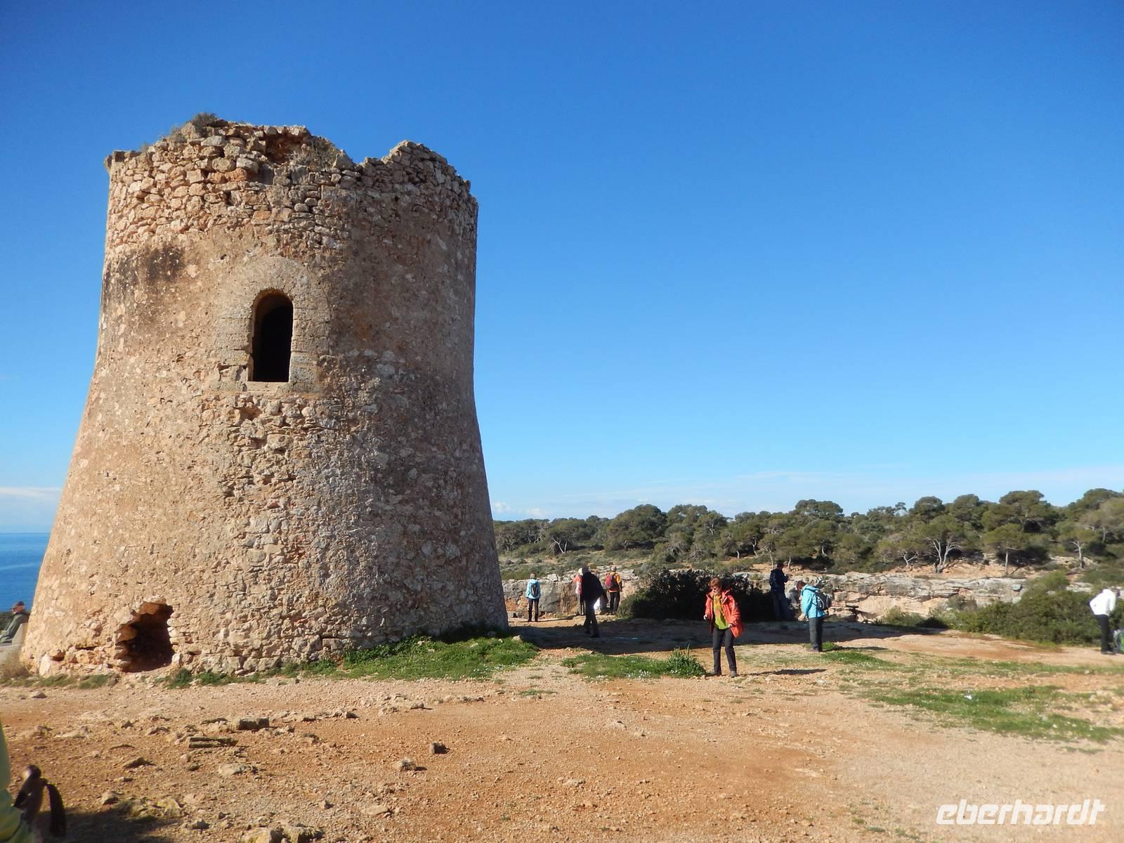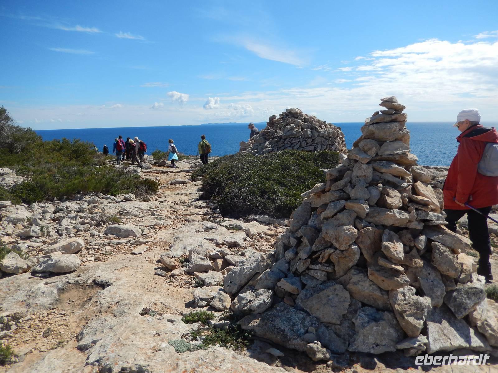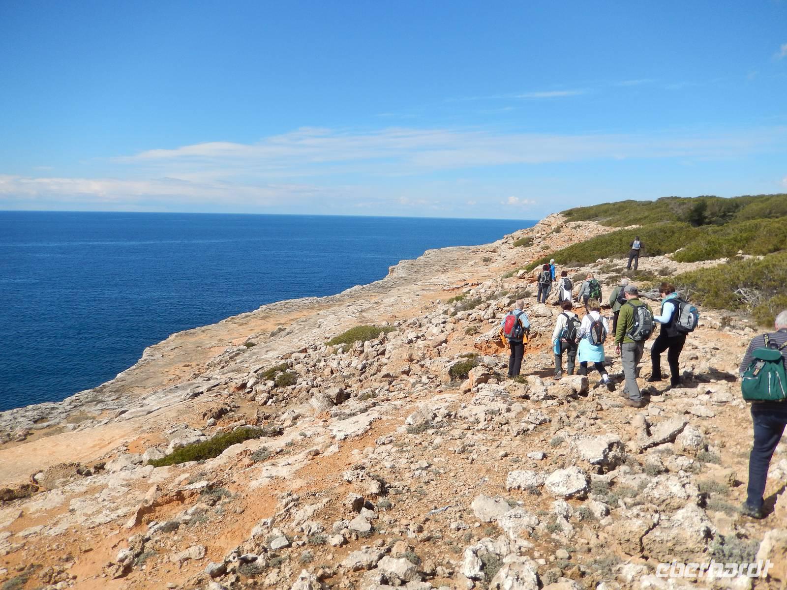 Die Wanderer begannen heute zunächst mit einer leichten Strecke, um sich für die nächsten Tage fit zu machen. Nach einem ausgiebigen Frühstück bekam jeder ein Lunchpaket und dann trafen wir schon Manolo, unseren Wanderführer am Bus. An einem alten Wachturm in Cala Pi, starteten wir schließlich. Das klare Wasser des Mittelmeeres schimmerte in all seinen prächtigen Blautönen und dies verhieß ein schöner Tag zu werden. So bekamen wir den ersten Eindruck von der Insel und waren total begeistert. Nachdem die ersten Eindrücke mit der Kamera festgehalten wurden, ging es eine Steintreppe hinab zu einer herrlichen Bucht. Vorbei am rauschenden Meer und einem alten Bootsschuppen, begann hier der anstrengendsten Teil des heutigen Tages. Ein kleiner steiniger Anstieg führte uns direkt zu einem kleinen Trampelpfad, der immer entlang der spektakulären Küste führte. Nach etwa einer Stunde verließen wir den kleinen Pfad und wanderten auf schroffen Felsen und Wegen der Sonne entgegen. Durch die gebogenen Büsche und Sträucher konnte man die Richtung des Windes, der vermutlich in der rauen Jahreszeit hier weht, erkennen. Außerdem zeigte uns Manolo immer zu, die kleinen Besonderheiten, die diese Umgebung mit sich brachte. Ohne ihn, hätten wir wahrscheinlich gar nicht die vielen kleinen Raupen erspät, die unseren Weg kreuzten. Vermutungen zur Folge machten sie auch einen Wanderausflug.