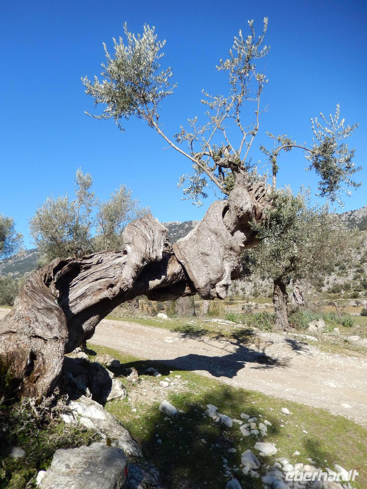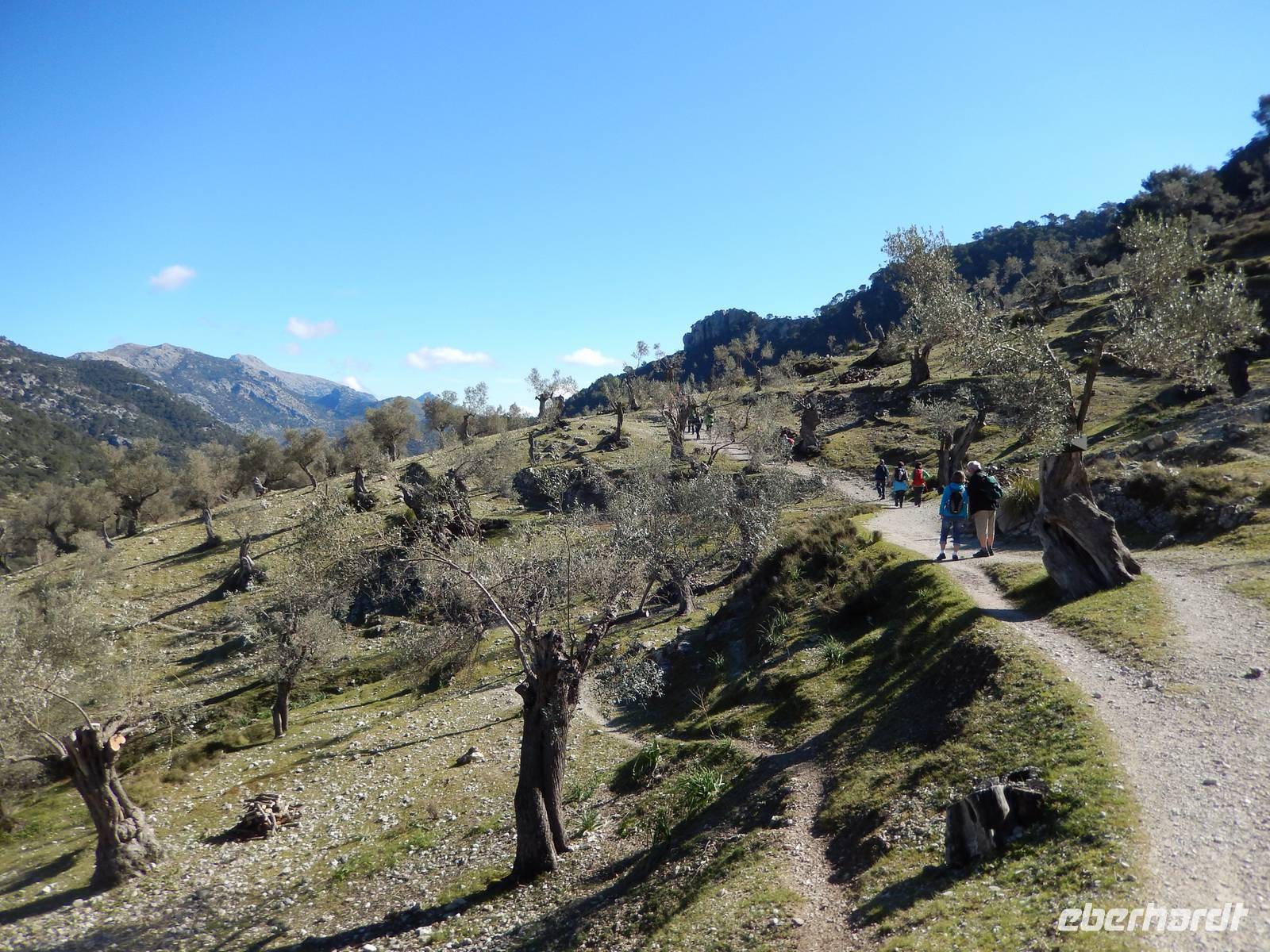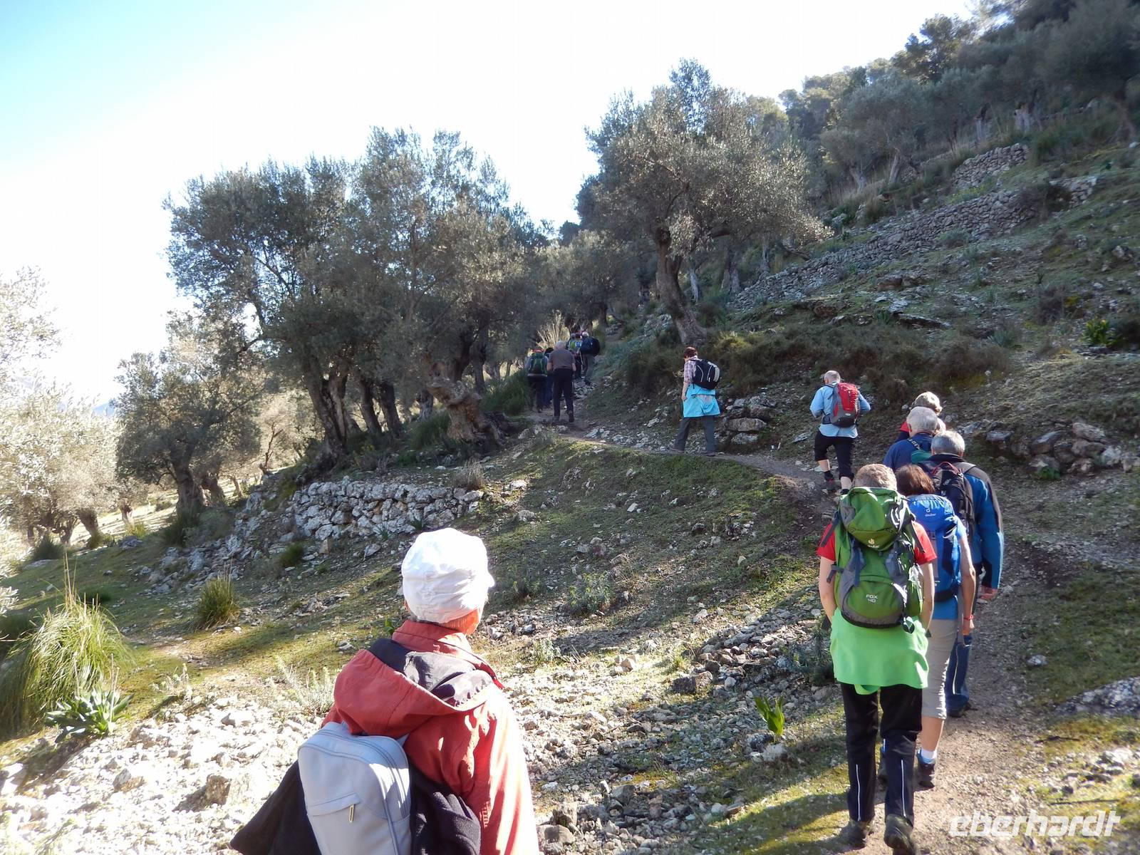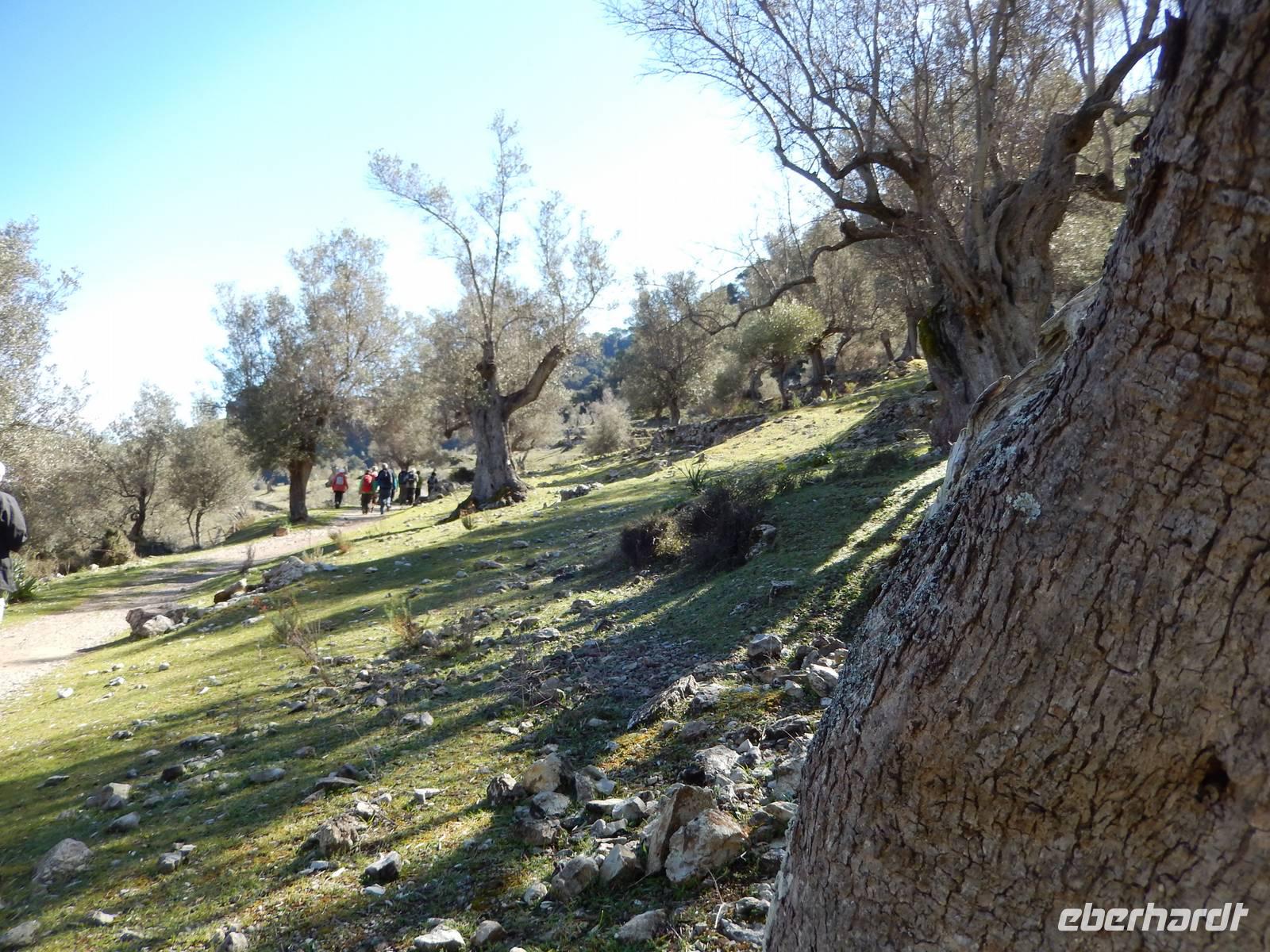 Wir starteten unsere Wanderung im Tal von Orient. Es war ein herrlicher Morgen. Die Sonne strahlte nur so vor sich hin, dass man meinen könnte, sie wolle den gestrigen Tag wieder gut machen. Wir öffneten ein Tor und verschwanden in eine andere Welt. Hier regierten die Olivenbäume. Überall standen knorrige und majestätisch alte und junge Olivenbäume, die durch den Wind alle eine besondere Form hatten. Nun ging es auf einem alten Pilgerfahrt quer durch die Olivenhainen. Isabel war nun ganz in ihrem Element und beantwortete uns unsere Fragen über Flora und Fauna und erläuterte die unterschiedlichen Arten von Oliven und deren Ernte. Dabei kamen die Männer nicht so gut weg.