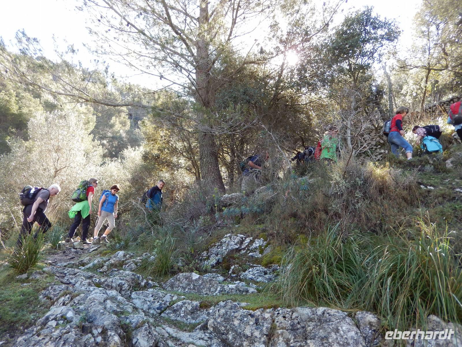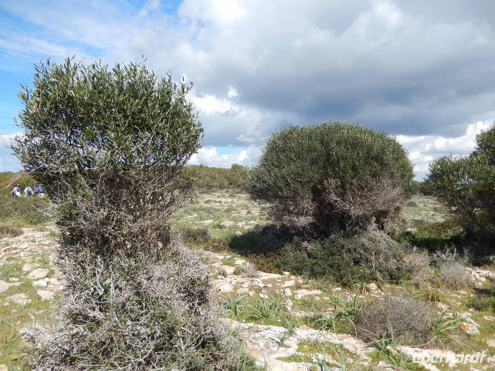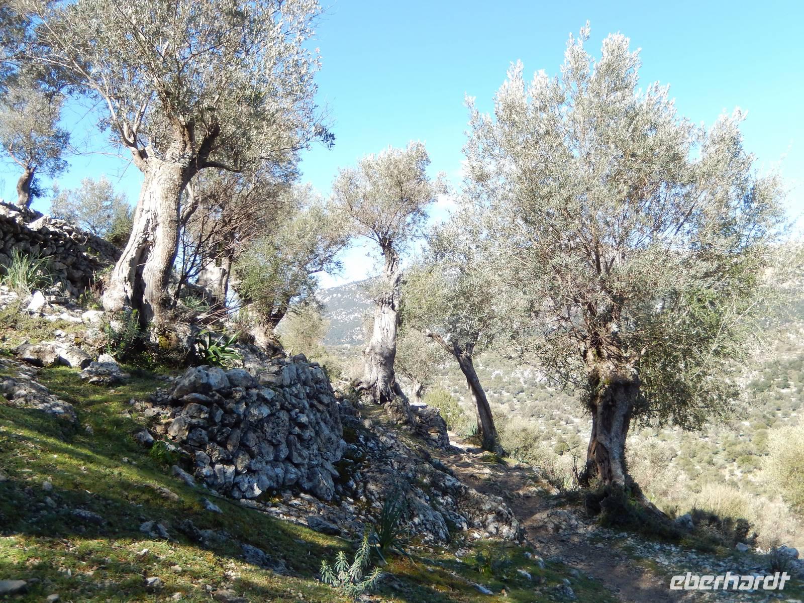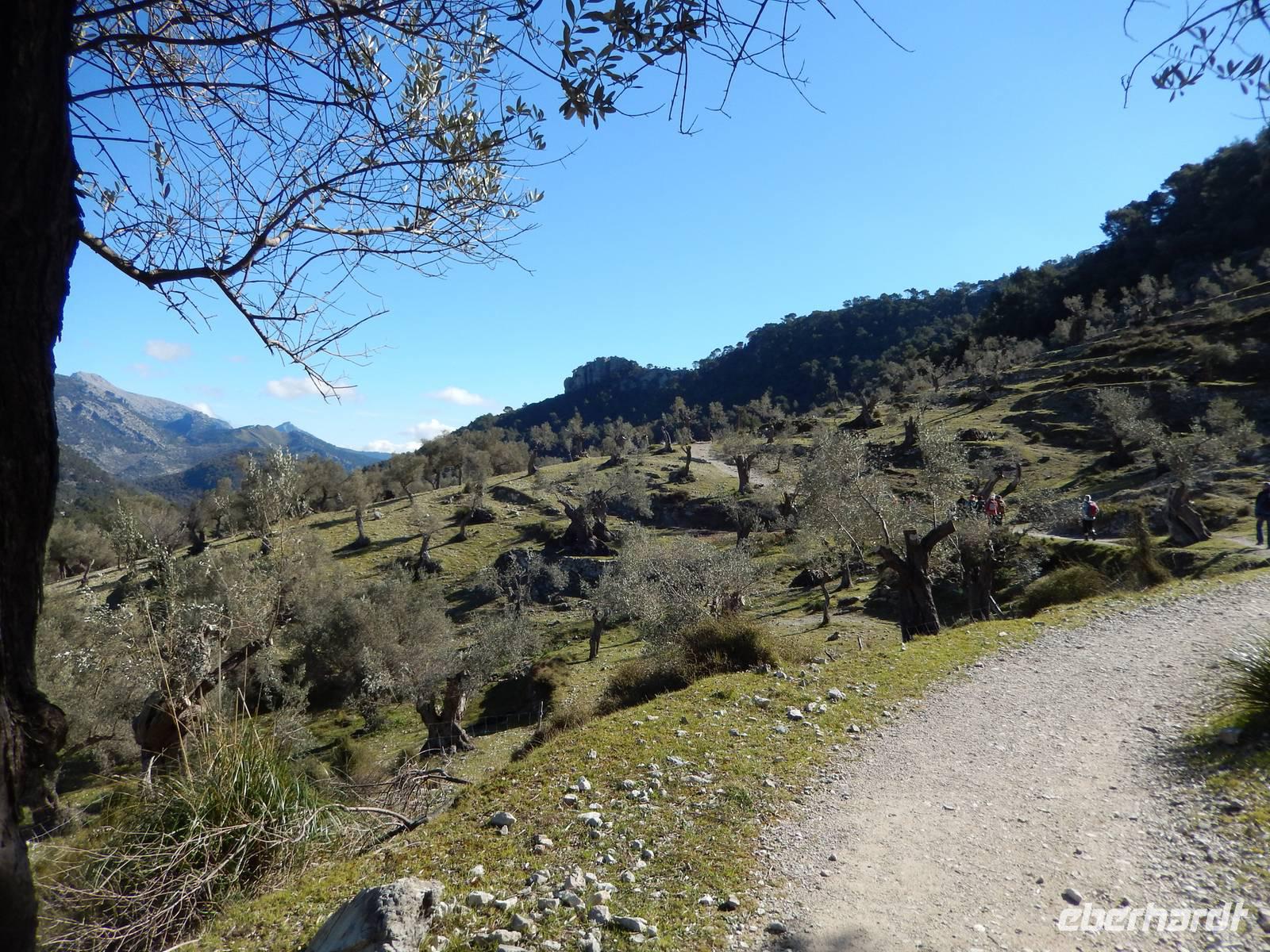 Wir starteten unsere Wanderung im Tal von Orient. Es war ein herrlicher Morgen. Die Sonne strahlte nur so vor sich hin, dass man meinen könnte, sie wolle den gestrigen Tag wieder gut machen. Wir öffneten ein Tor und verschwanden in eine andere Welt. Hier regierten die Olivenbäume. Überall standen knorrige und majestätisch alte und junge Olivenbäume, die durch den Wind alle eine besondere Form hatten. Nun ging es auf einem alten Pilgerfahrt quer durch die Olivenhainen. Isabel war nun ganz in ihrem Element und beantwortete uns unsere Fragen über Flora und Fauna und erläuterte die unterschiedlichen Arten von Oliven und deren Ernte. Dabei kamen die Männer nicht so gut weg.