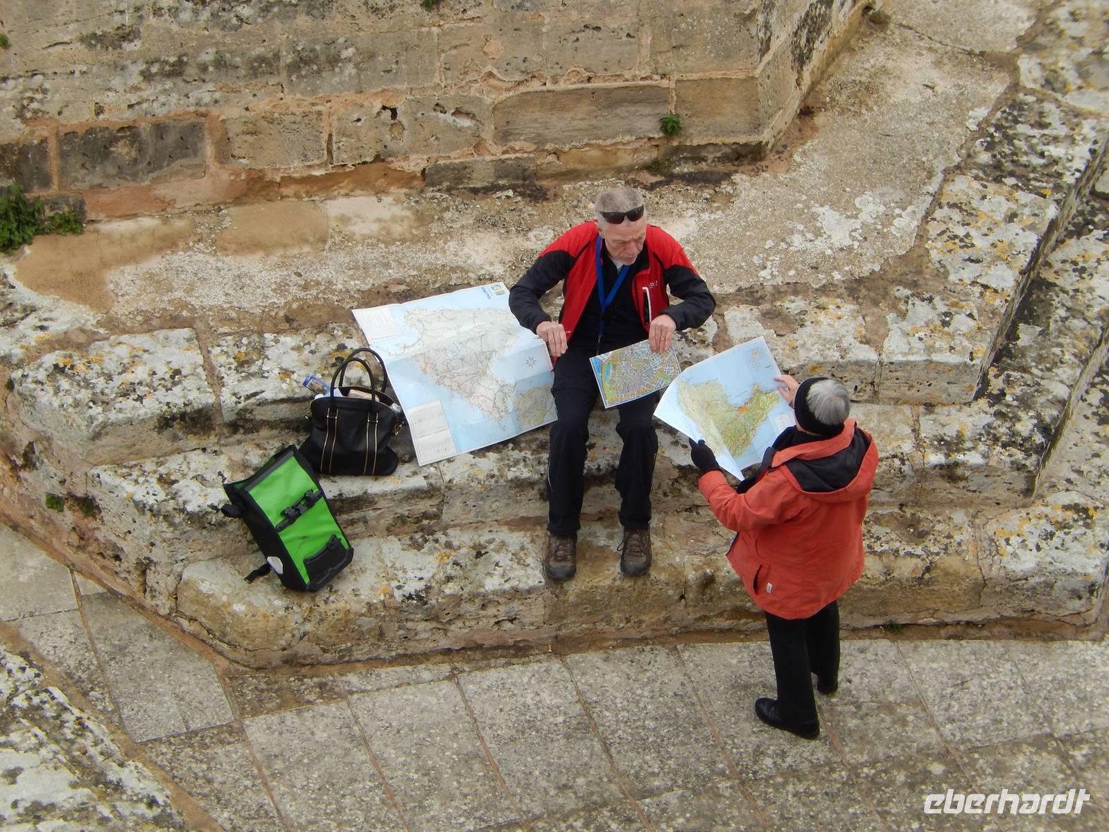 Zu unserer Freude wartete dann bei der Weiterfahrt ein Bergchen auf uns das rasch erklommen wurde. Kurz nach der Abbiegung nach Ses Salines vermisste Klaus seinen Rucksack und fuhr rasch zurück - er war schon in Sicherheit gebracht worden. An einer geeigneten Stelle warteten wir auf ihn und machten auch gleich unser Picknick. Ein toller Platz für ein Auskunftsbüro, in kurzer Zeit hielten bei uns zwei Radfahrer und ein Auto um nach dem Weg zu fragen - immerhin wussten wir Bescheid.