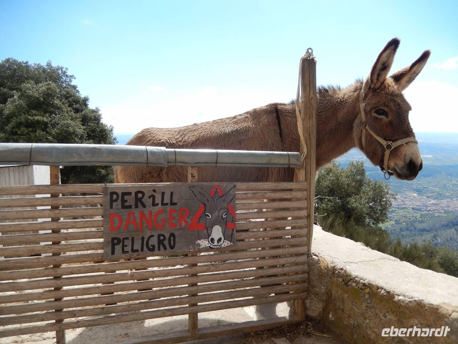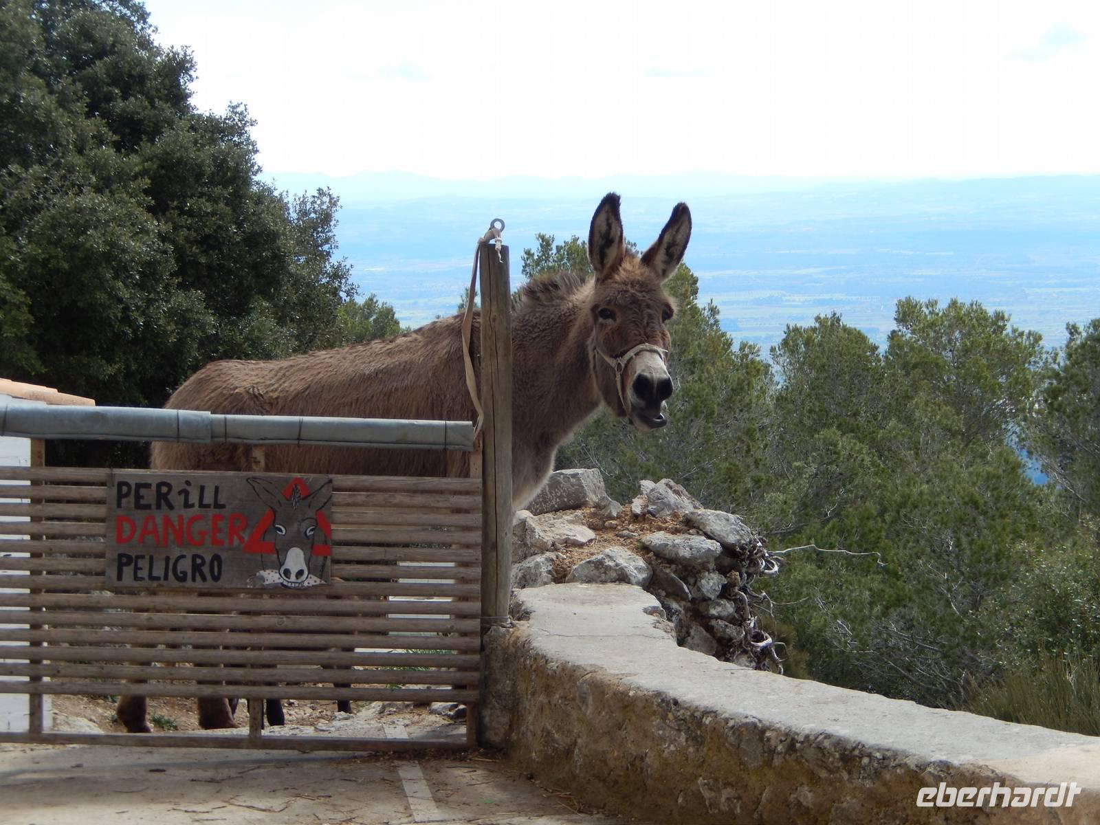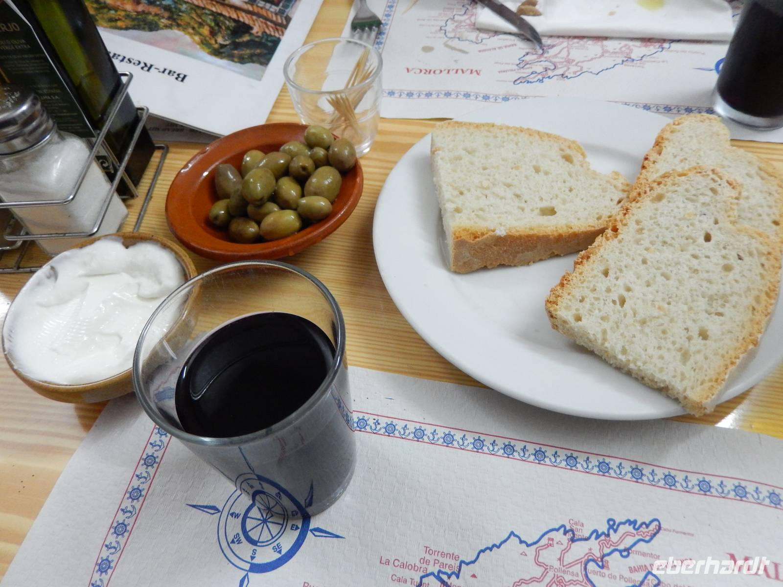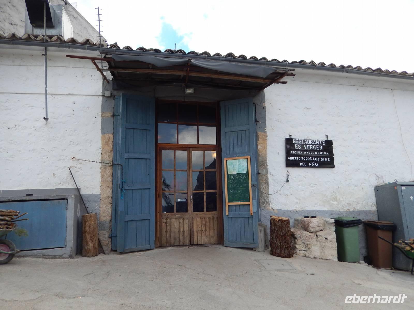 Anschließend wählten alle den Weg zur ehemaligen Klosteranlage Castell d'Alaro, schließlich musste man sich das Mittagessen ja verdienen und die Aussicht von oben war phänomenal. Ganz oben angekommen, befand sich eine Jugendherberge und der dazugehörige Esel belustigte uns bei unserer Pause. Von hier aus konnte man im Tal schon unsere Gaststätte sehen und so packten wir nach einer kleinen Pause unsere Sachen wieder zusammen, sagten Adios zu dem Esel und liefen zum rustikalen Restaurant Es Verger. Anscheinend ist es unter den Wanderern sehr beliebt, denn das kleine Restaurant war gut gefüllt. Da wir aber bereits im Vorfeld reserviert hatten, hatte jeder mehr als genügend Platz. Auf jedem Tisch standen zwei gefüllte Schalen mit mallorquinischen Oliven (schmecken tatsächlich anders), ein großer Korb mit selbstgebackenem Brot und Aioli. Dazu gab es einen leckeren Landwein aus der Region und Wasser. Schon das alles war sehr lecker, aber als dann die lange im Ofen geschmorte Lammschulter aufgetischt wurde, kehrte Ruhe bei uns ein und jeder genoss das delikate Mahl.