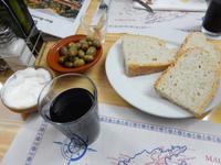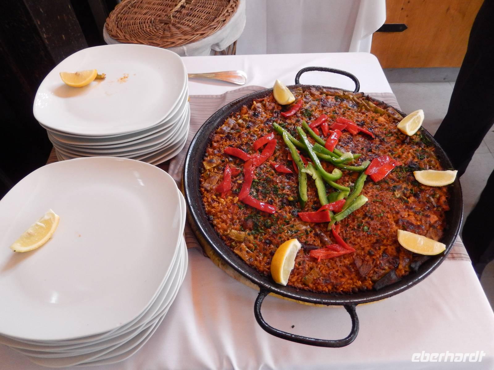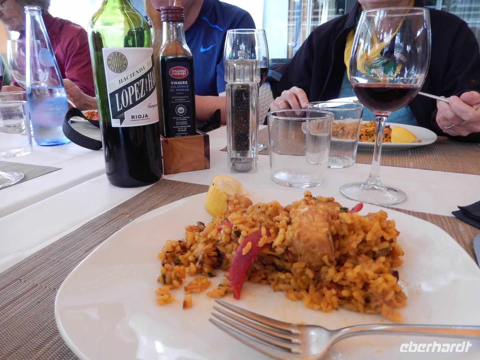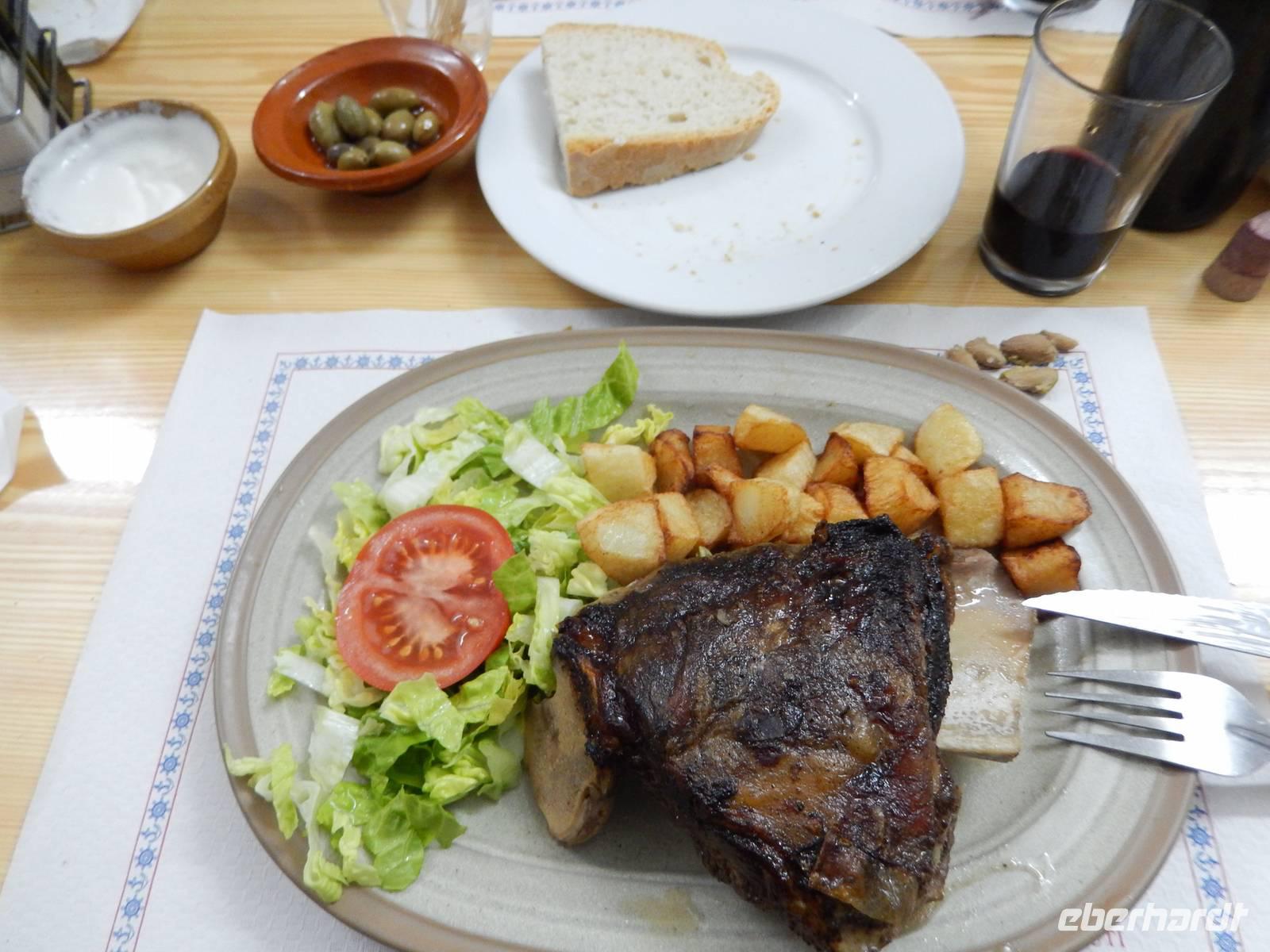 Anschließend wählten alle den Weg zur ehemaligen Klosteranlage Castell d'Alaro, schließlich musste man sich das Mittagessen ja verdienen und die Aussicht von oben war phänomenal. Ganz oben angekommen, befand sich eine Jugendherberge und der dazugehörige Esel belustigte uns bei unserer Pause. Von hier aus konnte man im Tal schon unsere Gaststätte sehen und so packten wir nach einer kleinen Pause unsere Sachen wieder zusammen, sagten Adios zu dem Esel und liefen zum rustikalen Restaurant Es Verger. Anscheinend ist es unter den Wanderern sehr beliebt, denn das kleine Restaurant war gut gefüllt. Da wir aber bereits im Vorfeld reserviert hatten, hatte jeder mehr als genügend Platz. Auf jedem Tisch standen zwei gefüllte Schalen mit mallorquinischen Oliven (schmecken tatsächlich anders), ein großer Korb mit selbstgebackenem Brot und Aioli. Dazu gab es einen leckeren Landwein aus der Region und Wasser. Schon das alles war sehr lecker, aber als dann die lange im Ofen geschmorte Lammschulter aufgetischt wurde, kehrte Ruhe bei uns ein und jeder genoss das delikate Mahl.