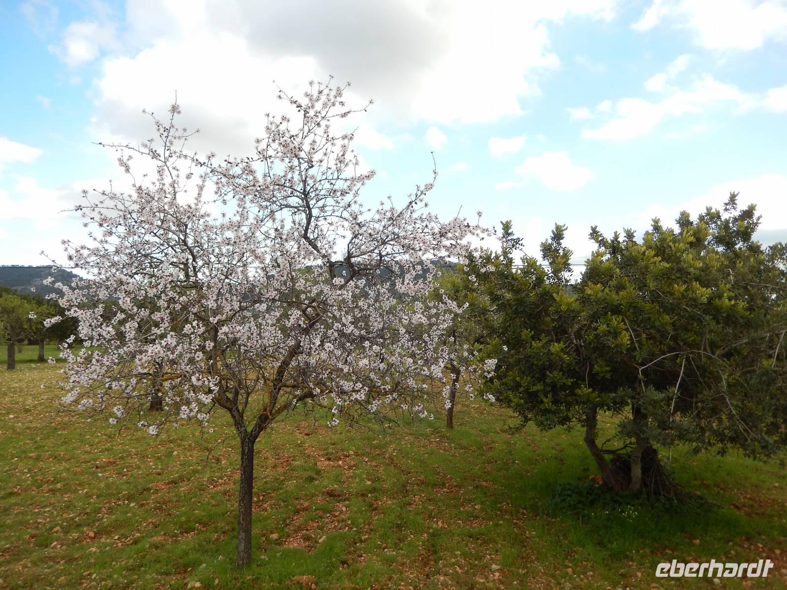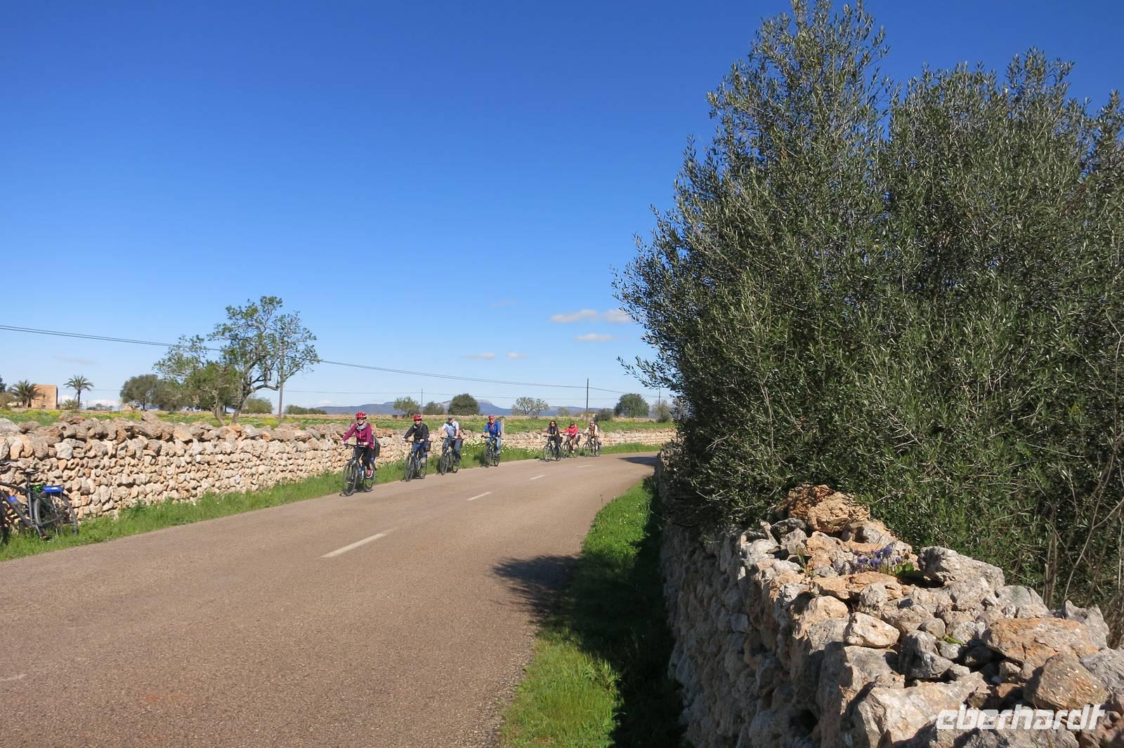 Schnell erreichten wir den Stadtrand und auf einem ganz ruhigen Weg rollten wir durch Wiesen und Felder, vorbei an Obstplantagen und blühenden Mandelbäumen in Richtung Ses Salines.