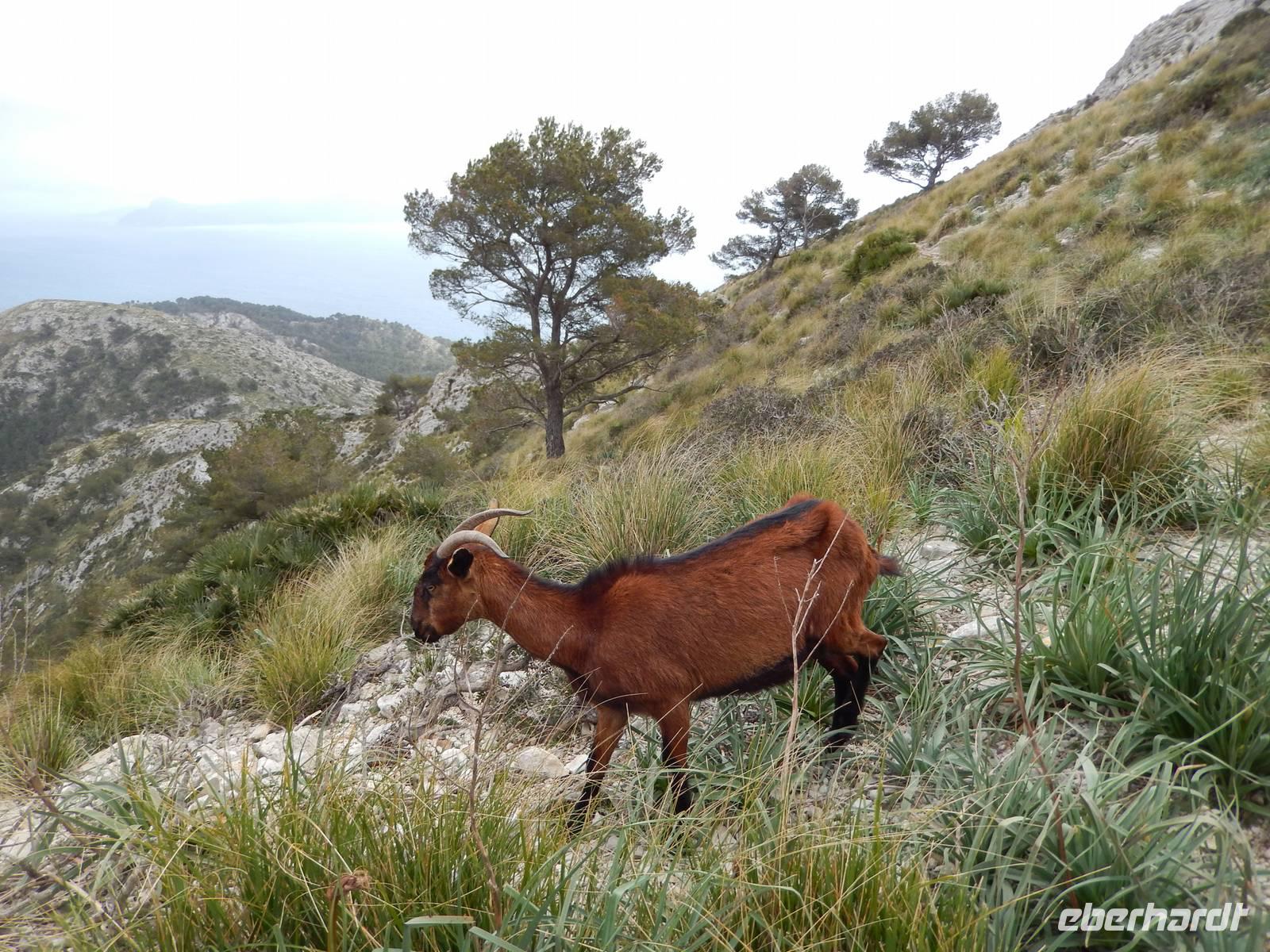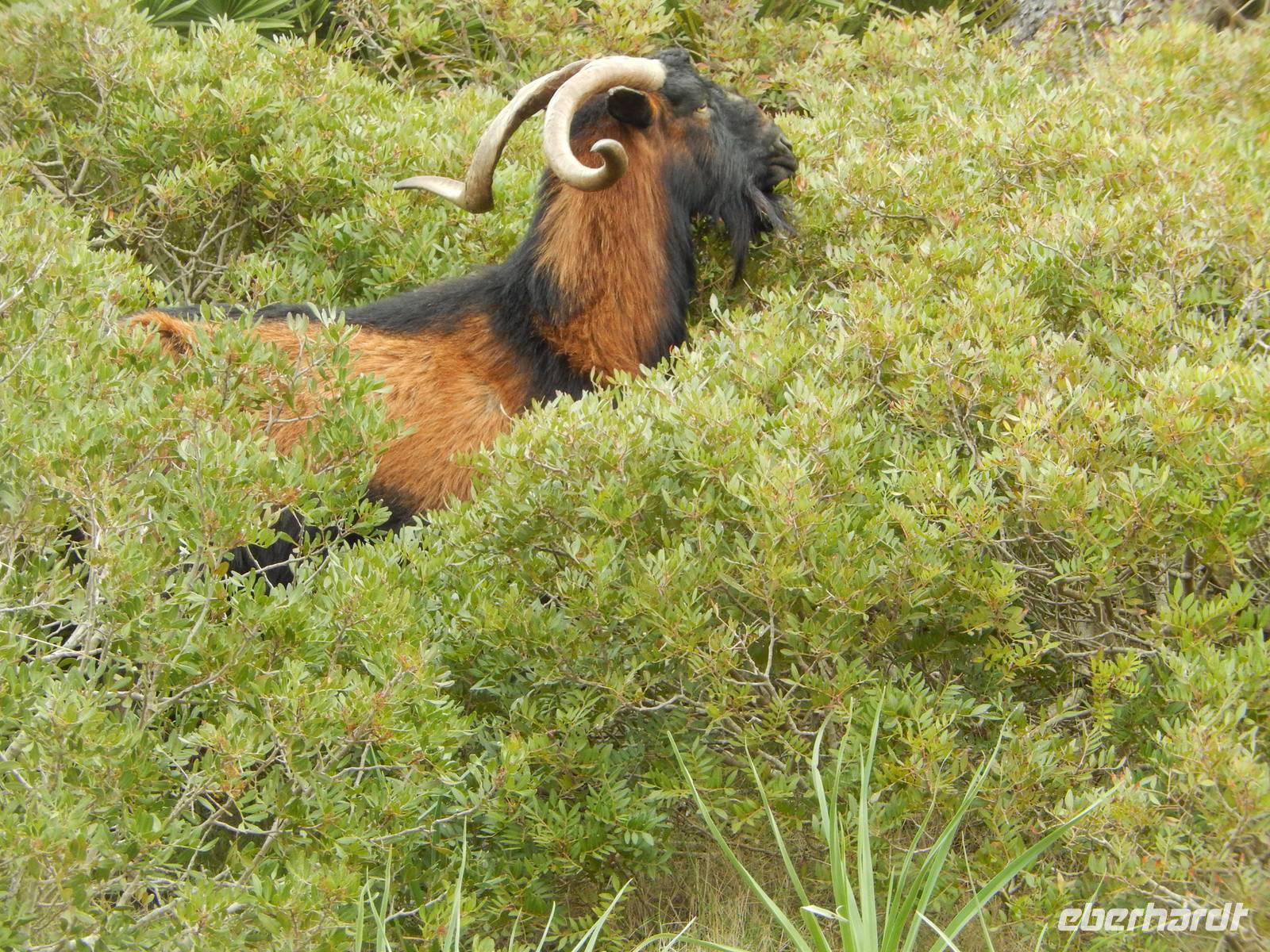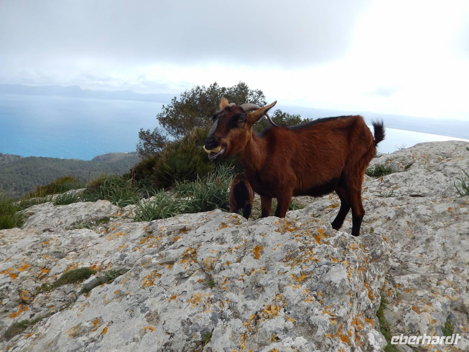 Ganz oben angekommen suchte sich jeder ein windgeschütztes Fleckchen, um sein Lunchpaket zu verzehren. Von hier aus hatte man eine herrliche Aussicht über die komplette Halbinsel. Nicht nur wir wollten hier Mittag essen, auch eine Ziege mit ihrem Zicklein suchten nach etwas essbaren und wurden fündig in Form eines Apfels. Erst nahm sie sich ganz brav ein Stück, aber dann wurde sie „zickig" und klaute den ganzen Apfel.