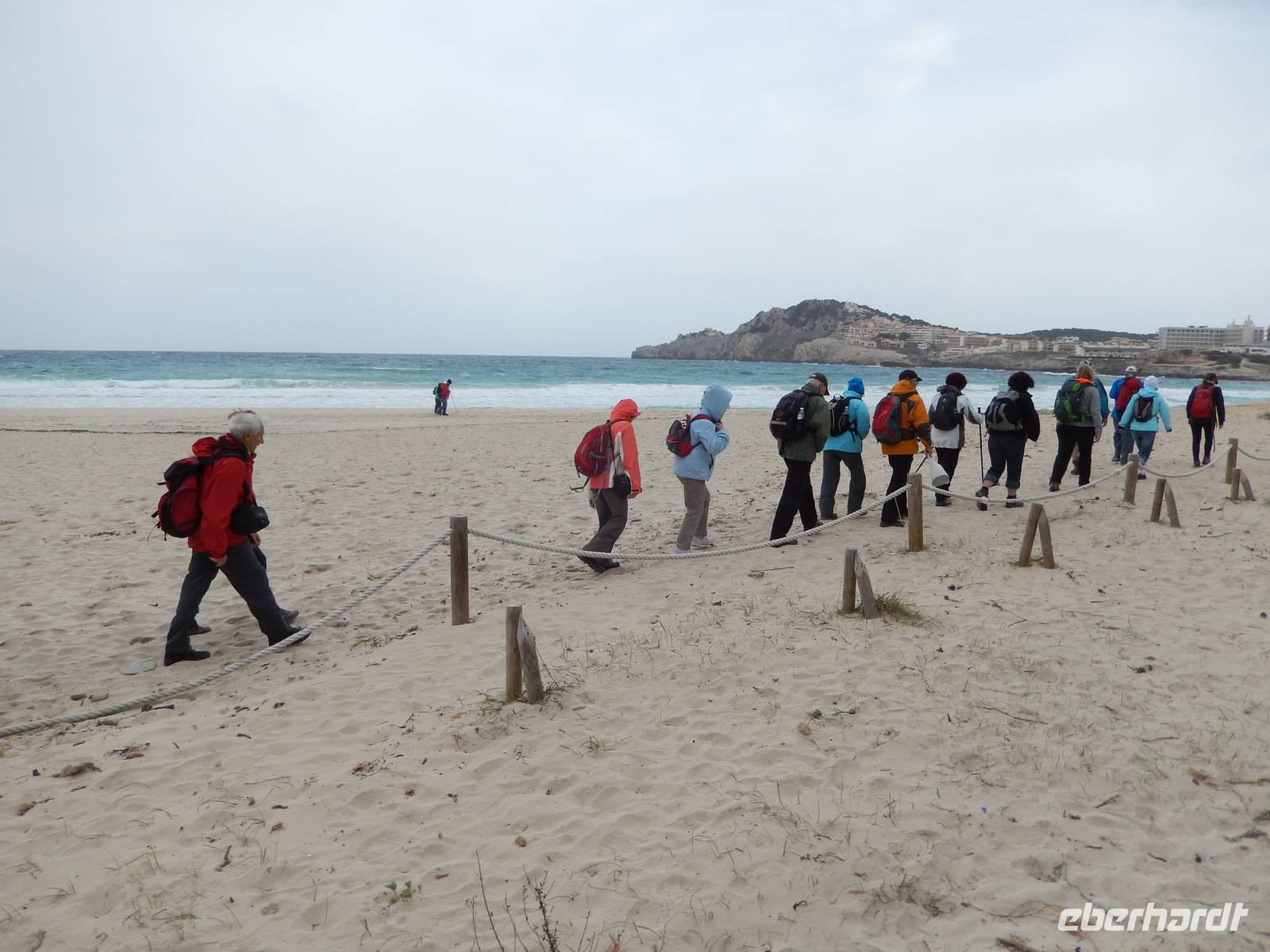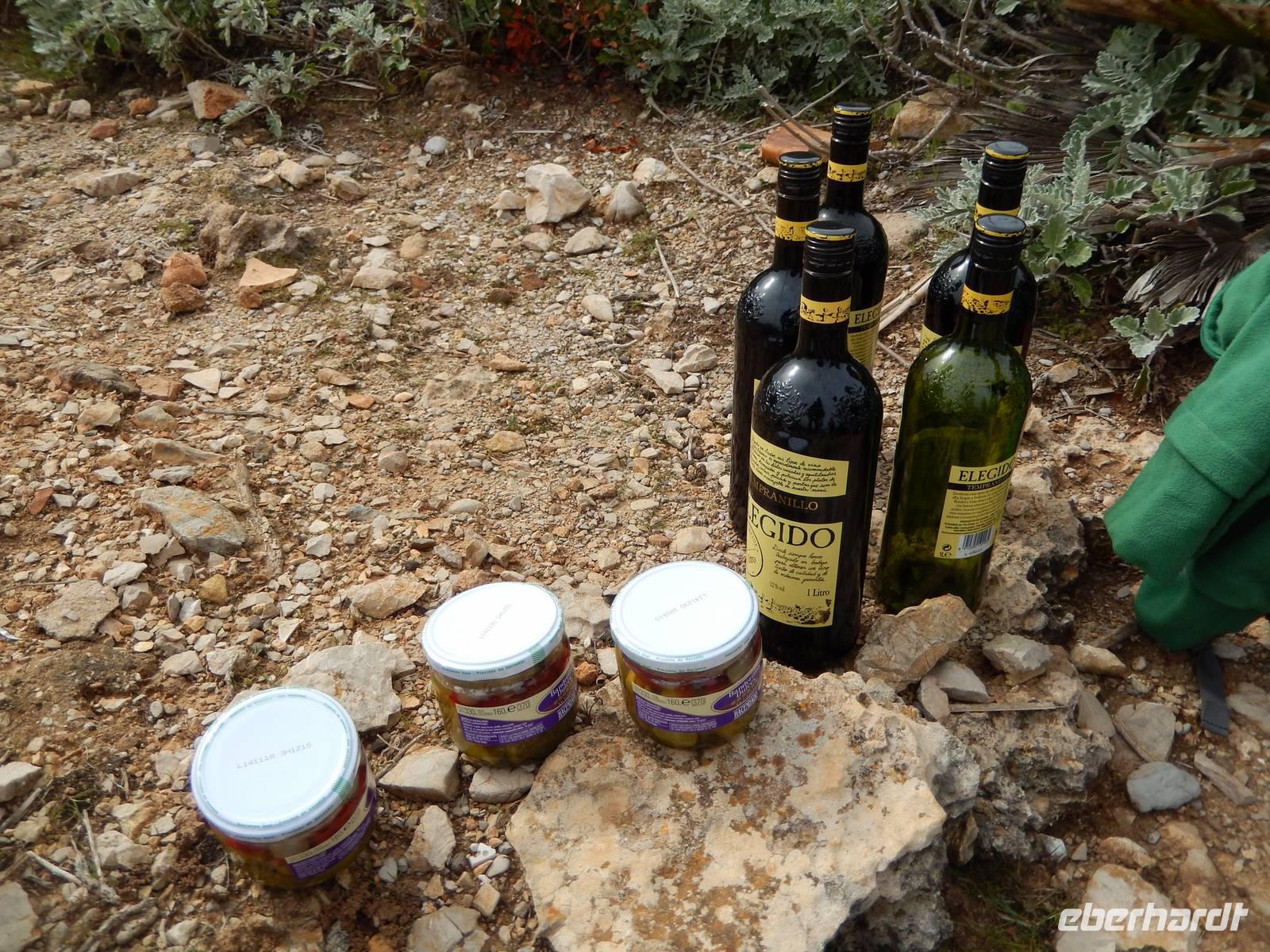 Da Isabel sich bestens als Einheimische auf der Insel auskennt, beschloss sie die Wanderung heute zu tauschen, da so der Aufstieg besser zu bewältigen war. So geht die Wanderung heute von der Cala Mesguida zur Bucht Cala Agulla und dann zur Cala Rajada. Da der Anstieg im Allgemeinen etwas schwierig ist, trennte sich heute die Wandergruppe. Ein Teil wählte den Auf- und Abstieg über den Berg und die andere Gruppe inklusive mir, wählte den Weg um den Berg herum. Die Wanderung startete in einer herrlichen Dünenlandschaft welche sich anscheinend immer weiter ausbreitet, da die Brücke, welche durch diese Landschaft führt, schon teilweise von der Düne eingenommen ist. Da wir heute viel Zeit hatten, konnten wir ganz in Ruhe laufen und uns alle Details der Umgebung näher betrachten. Da wir etwas zeitiger am Treffpunkt waren, suchten wir uns schon einmal einen geeigneten Platz für unser Picknick heraus. Dies war gar nicht so einfach, da der Wind erneut kräftig wehte. Nachdem drei geeignete Plätze gründlich analysiert wurden, entschieden wir uns für den Platz in der Bucht. Alle Leckereien wurden dann ausgepackt uns so gab es Oliven, Brot, Aioli, Chorizo, Schinken und Käse. Nachdem auch nach kurzer Suche die selbstgemachte Tomatensauce bei mir im Rucksack gefunden wurde, konnte das Festmahl beginnen. Dazu gab es 7 Flaschen Wein und etwas Wasser.