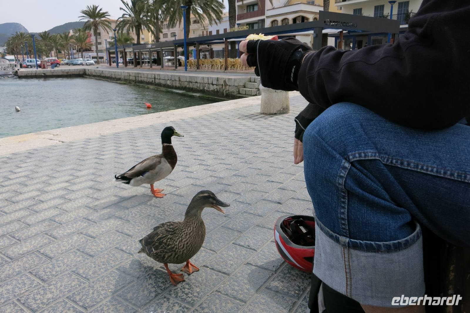 Die ersten Steigungen machten uns ganz schön warm, froh über eine Verschnaufpause rollten wir nach Pequera hinunter und an der Promenade entlang. Die Stadt erwachte erst langsam zum Leben und viele Geschäfte waren noch geschlossen. Wir waren ja auch nicht auf Einkaufsbummel sondern sportlich aktiv unterwegs. Auch nach Port D'Antratx kamen wir nur über eine weitere Klippe. Dann rollten wir hinunter zum Hafen und fanden einen schönen Platz um unsere Lunchpakete zu verspeisen.