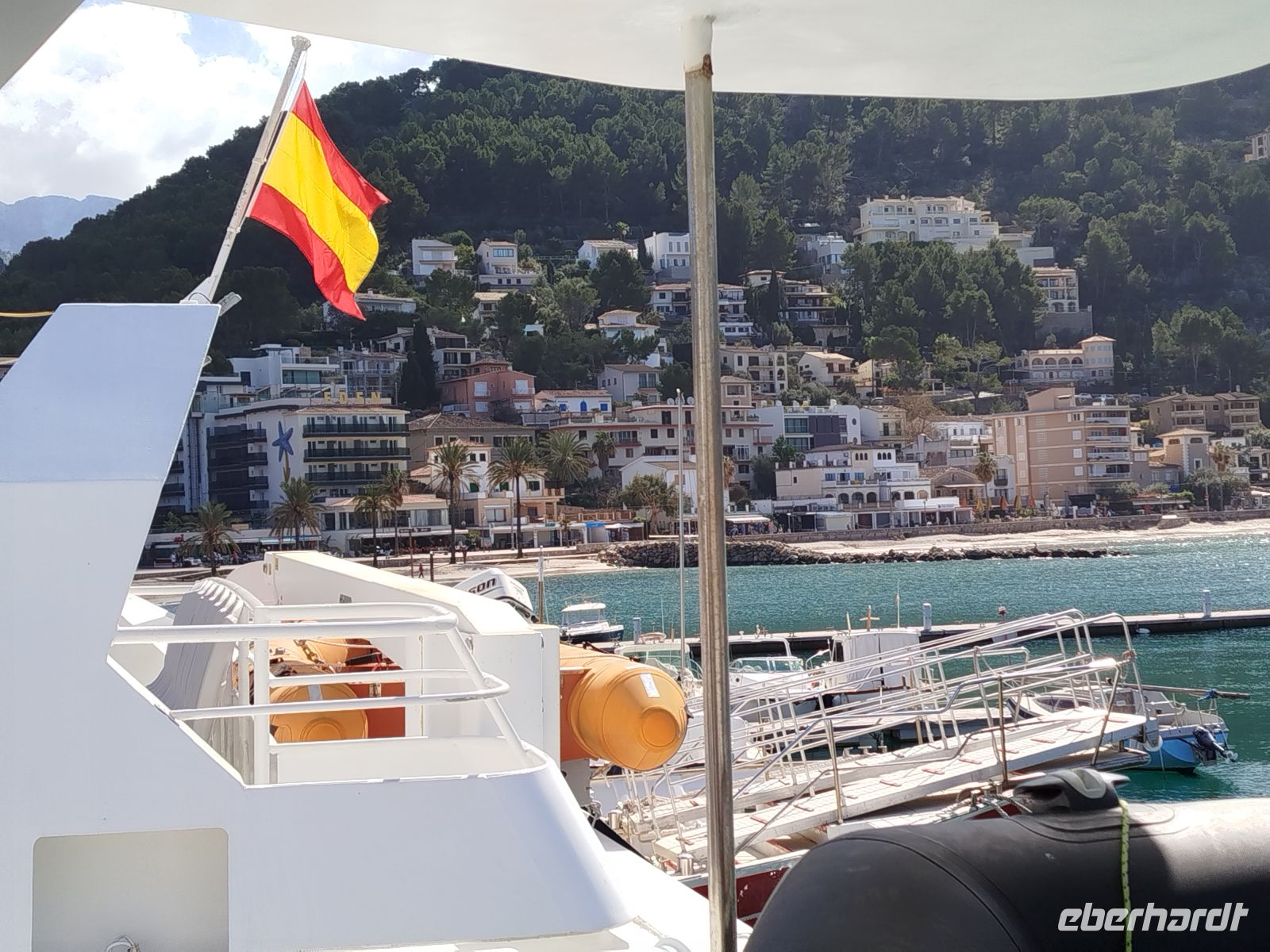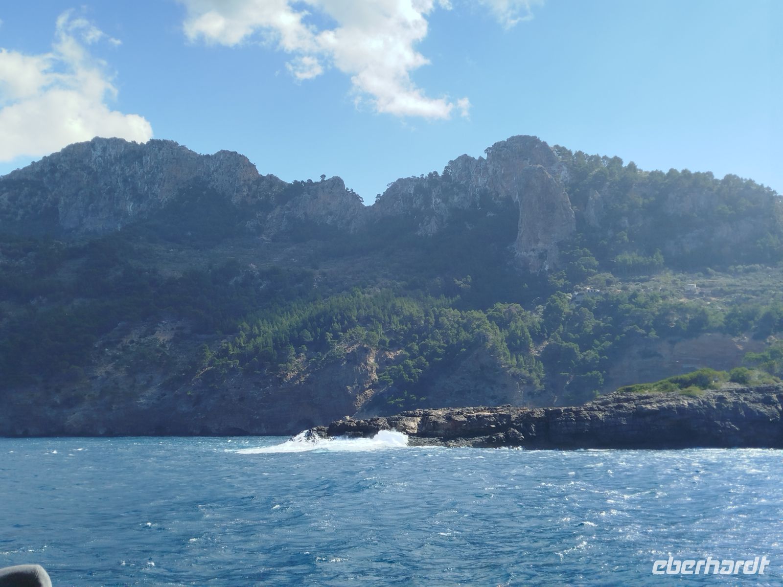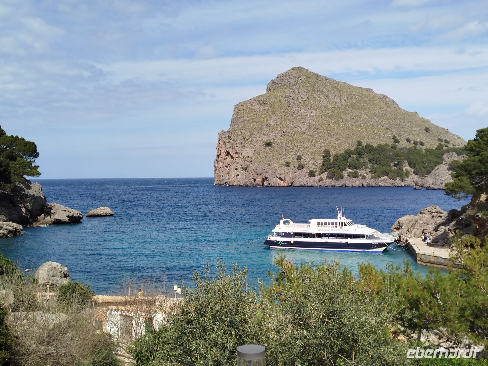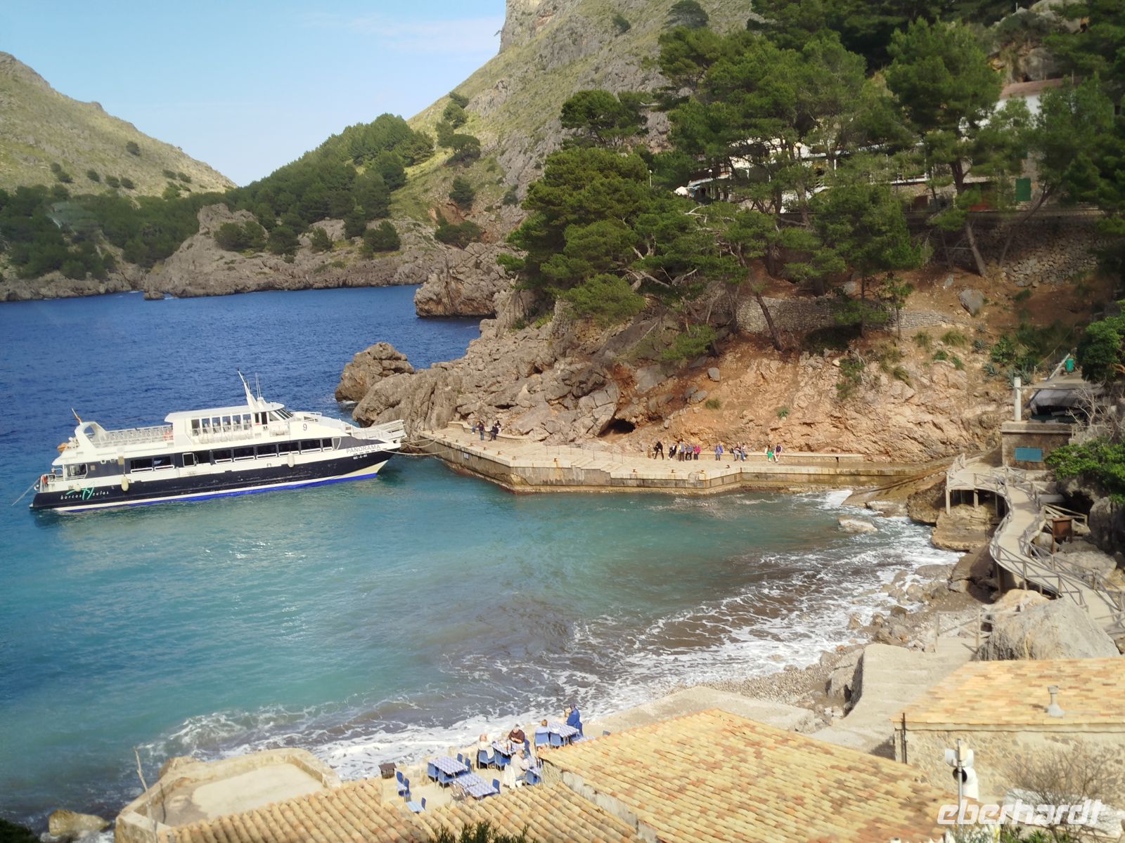 Der Bus brachte uns zum Touristen Bahnhof von Palma und da stand er auch schon, schnaufend ,auf uns wartend da.Die historische Eisenbahn "Roter Blitz" genannt. Sie brachte uns 27 km und durch 13 Tunnel fahrend nach Soller. Hier mußte der Umstieg in die alte Straßenbahn "Orangenexpress"schnell umgesetzt werden. Mitten durch die Stadt und Citrushaine gelangten wir nach Port de Soller. Zum bummeln blieb leider keine Zeit .Im Hafen lag schon unser Schiff zum "Auslaufen" bereit. Kurz nach dem Start mußten wir zurück in den Hafen, Motorschaden.Nur gut dass wir noch in Hafenweite waren und schnell drehen konnten.Ein neues Schiff wartete bereits auf uns und der Umstieg ging zügig voran. Das Meer war heute etwas rau und einige Gäste hatten ,trotz der herrlichen Küstentour,sehr darunter zu leiden. Das Anlegemanöver, in der Bucht von Sa Calobra, war auch etwas holprig aber gut zu schaffen. Wir entschlossen uns für einen kleinen Spaziergang. Durch ein Felstunnel erreichten wir eine romantische Schlucht (Torrent de Pareis ) ,die ,wenn das Meer mitspielt, unbedingt zum Baden einläd. Der Bus holte uns dann ab und es sollte hoch hinaus gehen. Wir bewältigten 800 m Höhenunterschied auf 12 Kilometer atemberaubender Serpentinenstraße,immer wieder mit Blick aufs Meer und die eizigartige Gebirgslandschaft. Antonio Parietti hieß der Schöpfer der ,1932 fertig gestellten, Panoramastraße.