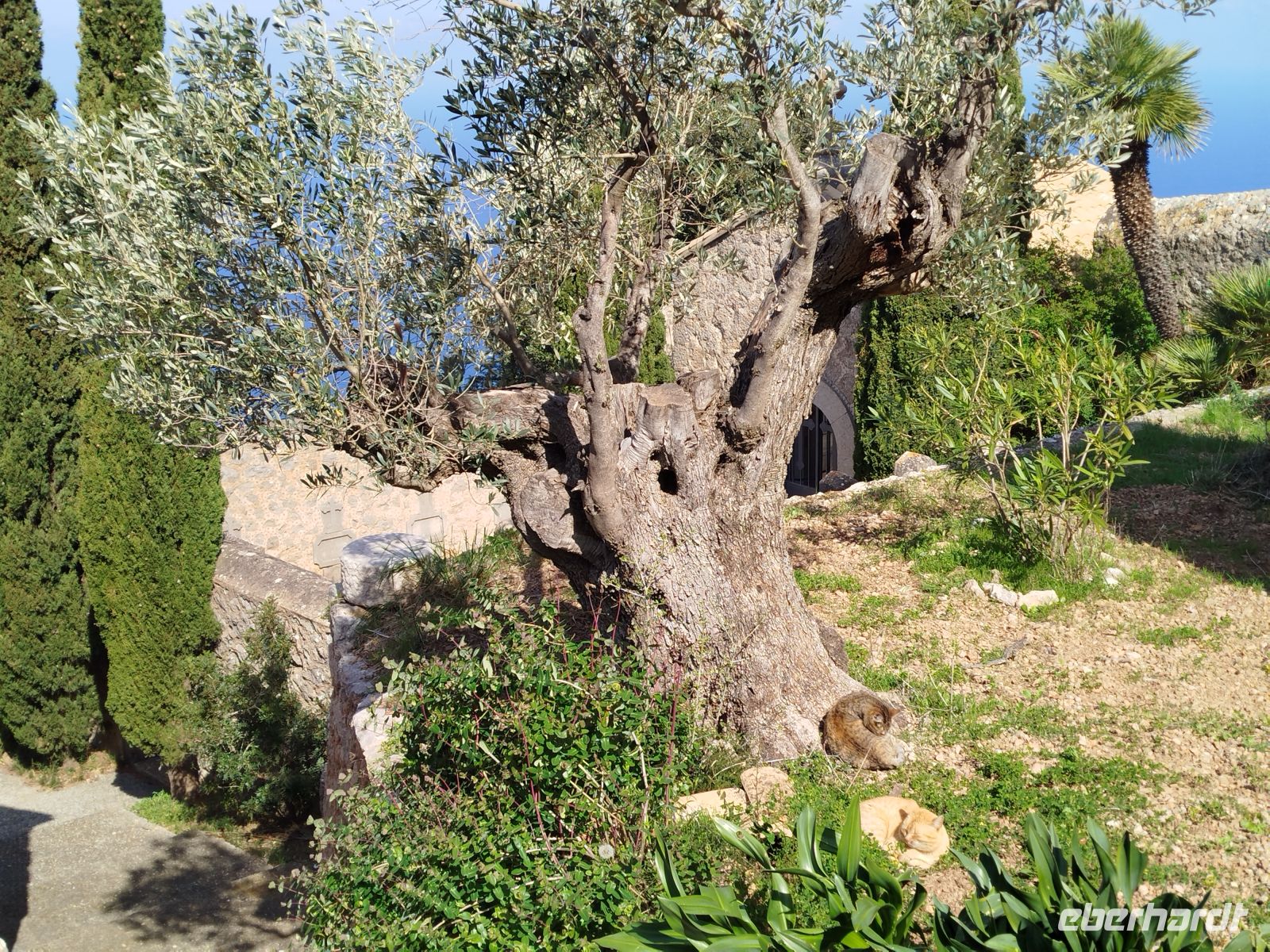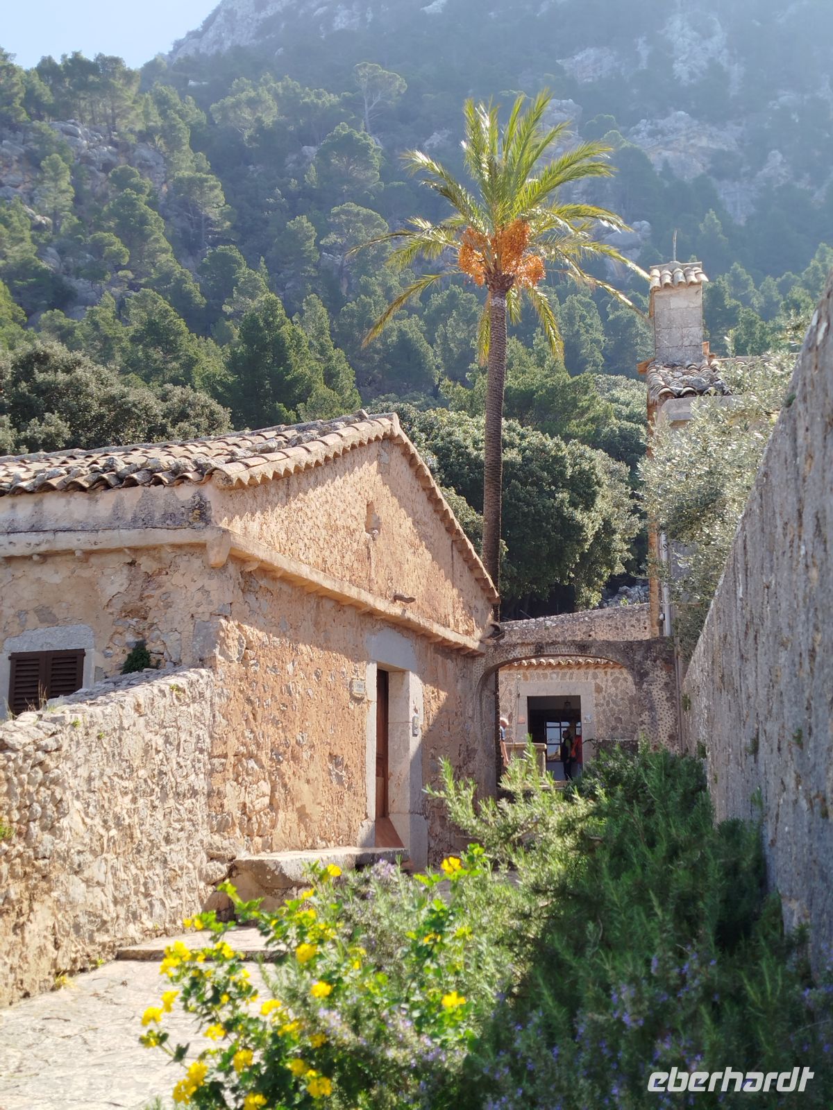 Auch heute ging es wieder in die Berge des Tramuntana (durch eine kleinen Versprecher "Taumata" genannt ).Wir fuhren hinauf nach Valldemossa und sahen schon von weitem das königliche Kartäuserkloster. Für den Bekanntheitsgrad sorgte Frederic Chopin und seine Gefährtin George Sand ,die hier, sehr unglücklich, einen Winter verbrachten. Uns zog es aber erst einmal zu einer,sehr romantisch gelegenen, Einsiedelei. Wir nutzten den Cami de Escolta und wanderten, durch einen wunderschönen alten Olivenhain ,zurück nach Valldemossa.Hier angekommen mußten wir unbedingt die hiesigen Leckereien probieren. Wir saßen im Straßencafe "Meriendas"und ließen uns hausgemachten Mandelkuchen und Coca Patata schmecken. So gestärkt bummelten wir durch die engen Gassen die, ganz im Zeichen des Gedenkens ,an die hier geborene Heilige Catalina Tomas,erinnern. Kleine Keramiktafeln an den Haustüren stellen Szenen ihres Lebens nach.