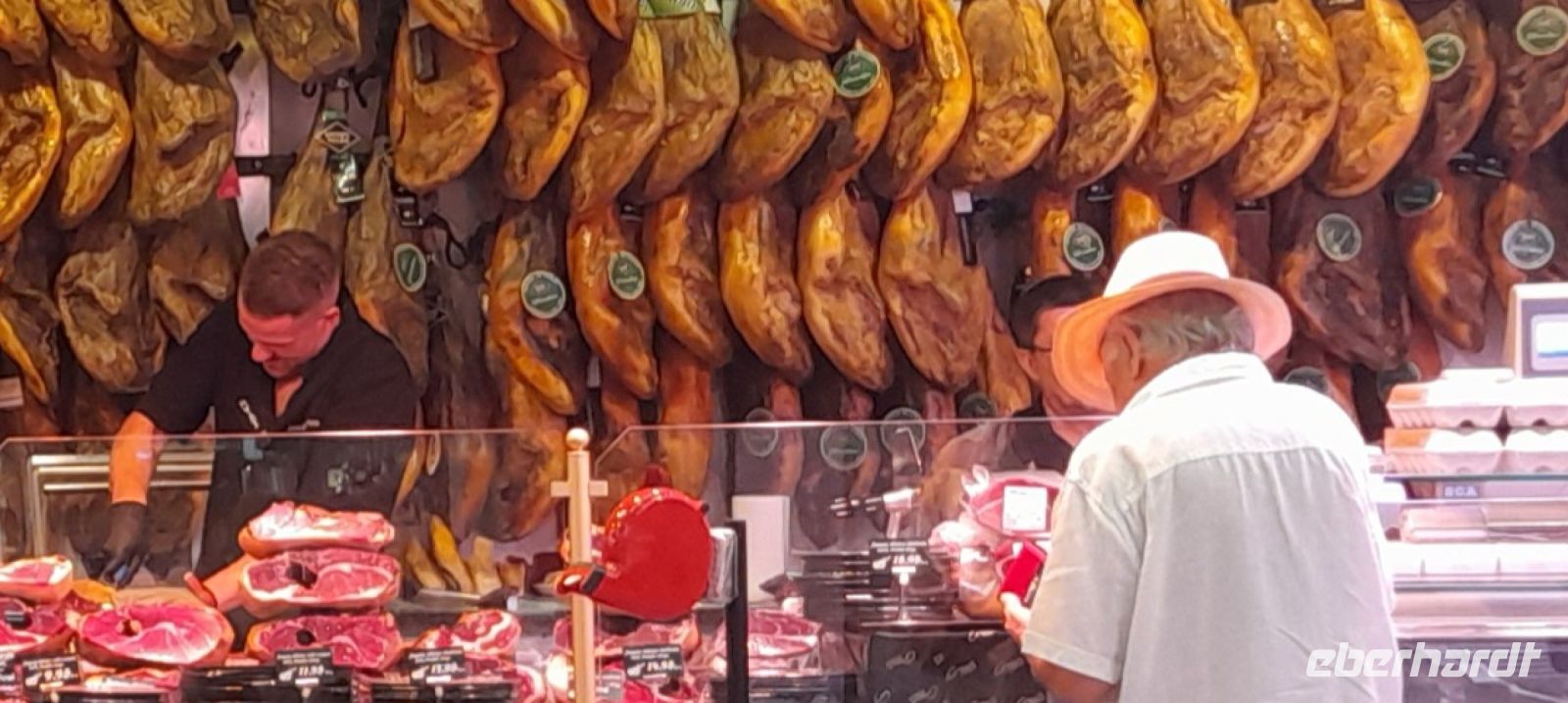 Beeindruckend in der Nachbarschaftshalle die zahllosen Schinken, die überall von der Decke hängen. Der wunderbare Serrano-Schinken wird in diversen Preiskategorien angeboten und natürlich kosten wir ihn - zusammen mit einem Glas Wein oder Sekt , köstlich! Viele decken sich mit "Mitbringseln" ein. Nach Verlassen dieses Gourmet-Tempels machen wir einen Bummel durch die Altstadt über den Plaza Mayor zum Rathaus und bis zur Kathedrale. Es gibt ja so viel zu sehen! Für einige Gäste bedeutet das : unbedingt wiederkommen!