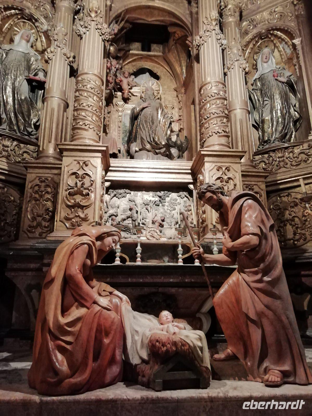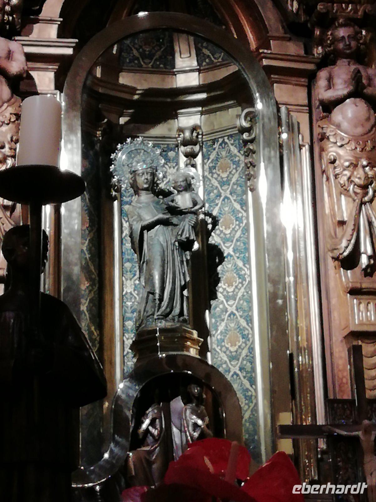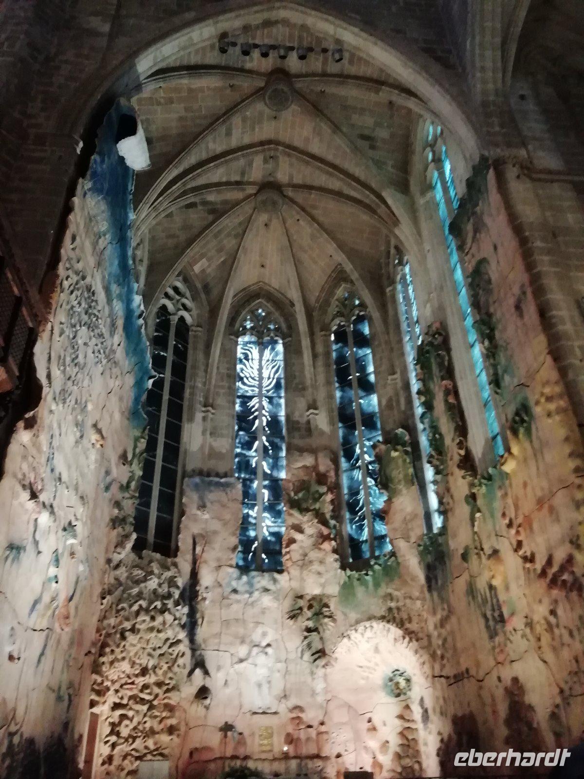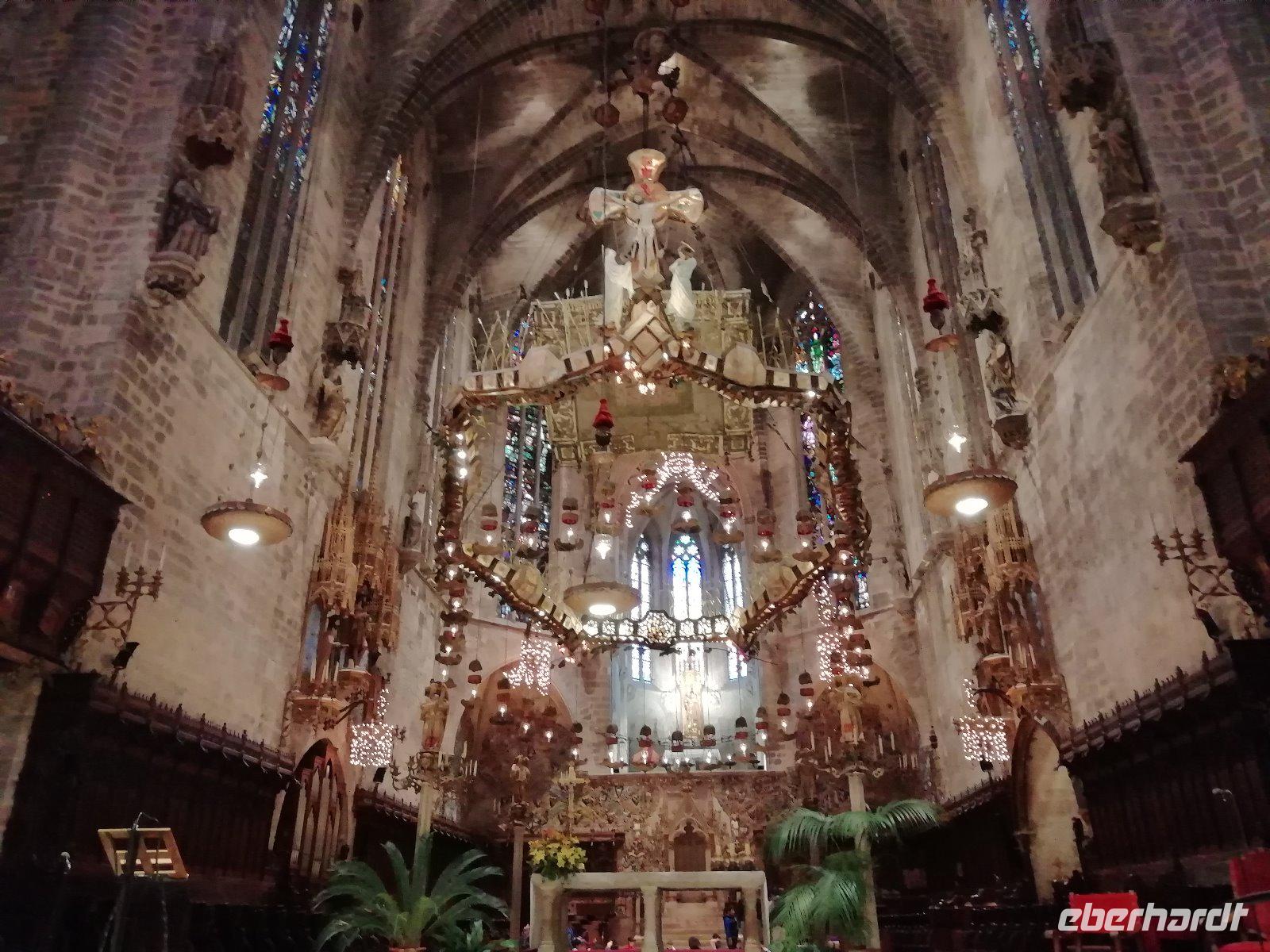 Sofort verstehen wir, warum man auch von der „Kathedrale des Lichtes und des Raumes" spricht. Immerhin ist sie 44 m hoch, 121 m lang und 39 m breit und hat 61 Kirchenfenster. Vor allem die Fensterrose über dem Triumphbogen beeindruckt, handelt es sich dabei doch um das größte gotische Kirchenfenster der Welt. Fast eine Stunde sehen wir uns um, entdecken dabei immer wieder interessante Details. Jetzt im Februar sind noch nicht so viele Touristen in der Kathedrale. Wir können uns alles in Ruhe anschauen, so auch die Werke von Antoni Gaudi und Miquel Barcelo.