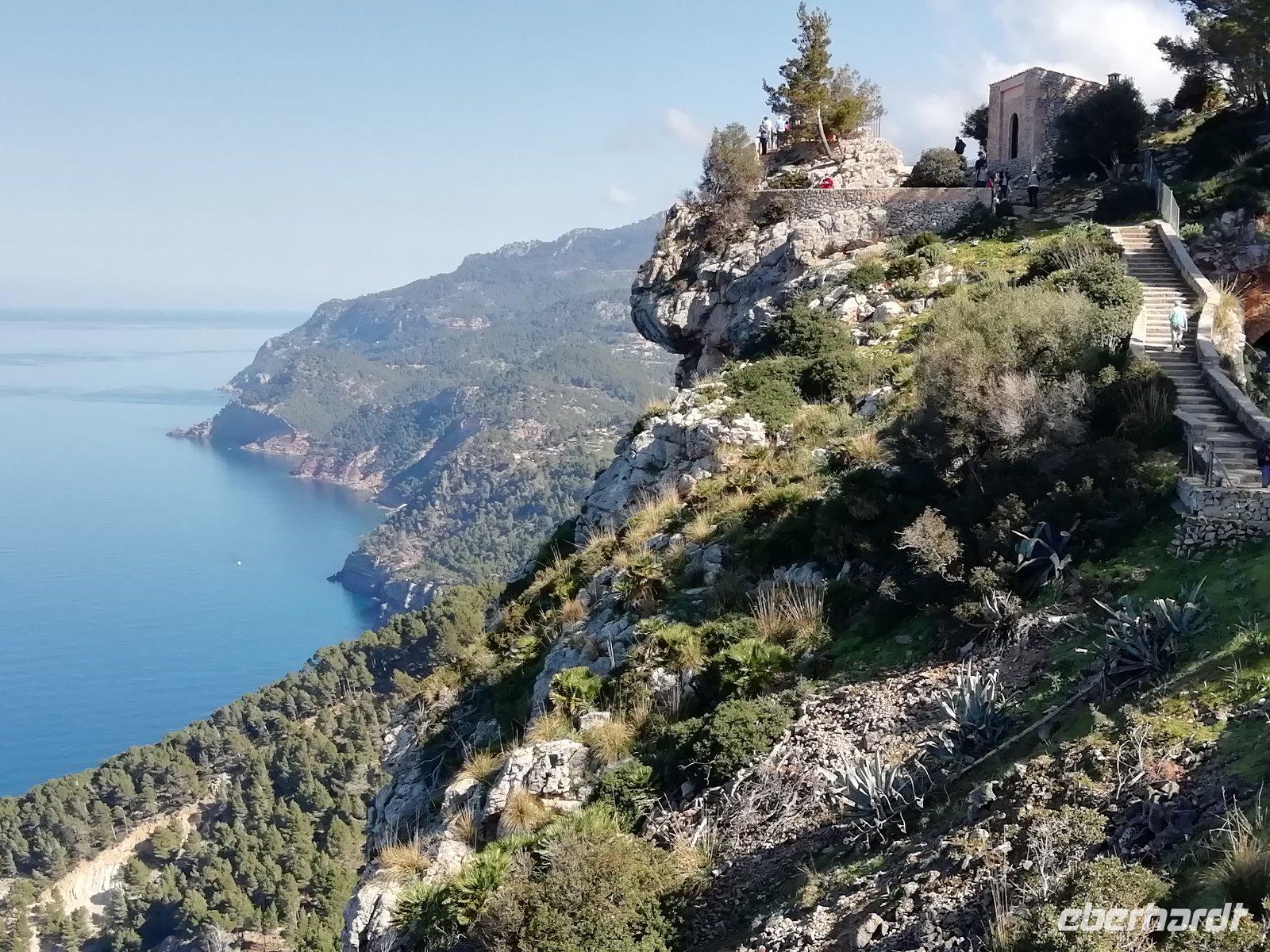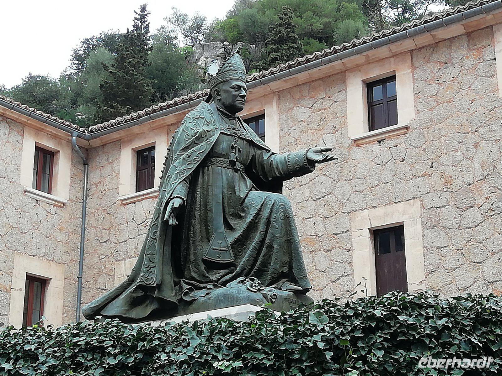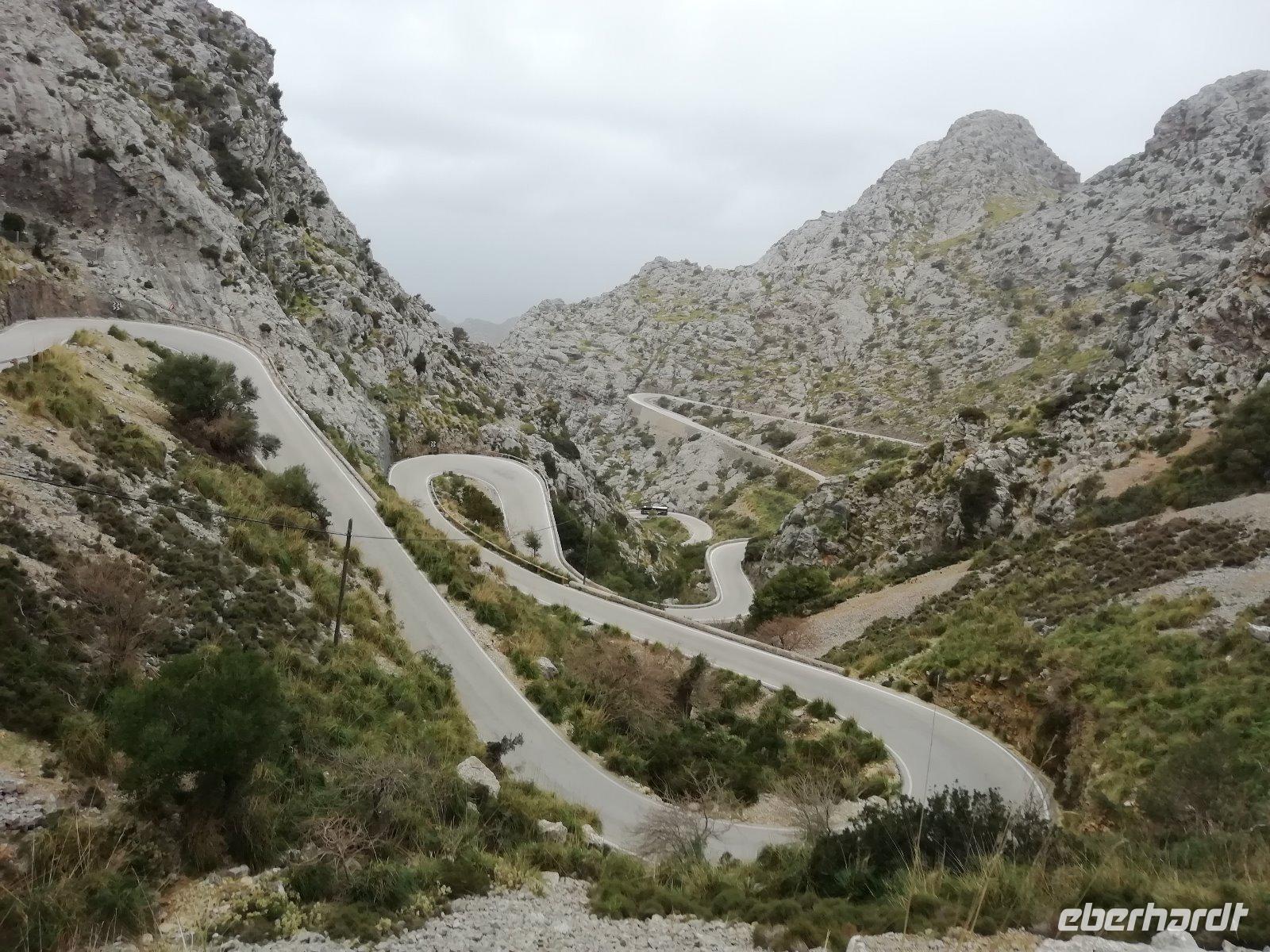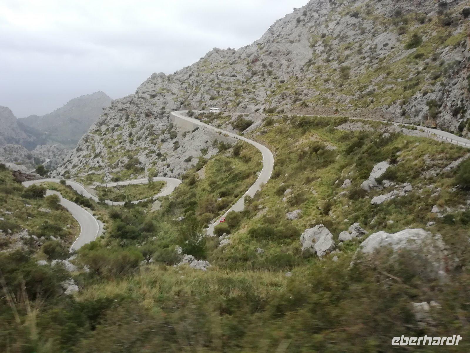 Einen Halt machen wir am Kloser Lluc. Bereits vor 700 Jahren stand hier eine erste Kapelle. Heute leben keine Mönche mehr im Kloster, aber es gibt eine Schule und einen sehr berühmten Knabenchor mit langer Tradition. Joan zeigt uns u.a. die Schwarze Madonna. Durch Steineichenwälder fahren wir weiter bergan und sehen den höchsten Berg der Insel. Der folgende Streckenabschnitt ist sehr spektakulär mit zahlreichen engen Kurven, die Namen wir „Krawattenknoten" und „Maria" tragen.