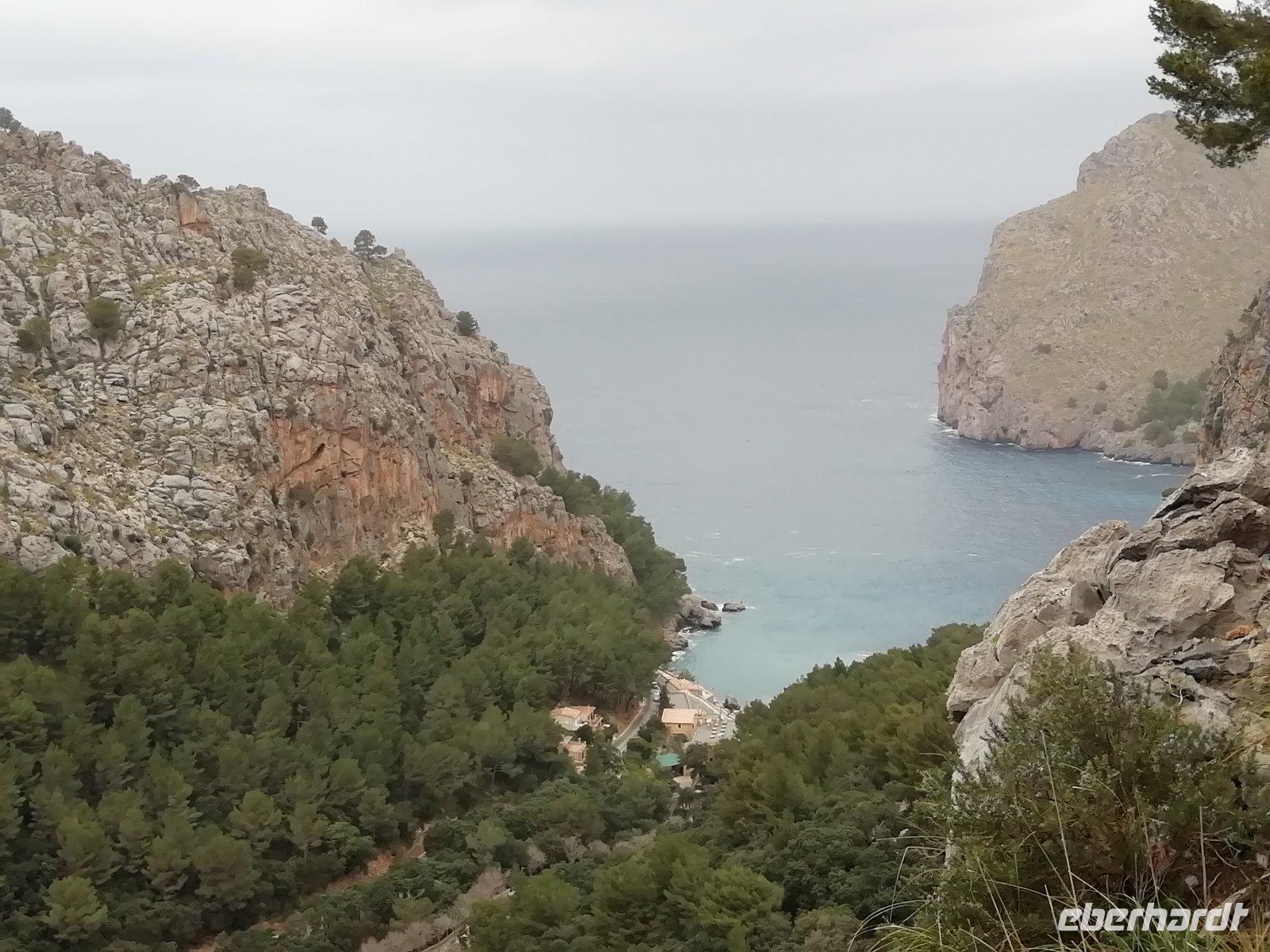 Gegen Mittag erreichen wir Sa Calobra. Das kleine Dorf ist aufgrund der schönen Badebucht, in welche der Sturzbach Torrent de Parais mündet, bekannt und beliebt bei Touristen. Die meisten Gäste von uns spazieren durch die beiden engen Felstunnel zu dieser „Klippenklemme". Danach kehren wir in das Lokal am Hafen ein. Bei der Rückfahrt von Sa Calobra hüllt sich das Gebirge anfangs in Nebel ein. Wir kommen an drei Stauseen vorbei und erreichen mit 900 Metern den höchsten Punkt unseres heutigen Ausflugs.
