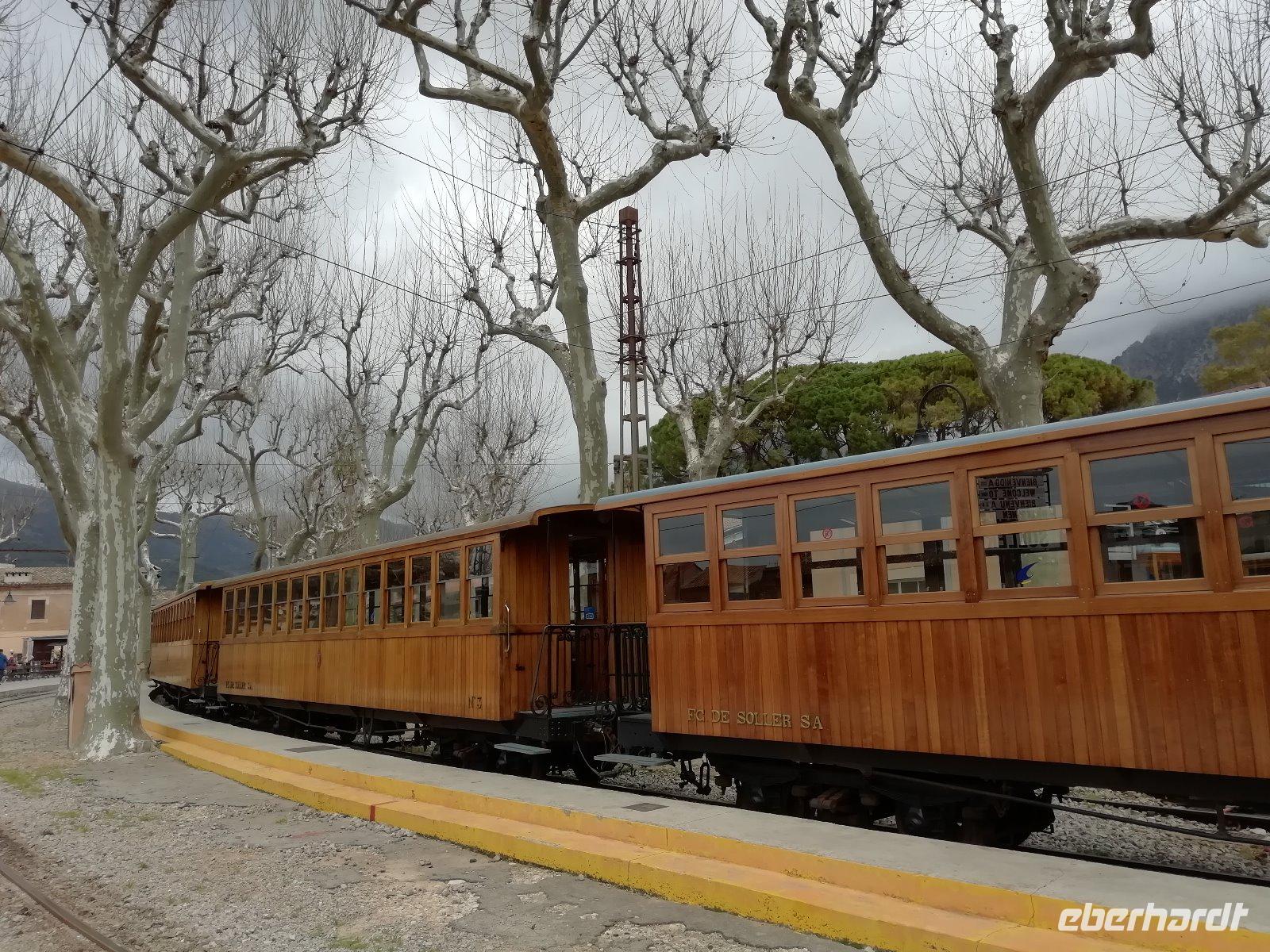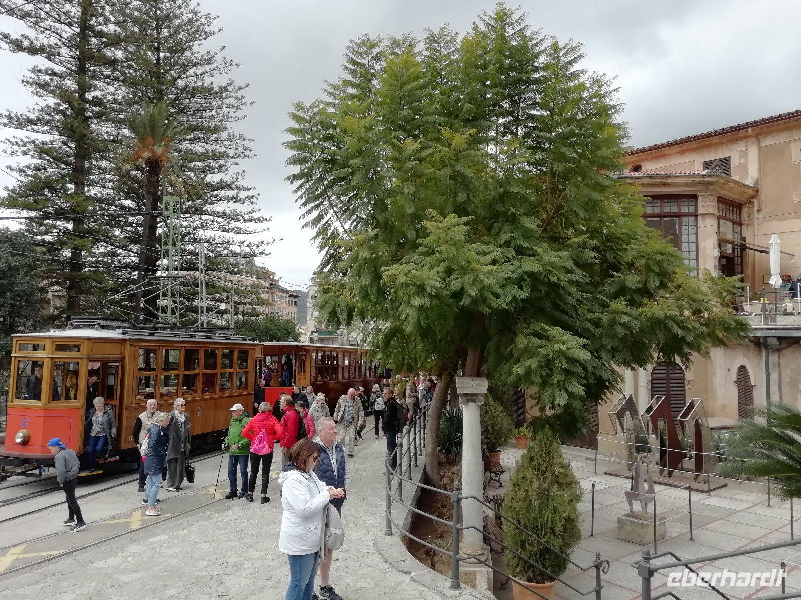 In Port de Soller wechseln wir das Verkehrsmittel. Auf uns wartet ein echter Oldtimer: eine Straßenbahn von 1913. Sie bringt uns nach Soller. Die meisten spazieren hier zum Marktplatz, um die Pfarrkirche Sant Bartomeu zu fotografieren. Dann heißt es wieder Einsteigen - diesmal in den „Roten Blitz". So nennt man die historische Eisenbahn, die bereits seit 1912 fährt. Gedacht war sie anfangs für den Transport von Orangen. Heute fährt fast jeder Mallorca-Tourist einmal mit dieser Bahn. Die Strecke führt zuerst durch Orangen- und Zitronenplantagen, später über 2 Brücken und durch 13 Tunnel. Teilweise hat man einen sehr schönen Blick auf Soller. In der Nähe der Inselhauptstadt wartet wieder der Bus und bringt uns zurück zum Hotel.