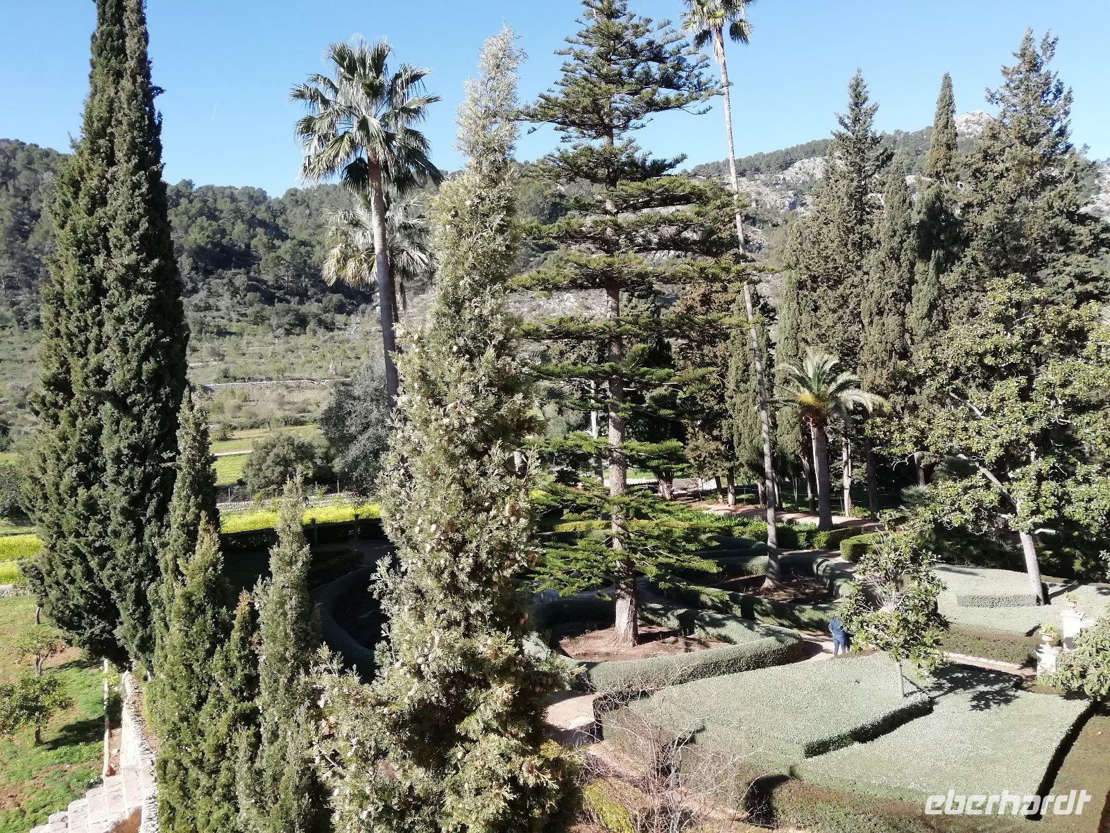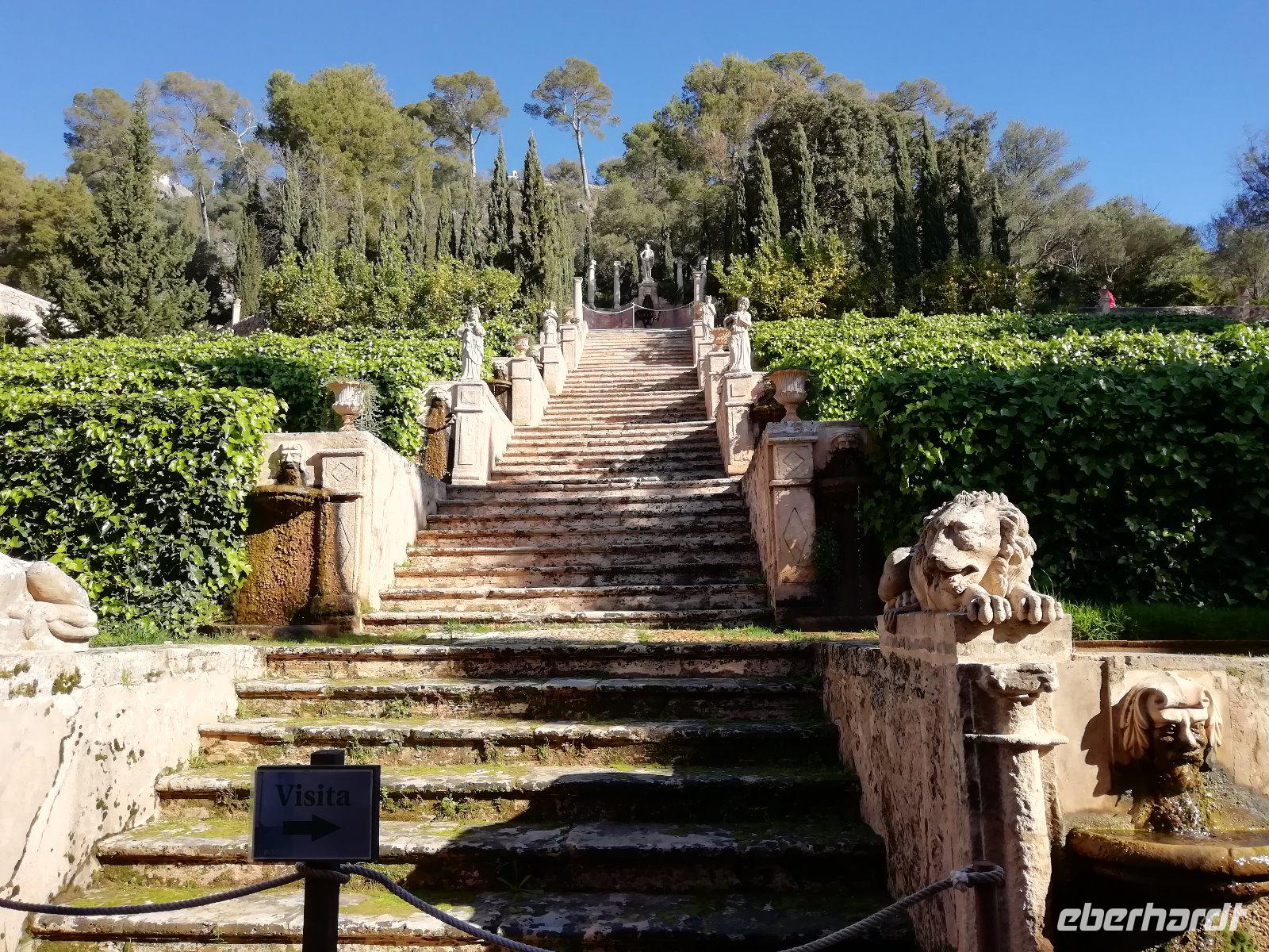Auch heute erwartet uns ein sonniger Tag. Wir fahren zuerst entlang der Hafenpromenade von Palma, wo Fischerboote, unzählige Jachten, Fähren und Kreuzfahrtschiffe liegen. Über die Landstraße und zuletzt recht holprig durch einen Olivenhain geht es nach Raixa. Es handelt sich dabei um ein Landgut islamischen Ursprungs. Im Eingangsgarten werden wir unter dem Erdbeerbaum empfangen und erhalten einen kleinen geschichtlichen Überblick. Dann besichtigen wir das Herrenhaus, erfahren, wie einst die Insel entstand, genießen den Blick vom Balkon und fotografieren die große Treppe. Wir spazieren zum Wasserbecken mit den großen Fischen und durch den Garten. Überall gibt es schöne Fotomotive, denn um das Anwesen herum blühen die Mandelbäume weiß-rosa und der Raps kräftig gelb.