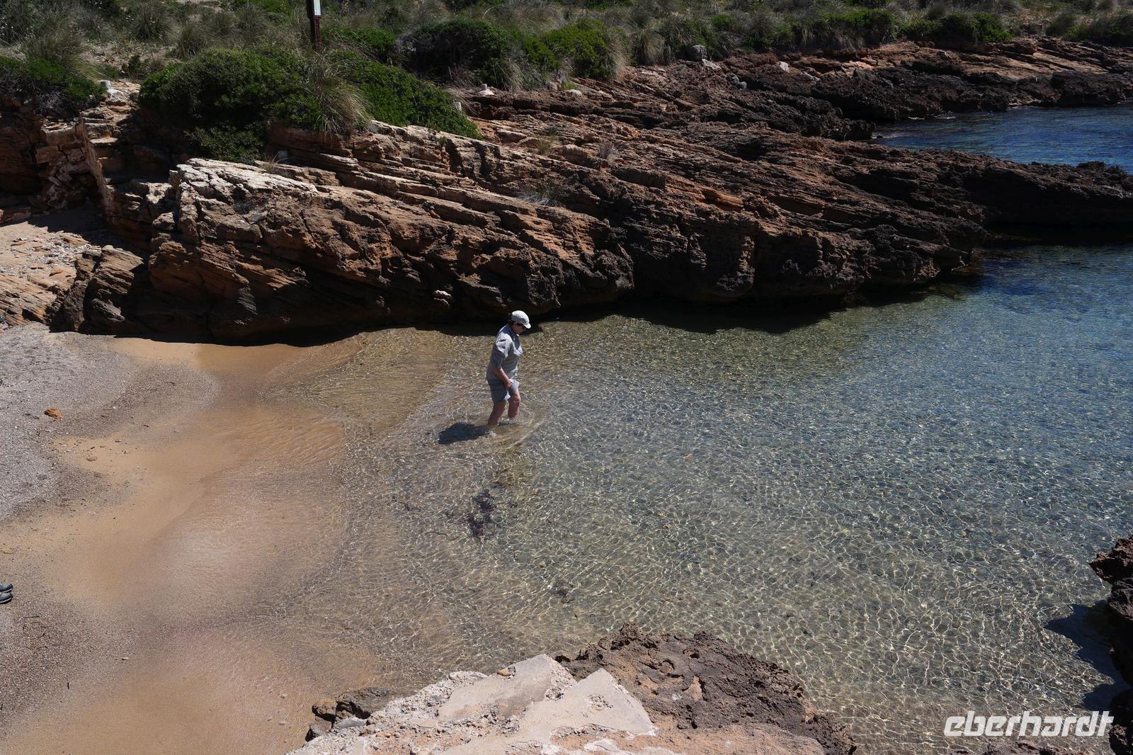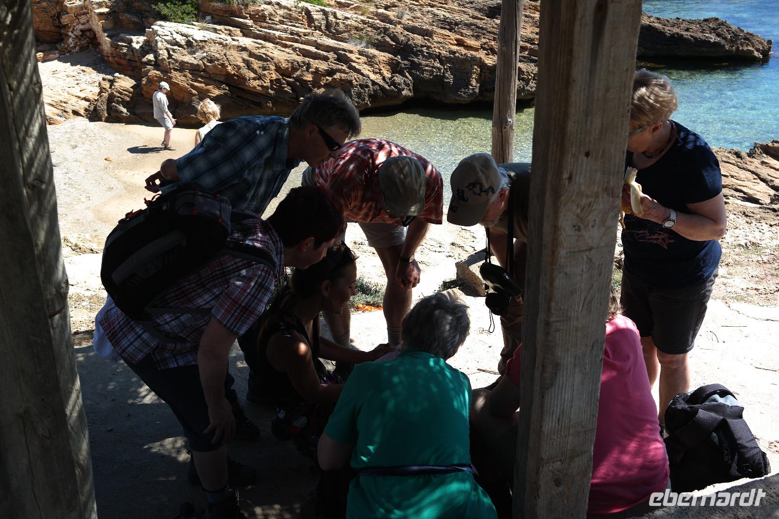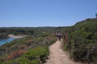 Die Sonne und unsere Nicole strahlen wieder um die Wette - auch wir sind tatendurstig und folgen ihr zunächst an den Strand von Sant Tomas. Wegen der starken Sonne entscheiden wir uns für die „schattigere" Variante, also nicht direkt der Küstenlinie folgend sondern etwas landeinwärts durch kleine Wälder, über Wiesen und Felder. Beim Baden in der Bucht von Trebalùger entdecken wir Tausende von kleinen winzigen blauen Segelquallen. Im getrockneten Zustand hatte uns Nicole diese Winzlinge schon einmal gezeigt, die von den Fischern gerne als Köder genommen werden. Über dem blauen Fuß mit winzigen Tentakeln erhebt sich ein durchsichtiges Segelchen - so schaffen es die Winzlinge von der italienischen Küste bis nach Menorca. Die frische, salzhaltige Luft und das anspruchsvolle Terrain machen Appetit - wir stärken uns unterwegs und kehren am Nachmittag in eine kleine Strandbar in Cala Caldana zur Kaffeezeit ein. Einige Wanderer baden noch einmal in der weiten Bucht, andere stärken die Wirtschaftskraft der Insel .