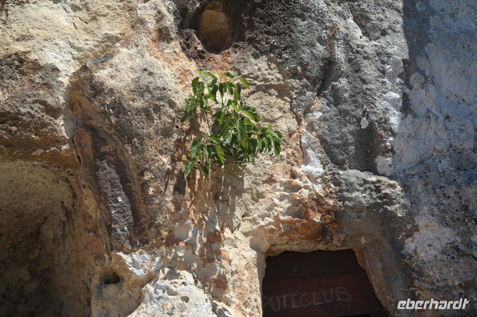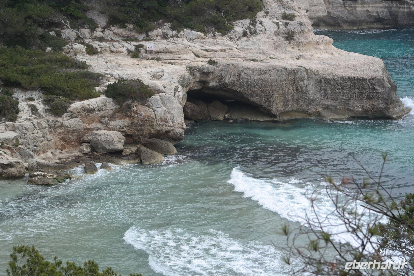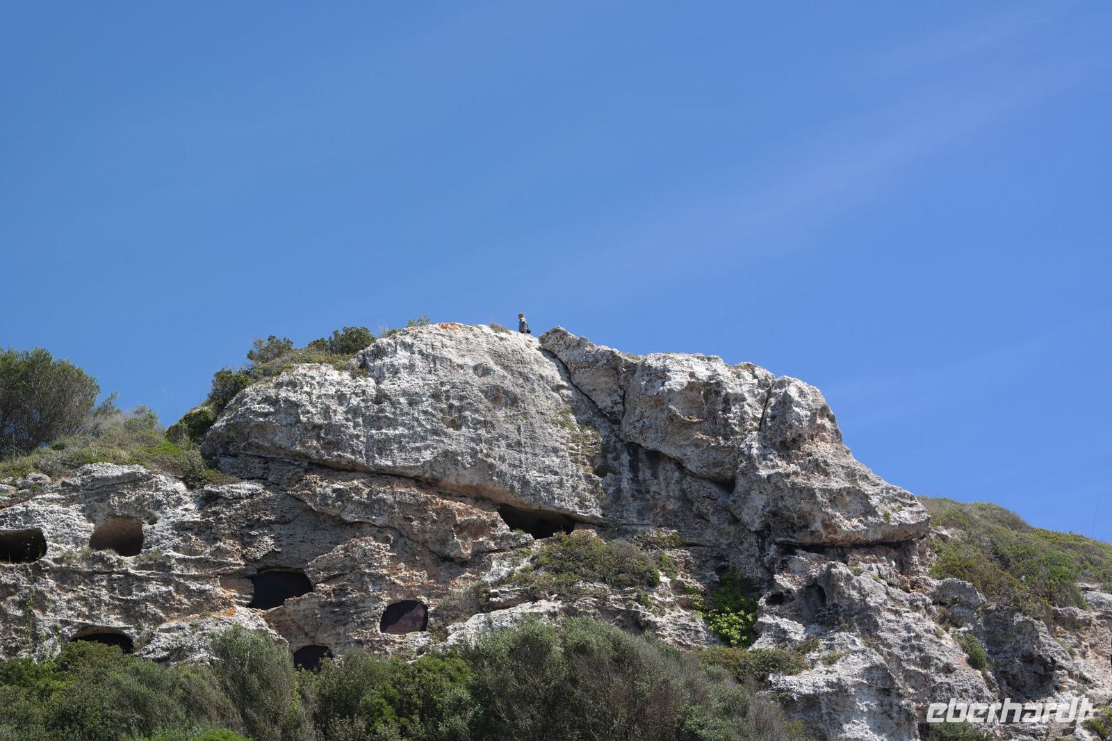 In der Bucht von Cales Coves bestaunen wir die größte Grabhöhle aus der talaiotischen Epoche - sie diente tausende Jahre später den Einheimischen als Zufluchtsstätte vor Piraten und den Piraten und Schmugglern als Versteck, selbst Hippies in den 70ern hausten hier - weil heute alle auf der Insel ordentliche Häuser und Wohnungen haben, kommen nur noch Wanderer. In der Bucht von Es Canutells entdecken wir weit oben über der Bucht kleine Höhlen - und müssen diese auch noch erforschen. Dazu entsenden wir Nicole und 2 wagemutige Wanderer (die anderen werden noch gebraucht ), die den steilen Weg erklimmen. Andere baden in der Bucht bei ca. 80 cm Wassertiefe - ja, wo ein Wille ist - da ist auch ein Weg. In einer kleinen Tapas-Bar erfrischen wir uns und sind recht froh, als uns unser Bus zurück zum Hotel bringt. Es war heute die „Königsetappe".