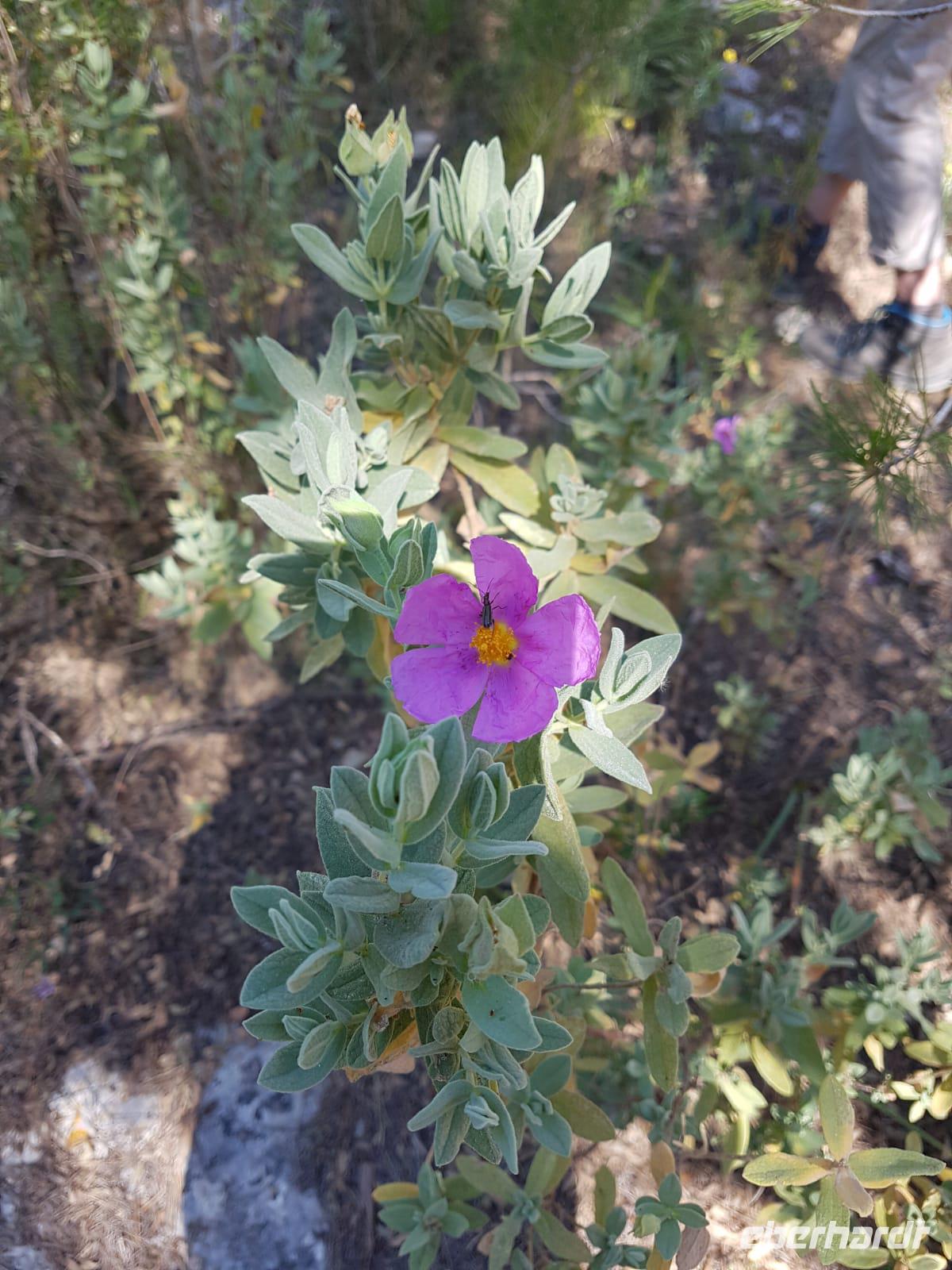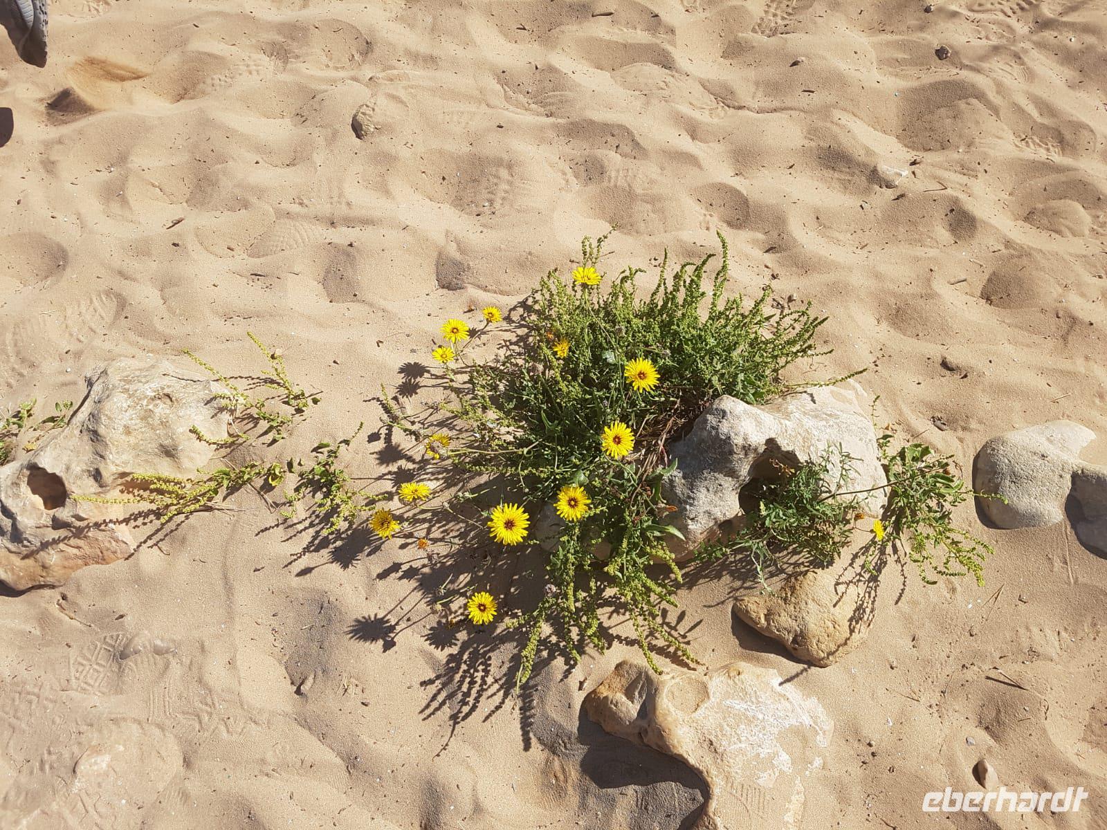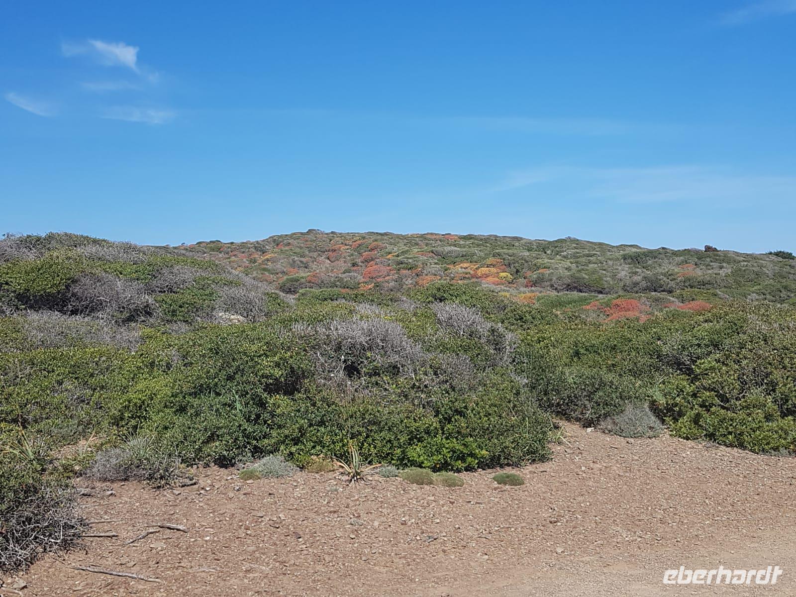 Isabel zeigt uns das Schneidegras aus dem die hübschen Dächer der Sonnenschirme am Strand gemacht sind. Wir entdecken Zistrosen, eine uralte Steineiche und sogar einen wilden Erdbeerbaum.