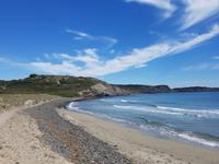 Um 8.00 Uhr erscheinen alle pünktlich und gut gelaunt zum Frühstück. Nachdem wir alle unsere Lunchpakete in Empfang genommen haben, fahren wir mit dem Bus voller Erwartungen nach Binimel lá. Ein wunderschöner Strand erwartet uns. Anfangs treffen wir keine Menschenseele. Wir sind wohl die einzigen, die am Samstagabend artig früh zu Bett gegangen sind, um für unseren 1.Wandertag fit zu sein. Es ist sehr stürmisch. Isabel warnte uns schon am Abend zuvor vor dem Nordwind. Alle sind begeistert von den ersten Eindrücken. Ständig werden die Fotoapparate und Handys herausgeholt. Hinter jeder Biegung entdecken wir ein noch schöneres Motiv, welches noch unbedingt verewigt werden muss und dennoch sind wir uns alle einig, die Realität ist viel viel schöner. Das erleben eines Momentes ist viel schöner, als ein Foto. Ein Foto kann niemals ein wahres Bild wiedergeben. Es fehlt das drum herum, der Wind, die Gerüche und das Gefühl im Herzen, das man hat, wenn man durch so eine schöne Landschaft läuft. Isabel bleibt immer wieder stehen, damit wir die Stimmung in Ruhe aufnehmen können und erzählt uns von den Sträuchern und Büschen. Denn Bäume sehen an der Nordküste, aufgrund des starken Windes wie Büsche aus, auch die Pinien. Viele verschiedene Blumen blühen am Wegesrandes. Wir werden davon überzeugt, dass nirgends sonst auf der ganzen Welt Kamille so ein starkes Aroma hat, wie hier auf dieser Insel. Sie zeigt uns den Sandstein „Marés", vieles auf dieser Insel ist aus diesem Stein gebaut. Isabel erzählt uns auch von der hohen Kunst, die Steinmauern zu bauen, die man überall auf der Insel sehen kann. Es ist ein seltener und angesehener Beruf, nicht viele beherrschen ihn. Die Steine werden so aufeinandergesetzt, das sie ohne weiteres Material halten, kein Beton oder ähnliches was die Steine zusammenhält.