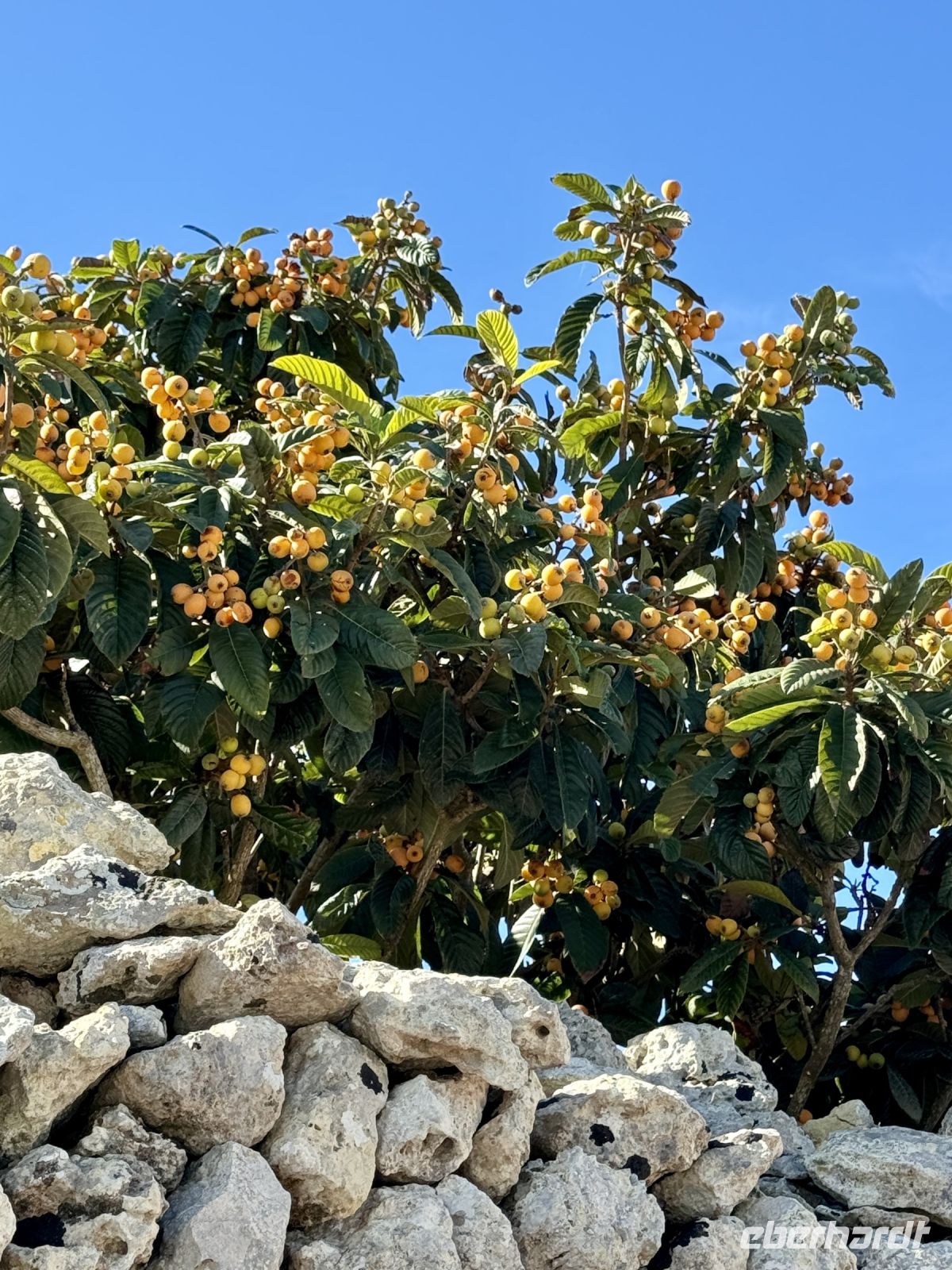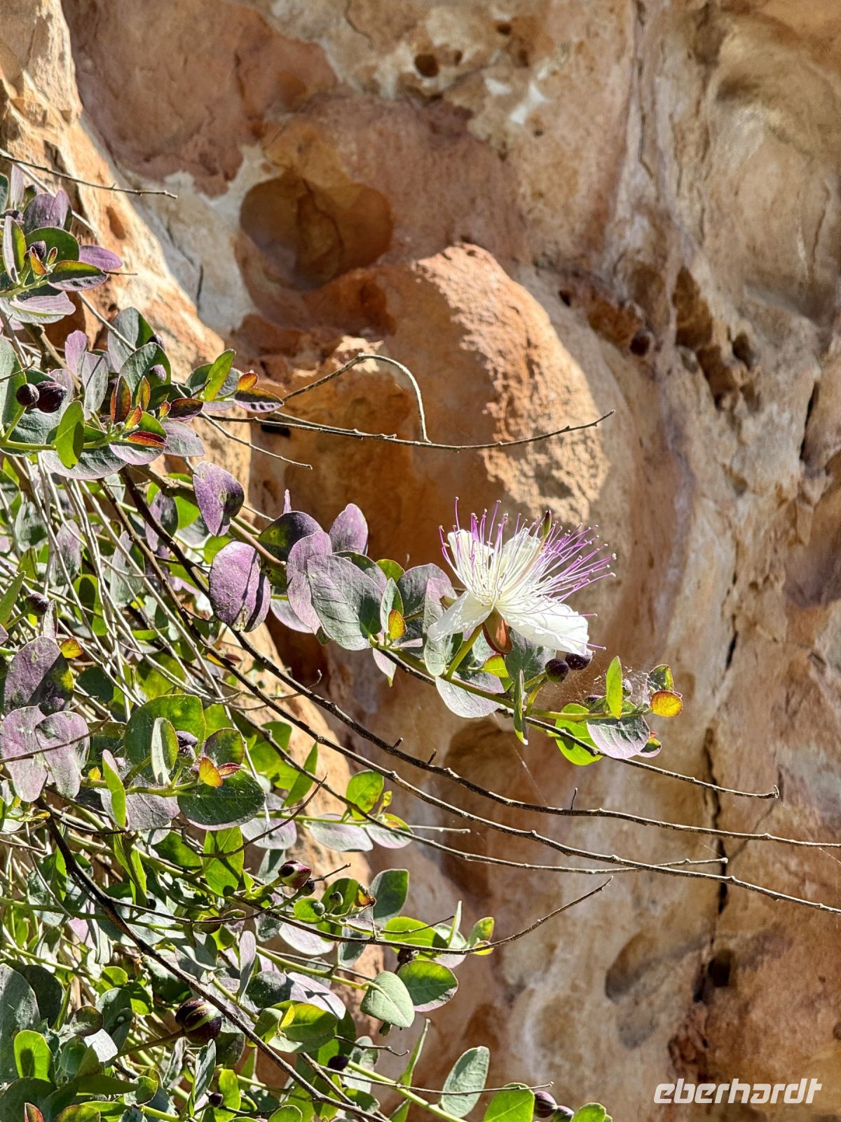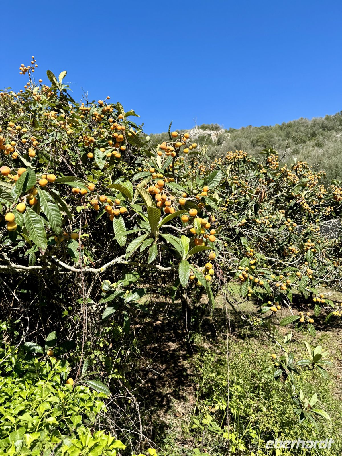 Gut gestärkt starten wir mit dem Bus Richtung Cala en Porter an die Südküste im südöstlichen Teil der Insel. Zunächst genießen wir den herrlichen Ausblick auf die Bucht von oben. Sie ist links und rechts von hohen Felsen eingeschlossen und wir wandern später auf der unbebauten westlichen Seite der Bucht im Naturschutzgebiet, welches bis zur Bucht Cala de Llucalari reicht. Unser heutiges Ziel ist Son Bou und laut dem Cami de Cavalls-Wegweiser erwarten uns 8 Kilometer Wanderweg. Links und rechts des Weges passieren wir nun zahlreiche Obstgärten voller Mispelbäume, deren Früchte gerade verlockend reif an den Bäumen hängen. Der heutige Wanderweg beinhaltet einige leichte An- und Abstiege. Wir sehen blühende Kapernsträucher und Kakteen am Wegesrand und genießen weite Ausblicke ins fruchtbare Tal. Die letzten Kilometer wandern wir gerade Strecken in luftiger Höhe. Etwa einen Kilometer vor Son Bou erreichen wir die unberührte und „versteckte“ Cala Llucalari. An diesem traumhaften, stillen Ort verbringen wir unsere Mittagspause.