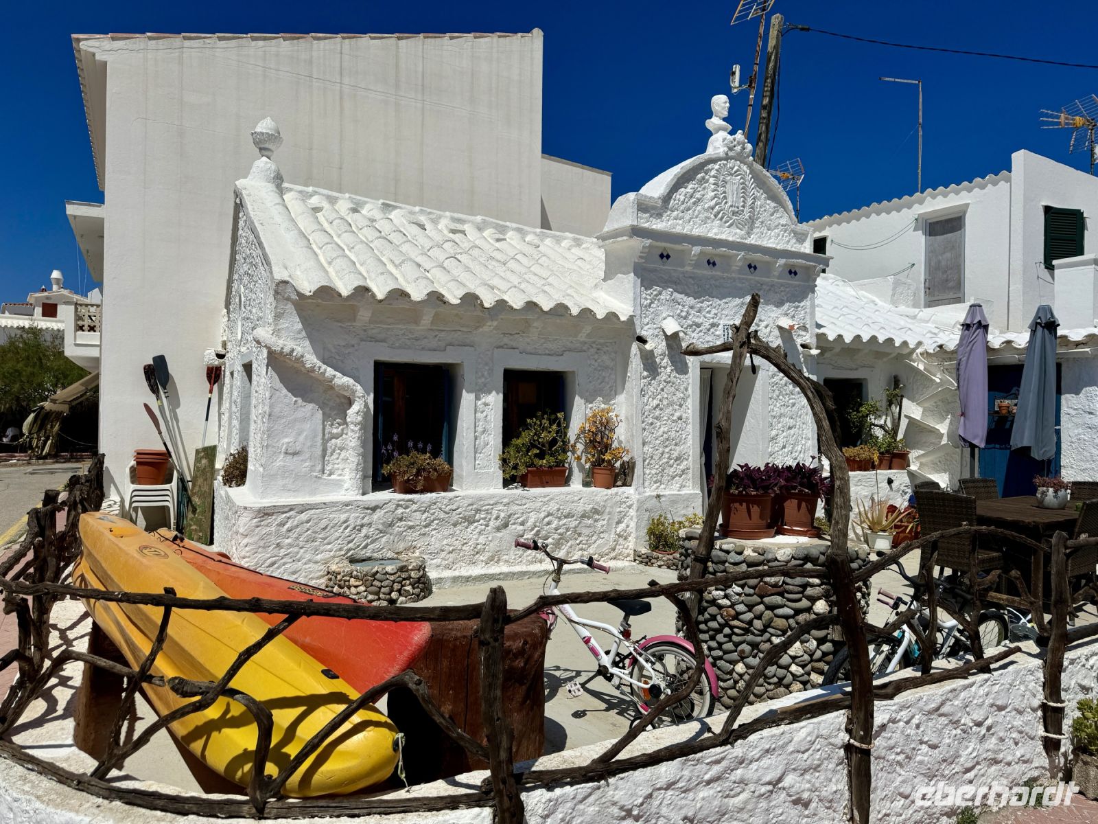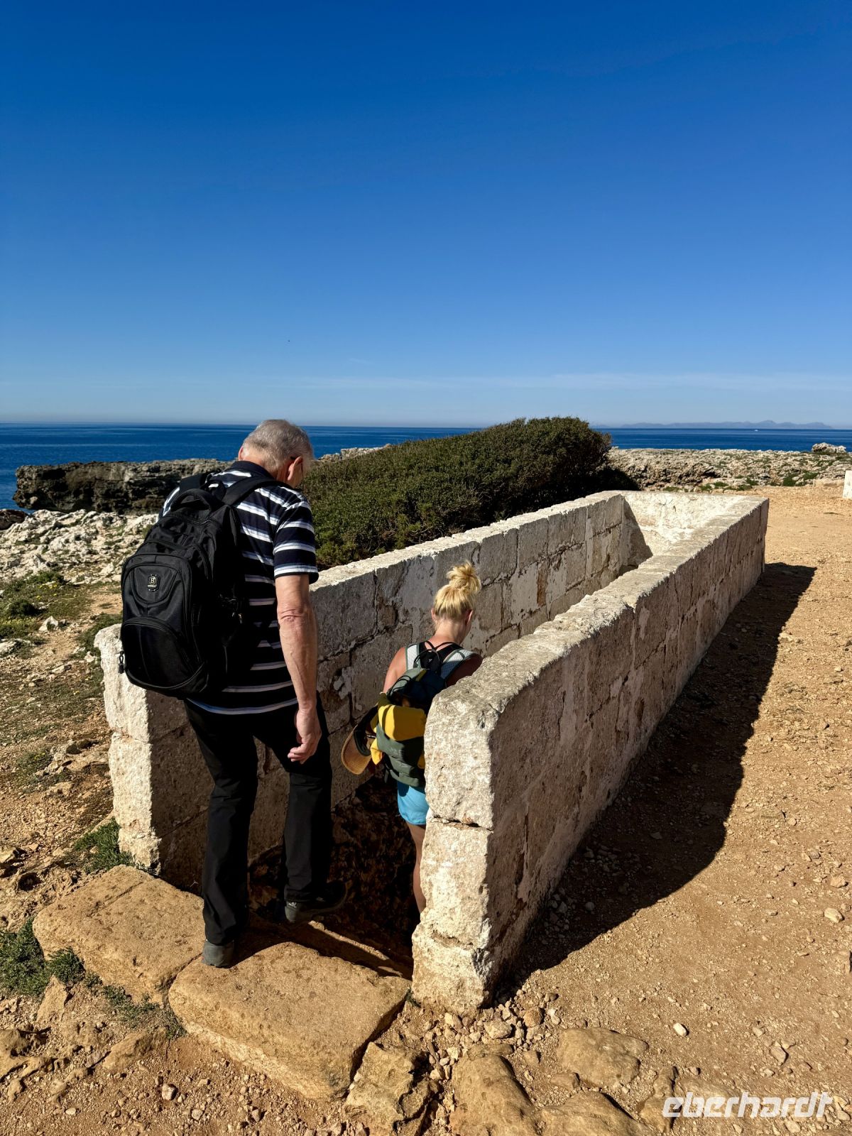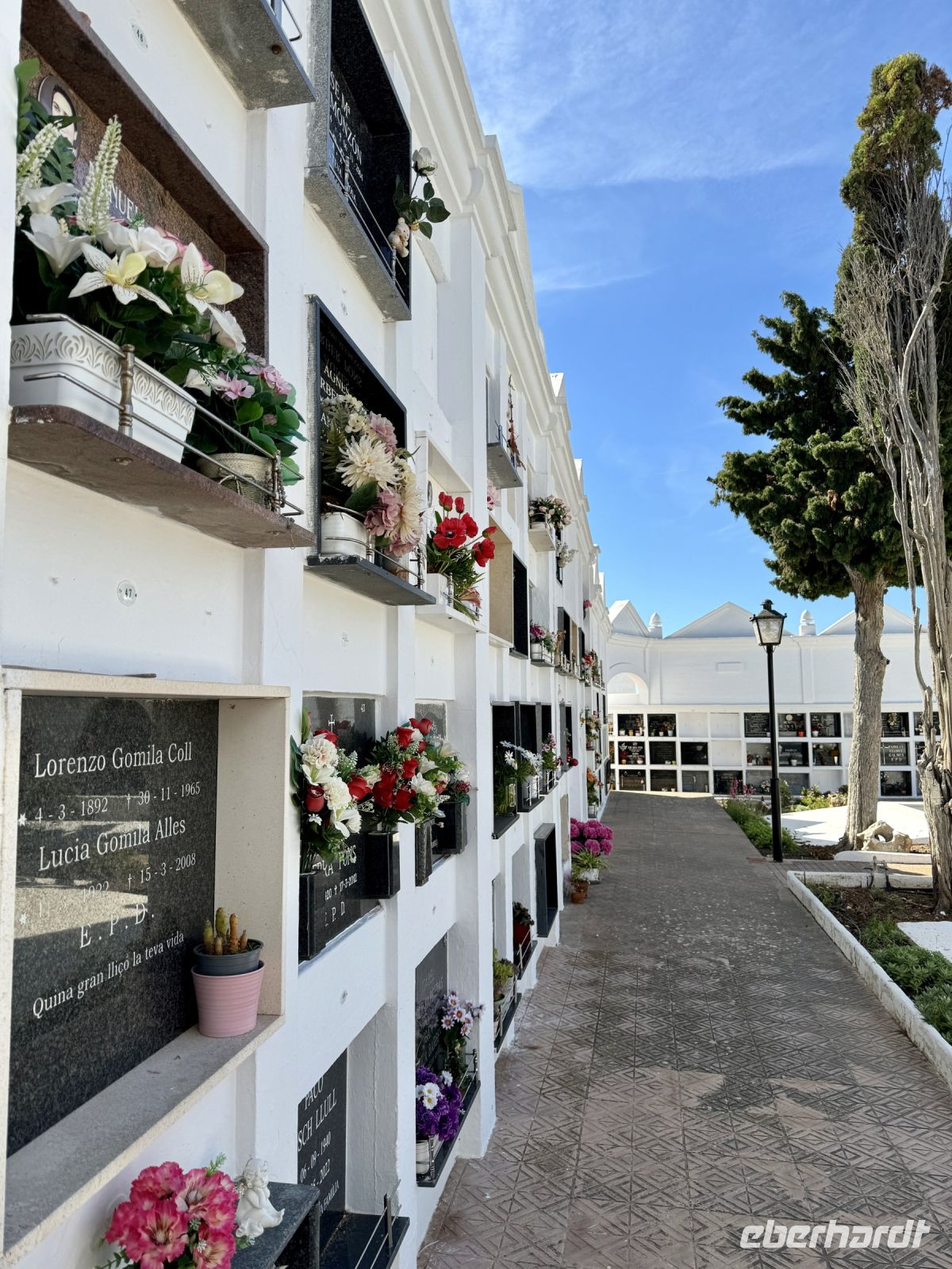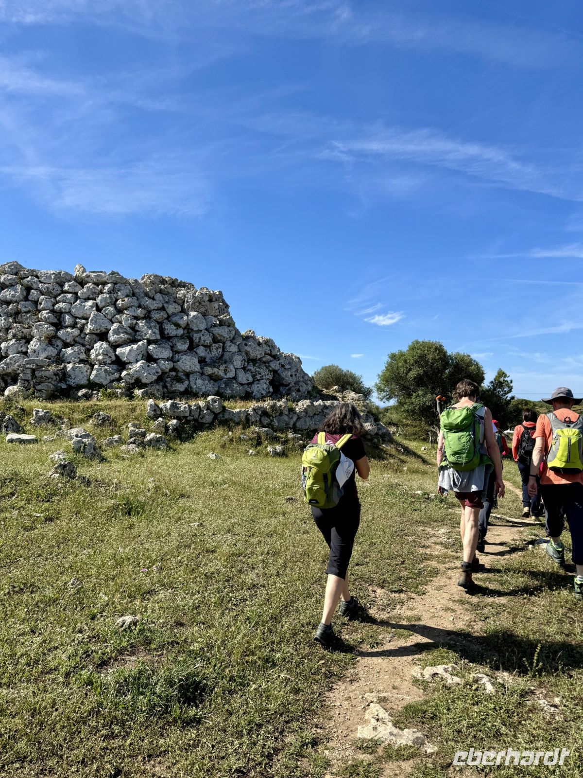 Nach einem reichlichen und leckeren Sonntags-Frühstück mit „pan con tomate“ und „Cava“ starten wir mit dem Bus Richtung Es Migjorn Gran. Wir halten kurz am Supermarkt und besorgen uns ein paar Snacks für unsere Wanderung. Pünktlich 10.00 Uhr treffen wir auf dem kleinen Marktplatz von Es Migjorn Gran ein und werden mit dem Läuten der Kirchenglocken begrüßt. Wir schlendern kurz die das verschlafene Örtchen, genießen die Ruhe laufen durch Gassen, deren Wände hier und da liebevoll mit den typisch menorquinischen Avarca-Ledersandalen dekoriert sind. Am Ortsrand halten wir an den Talayots von Binicodrell, den Resten einer prähistorischen Siedlung. Talayots sind eindrucksvolle turmartige Megalithbauten. Wenige Meter weiter passieren wir einen katholischen Friedhof, der typisch für Spanien die Grabkammern in den Wänden beherbergt und bei deren Dekoration an Kunstblumen nicht gespart wird.