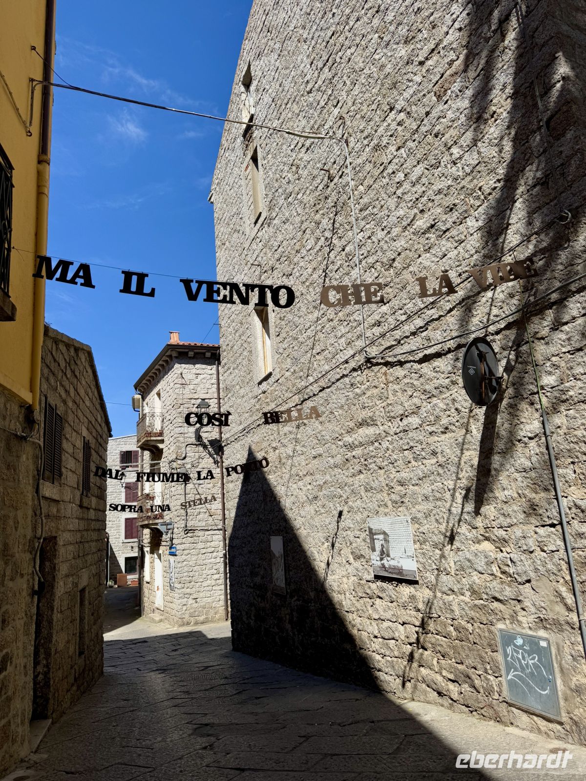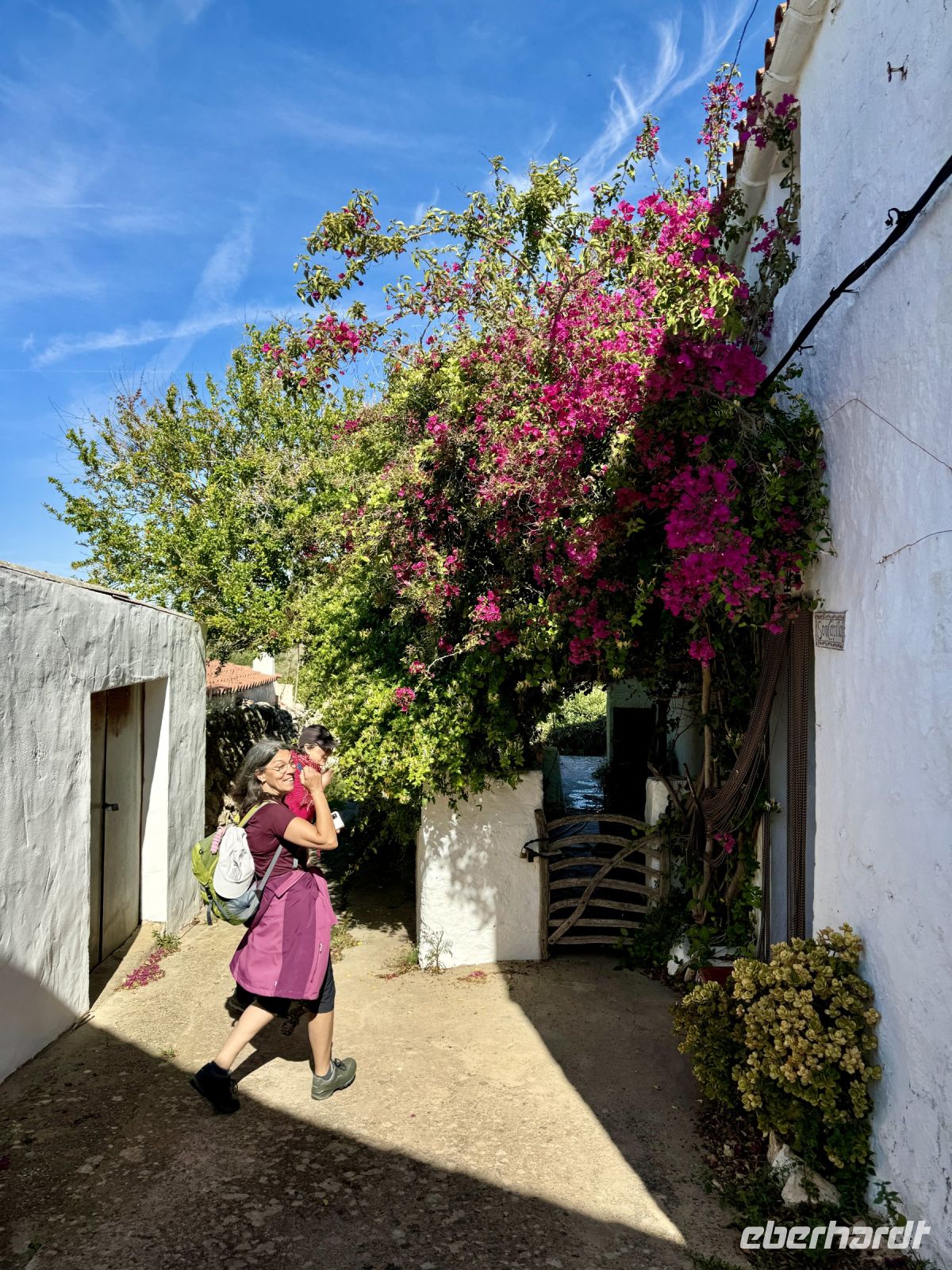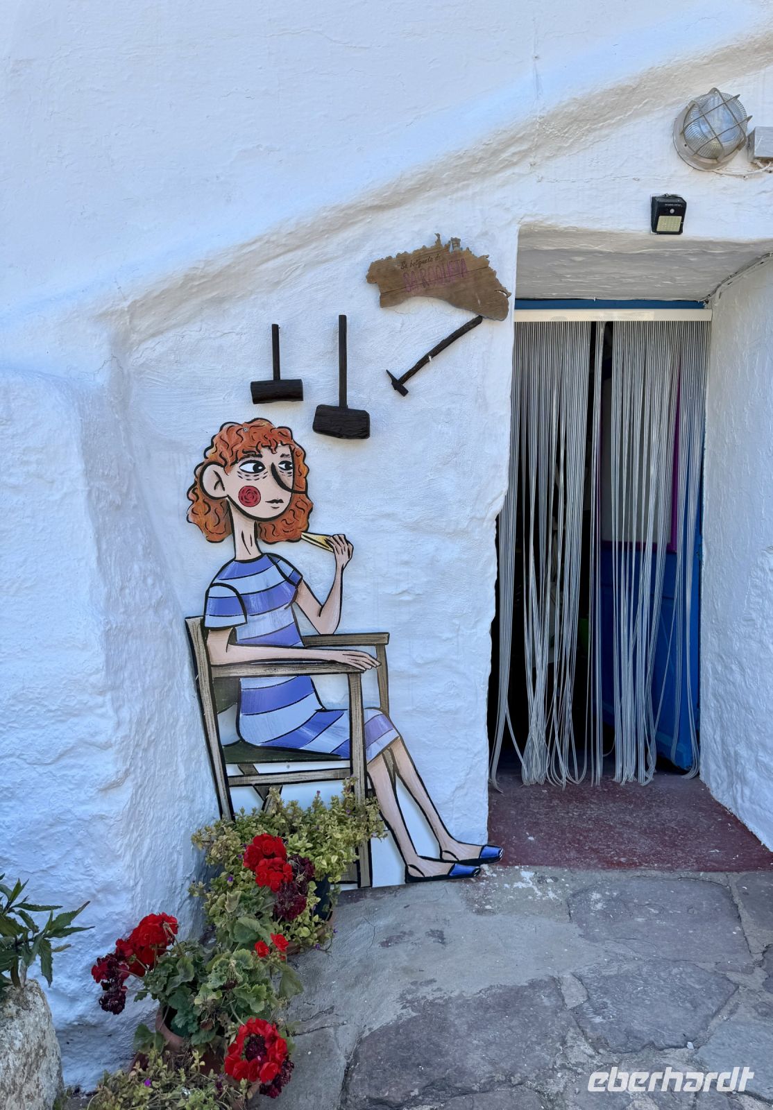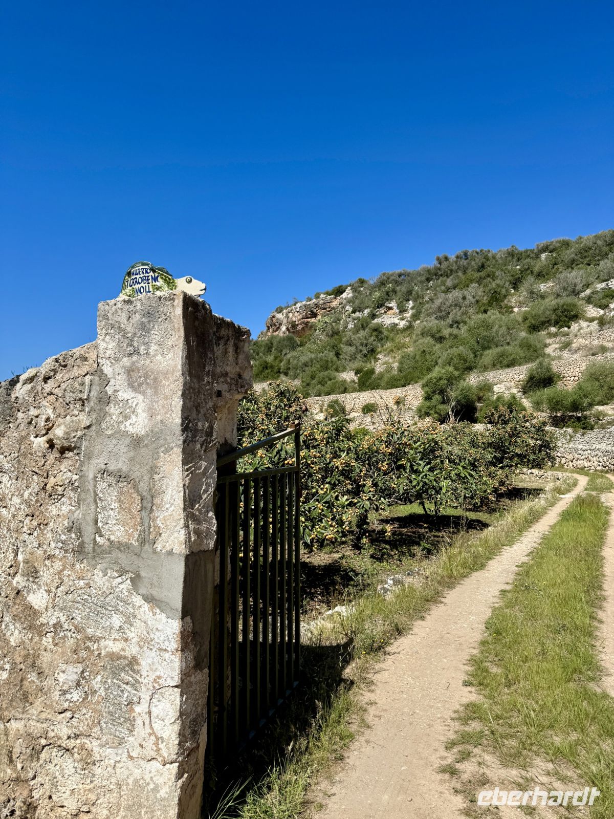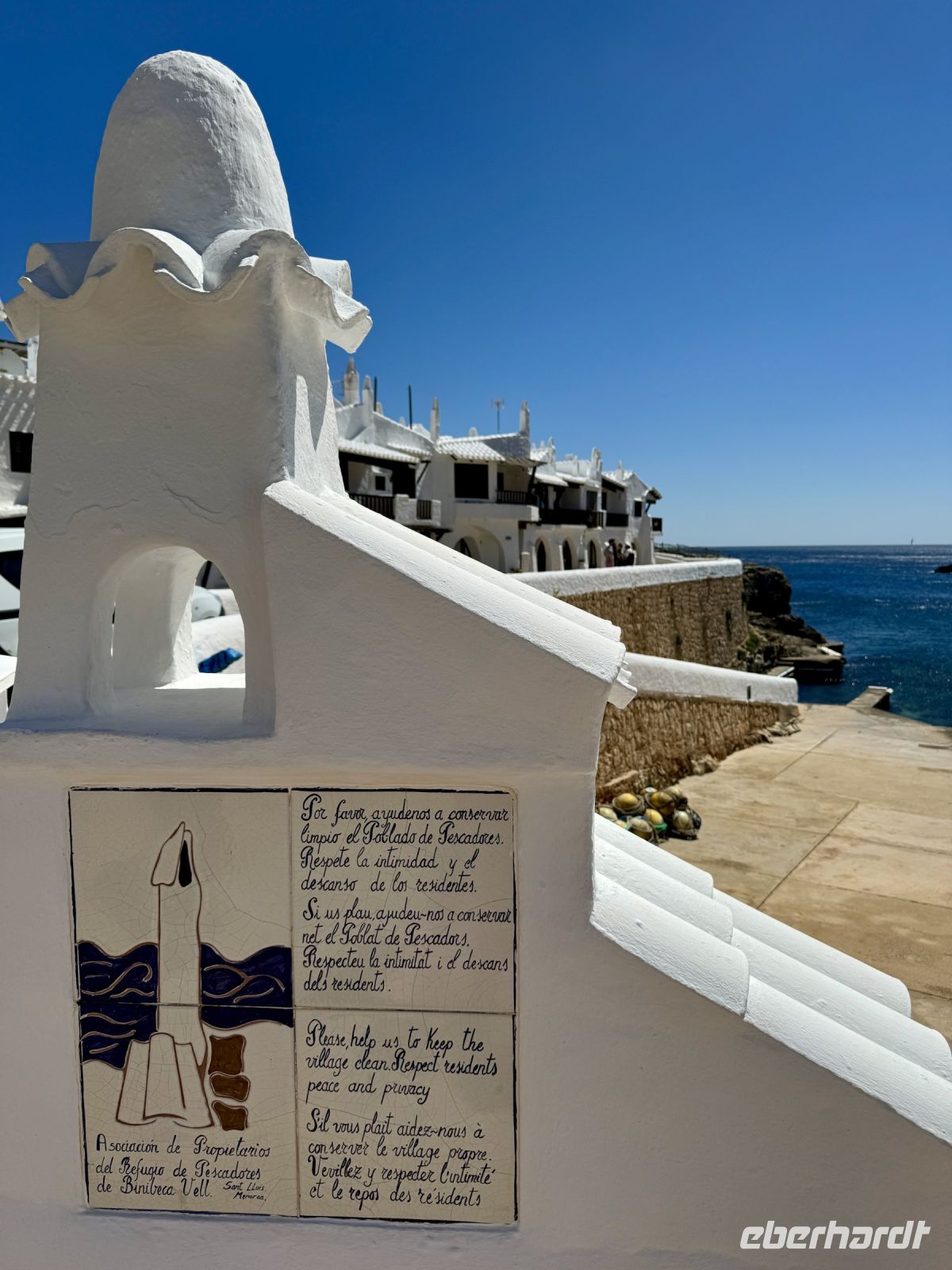 Nach einem reichlichen und leckeren Sonntags-Frühstück mit „pan con tomate“ und „Cava“ starten wir mit dem Bus Richtung Es Migjorn Gran. Wir halten kurz am Supermarkt und besorgen uns ein paar Snacks für unsere Wanderung. Pünktlich 10.00 Uhr treffen wir auf dem kleinen Marktplatz von Es Migjorn Gran ein und werden mit dem Läuten der Kirchenglocken begrüßt. Wir schlendern kurz die das verschlafene Örtchen, genießen die Ruhe laufen durch Gassen, deren Wände hier und da liebevoll mit den typisch menorquinischen Avarca-Ledersandalen dekoriert sind. Am Ortsrand halten wir an den Talayots von Binicodrell, den Resten einer prähistorischen Siedlung. Talayots sind eindrucksvolle turmartige Megalithbauten. Wenige Meter weiter passieren wir einen katholischen Friedhof, der typisch für Spanien die Grabkammern in den Wänden beherbergt und bei deren Dekoration an Kunstblumen nicht gespart wird.