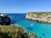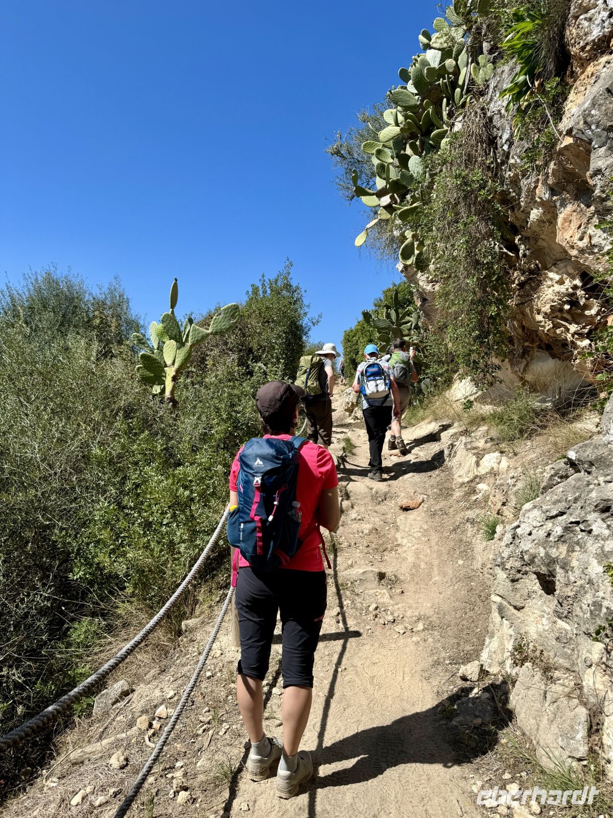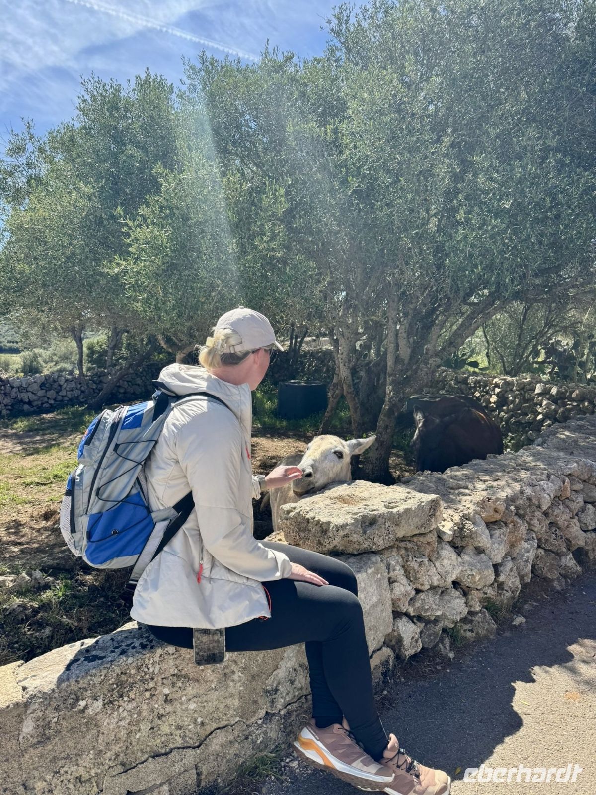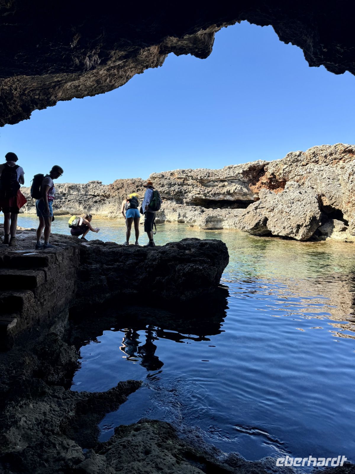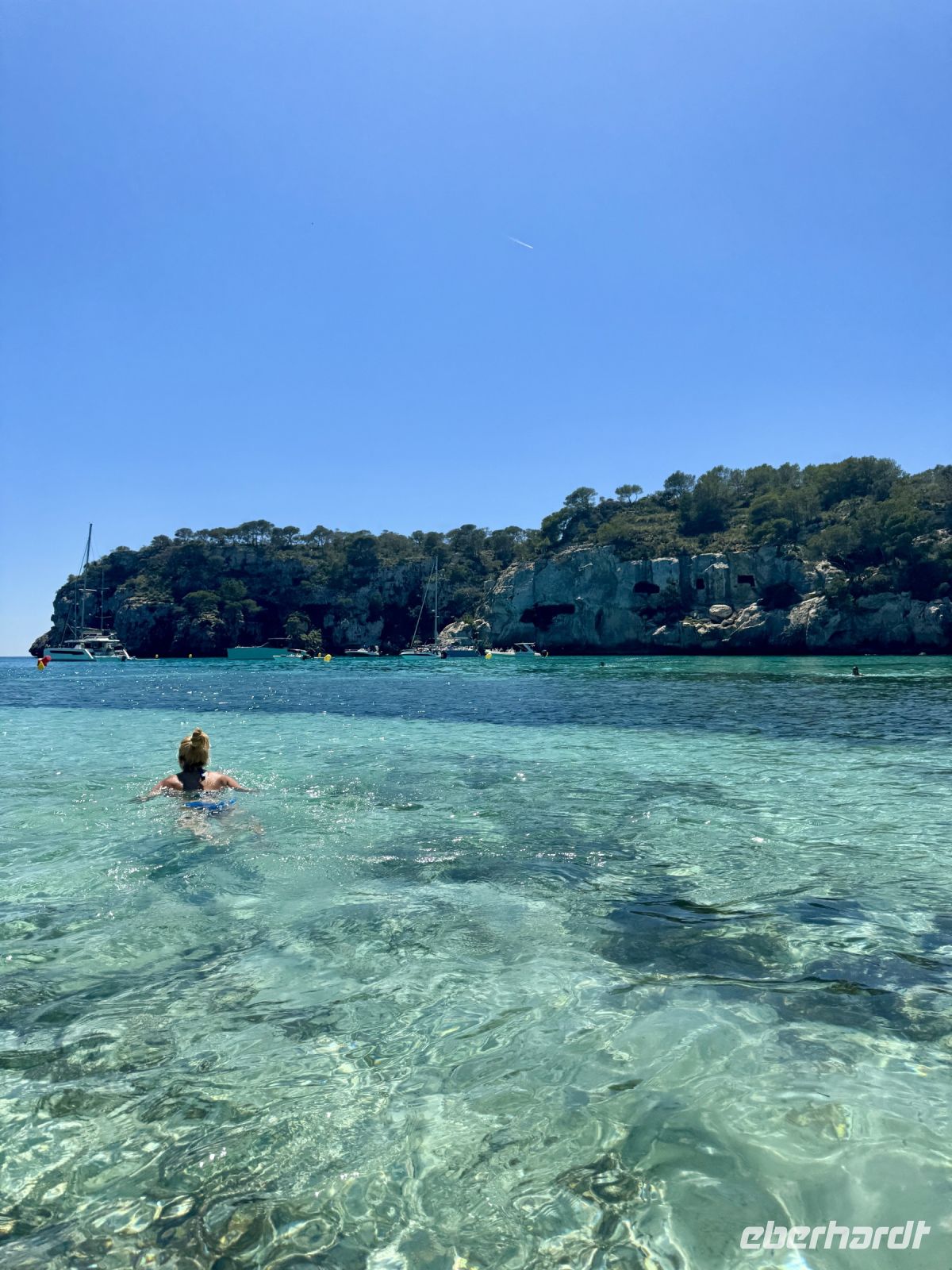 Nun endlich starten wir unsere Wanderung Richtung Südküste entlang der charakteristischen Trockensteinmauern, die einem im Inselinneren überall begegnen. Wir wandern heute durch die Schlucht von Binigaus und erreichen nach ca. 1,5 Kilometern die eindrucksvolle Cova de Coloms, was so viel wie Taubenhöhle heißt. Die Höhle ist 110 Meter lang und 25 Meter hoch und zählt als geschütztes Kulturgut. Wir wandern ganz leicht bergab auf gut zu laufenden Wanderwegen, teils schattig, bei angenehmen 20 Grad. Endlich ist in der Ferne Meer in Sicht! Am Playa Binigaus legen wir unsere Mittagspause ein und genießen den herrlichen Blick auf das türkisfarbene Meer. Die ganz Mutigen unter uns wagen ein Bad im ca. 18 Grad kühlen Nass.