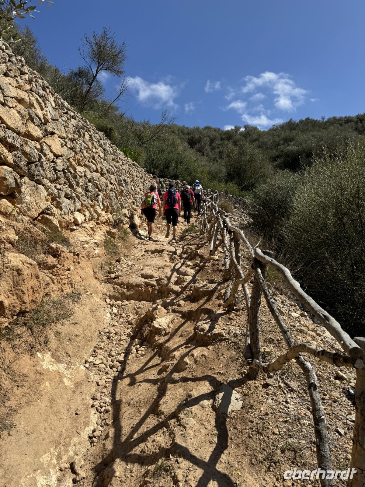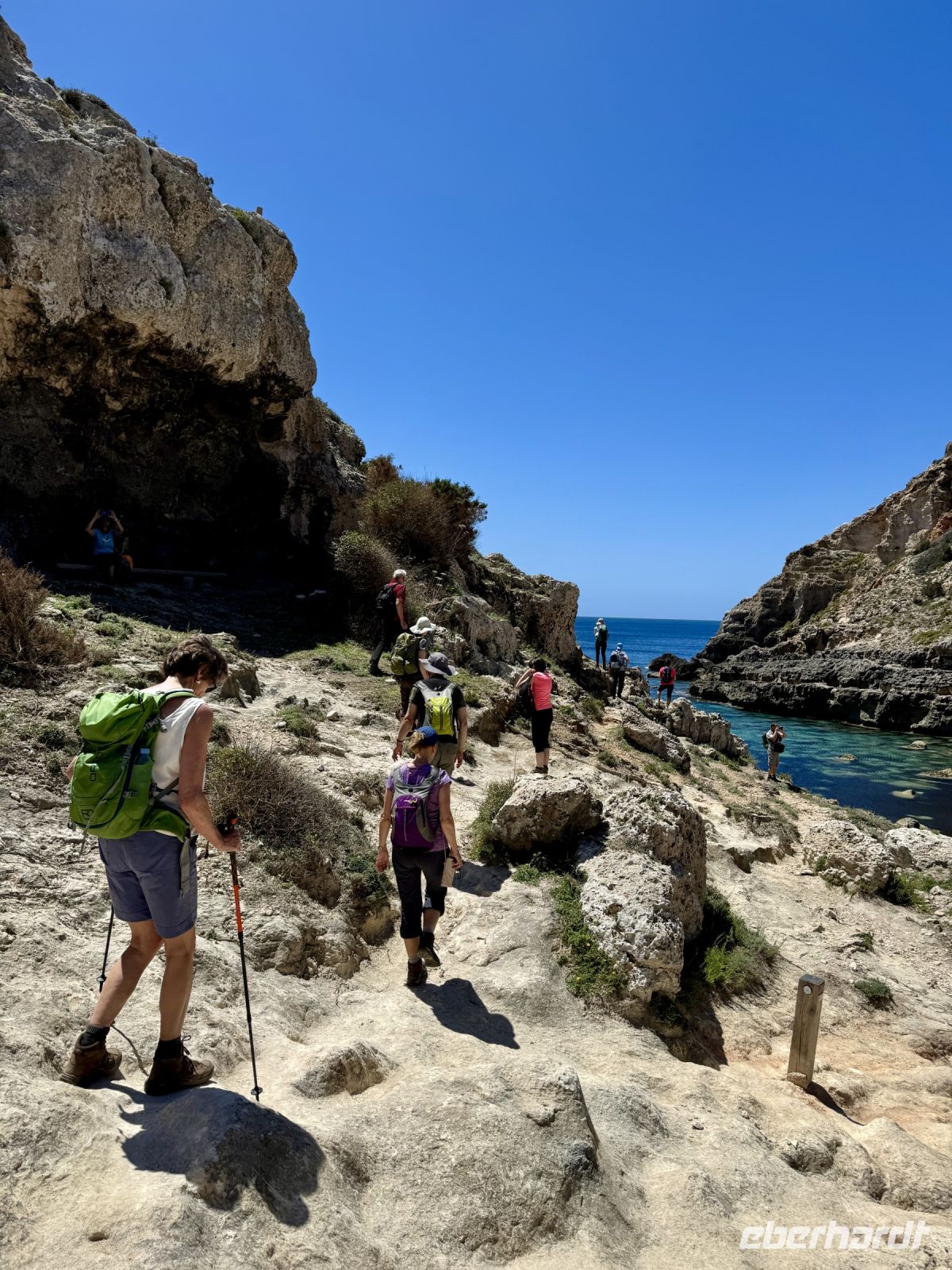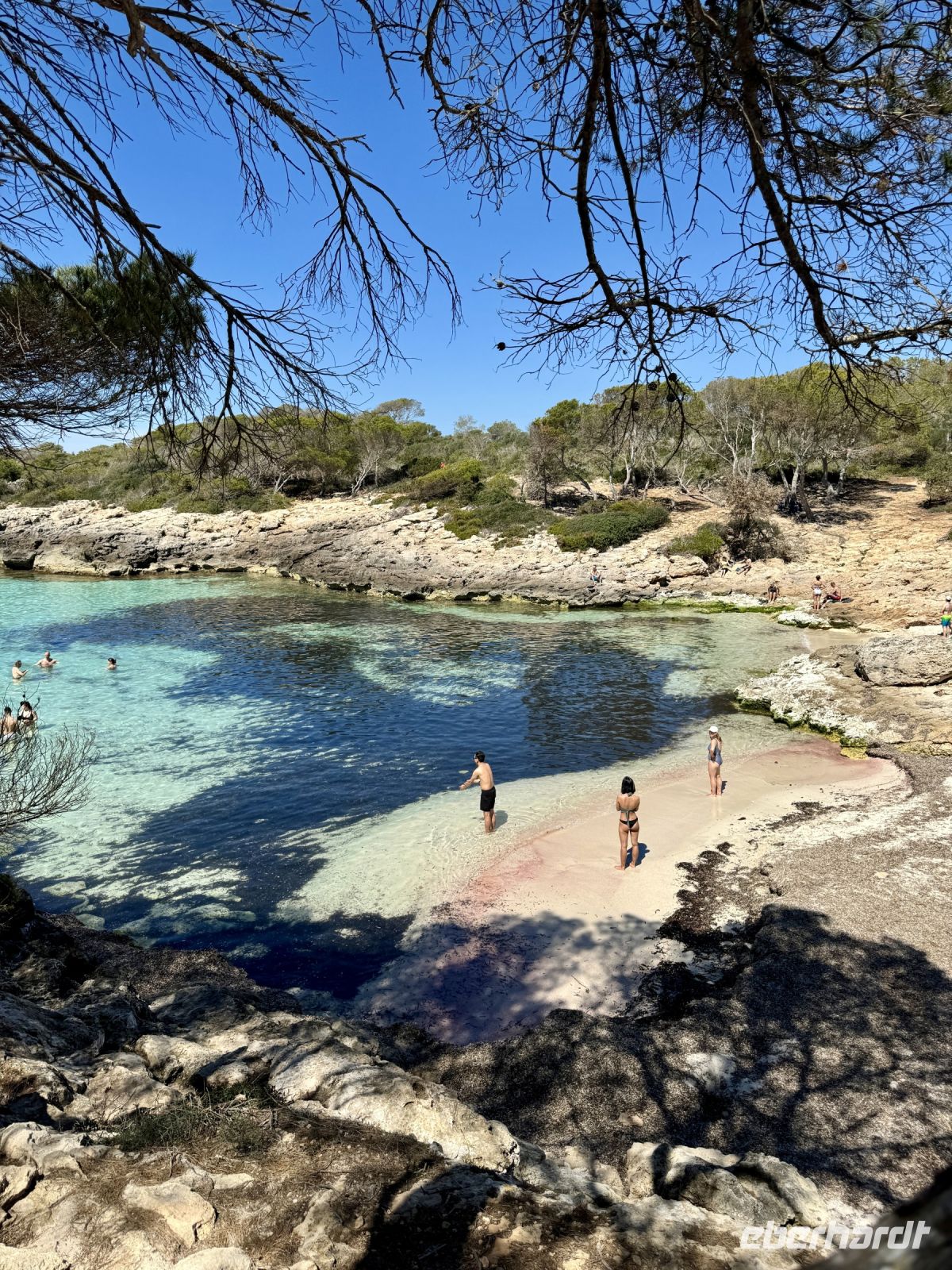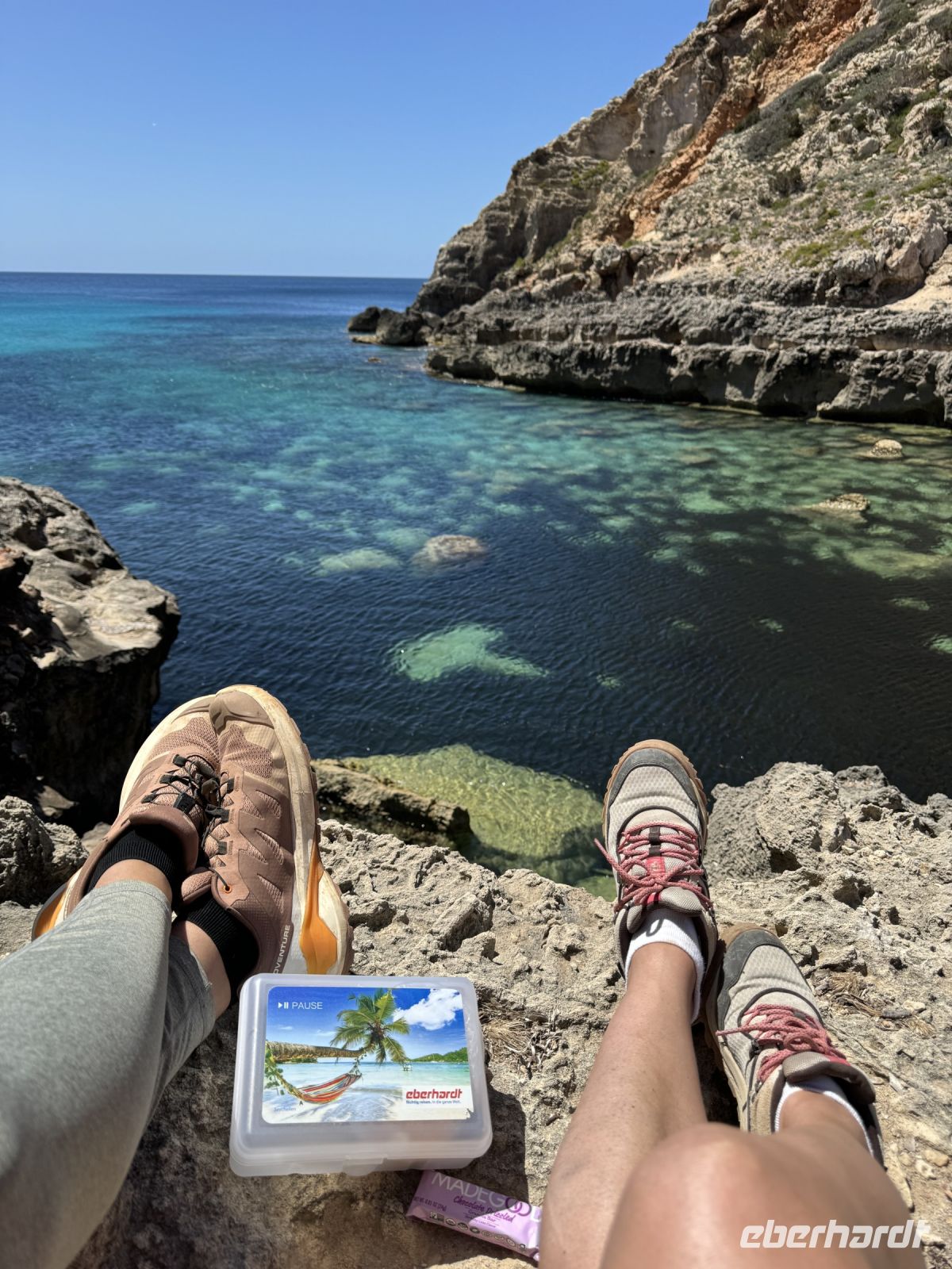 Nun endlich starten wir unsere Wanderung Richtung Südküste entlang der charakteristischen Trockensteinmauern, die einem im Inselinneren überall begegnen. Wir wandern heute durch die Schlucht von Binigaus und erreichen nach ca. 1,5 Kilometern die eindrucksvolle Cova de Coloms, was so viel wie Taubenhöhle heißt. Die Höhle ist 110 Meter lang und 25 Meter hoch und zählt als geschütztes Kulturgut. Wir wandern ganz leicht bergab auf gut zu laufenden Wanderwegen, teils schattig, bei angenehmen 20 Grad. Endlich ist in der Ferne Meer in Sicht! Am Playa Binigaus legen wir unsere Mittagspause ein und genießen den herrlichen Blick auf das türkisfarbene Meer. Die ganz Mutigen unter uns wagen ein Bad im ca. 18 Grad kühlen Nass.