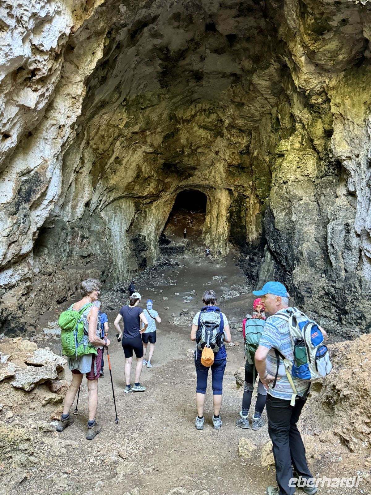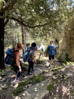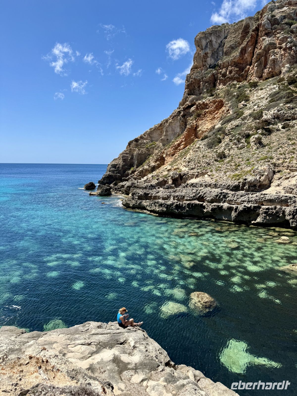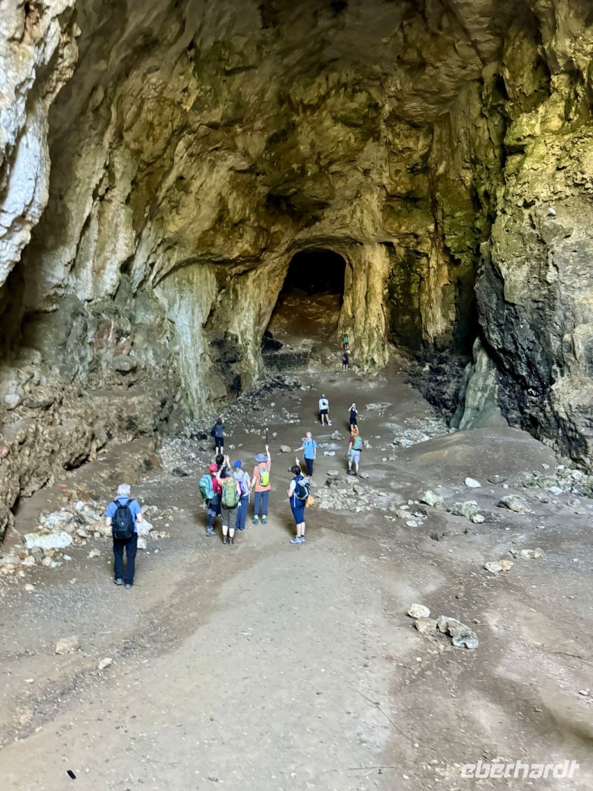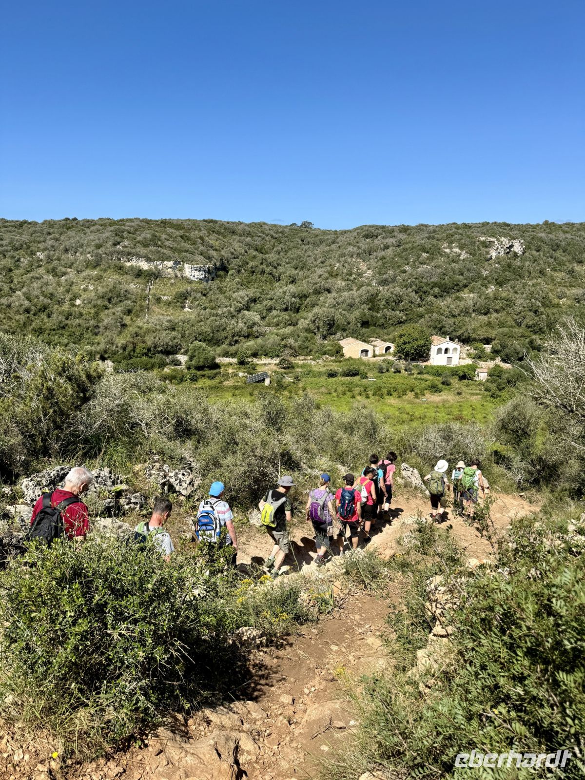 Nun endlich starten wir unsere Wanderung Richtung Südküste entlang der charakteristischen Trockensteinmauern, die einem im Inselinneren überall begegnen. Wir wandern heute durch die Schlucht von Binigaus und erreichen nach ca. 1,5 Kilometern die eindrucksvolle Cova de Coloms, was so viel wie Taubenhöhle heißt. Die Höhle ist 110 Meter lang und 25 Meter hoch und zählt als geschütztes Kulturgut. Wir wandern ganz leicht bergab auf gut zu laufenden Wanderwegen, teils schattig, bei angenehmen 20 Grad. Endlich ist in der Ferne Meer in Sicht! Am Playa Binigaus legen wir unsere Mittagspause ein und genießen den herrlichen Blick auf das türkisfarbene Meer. Die ganz Mutigen unter uns wagen ein Bad im ca. 18 Grad kühlen Nass.