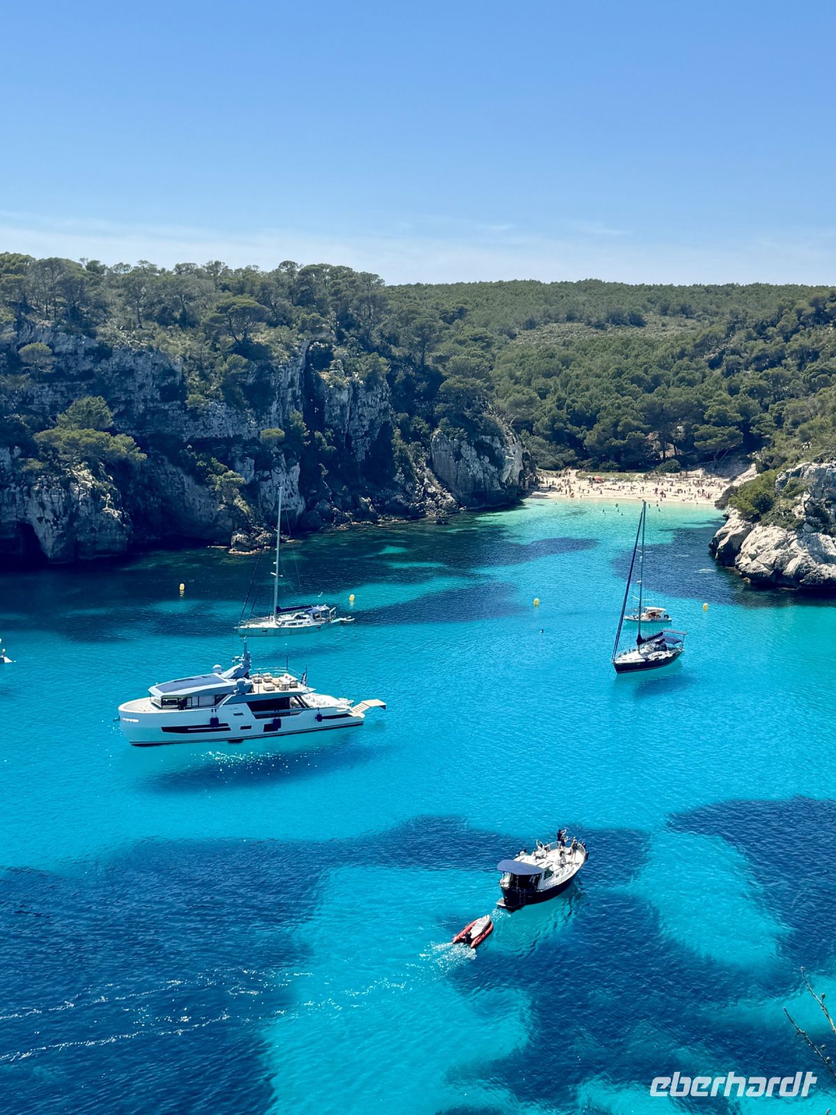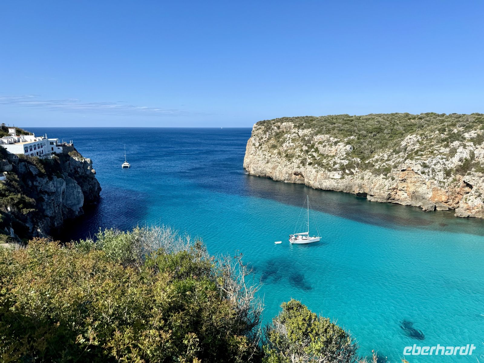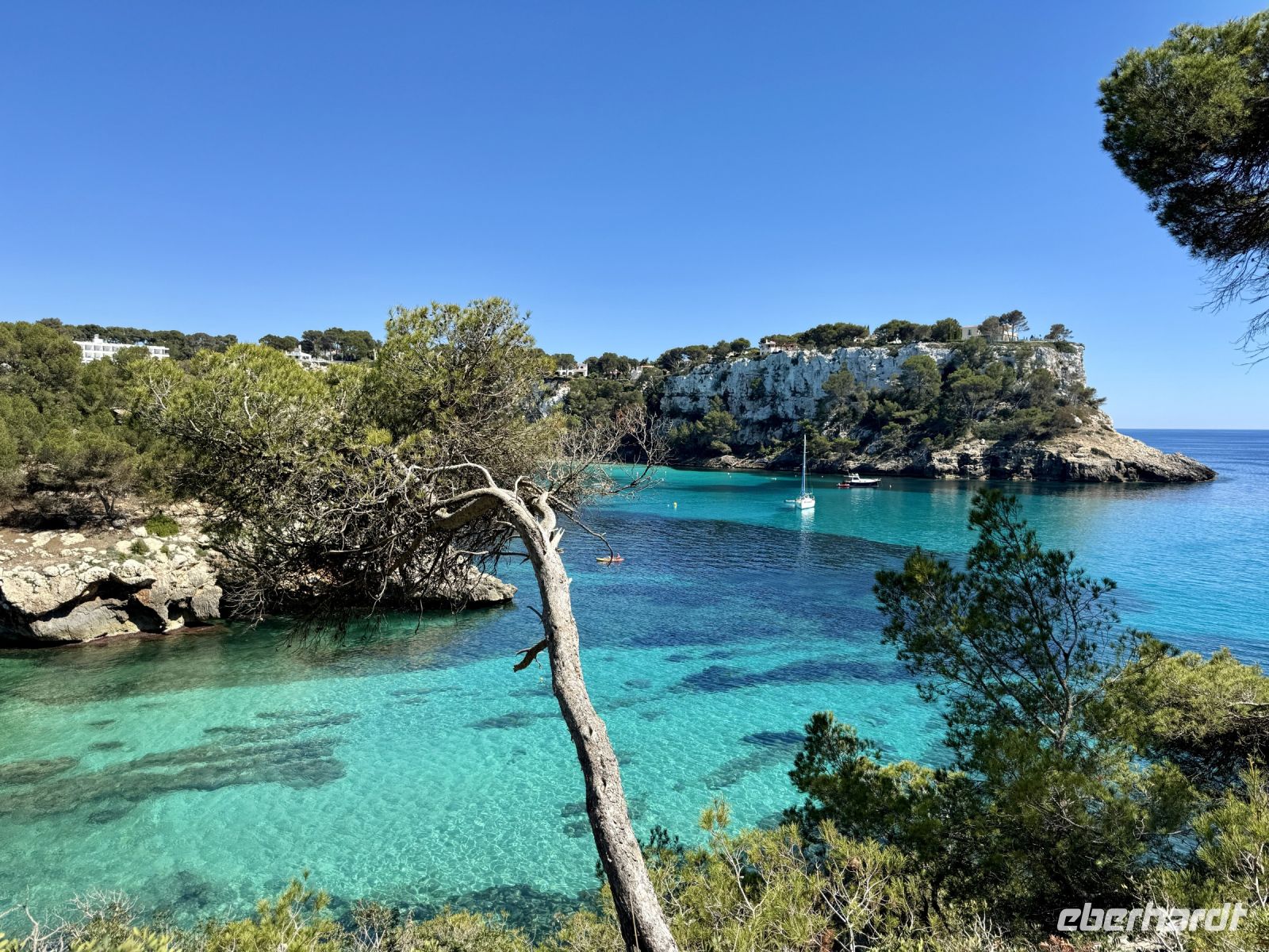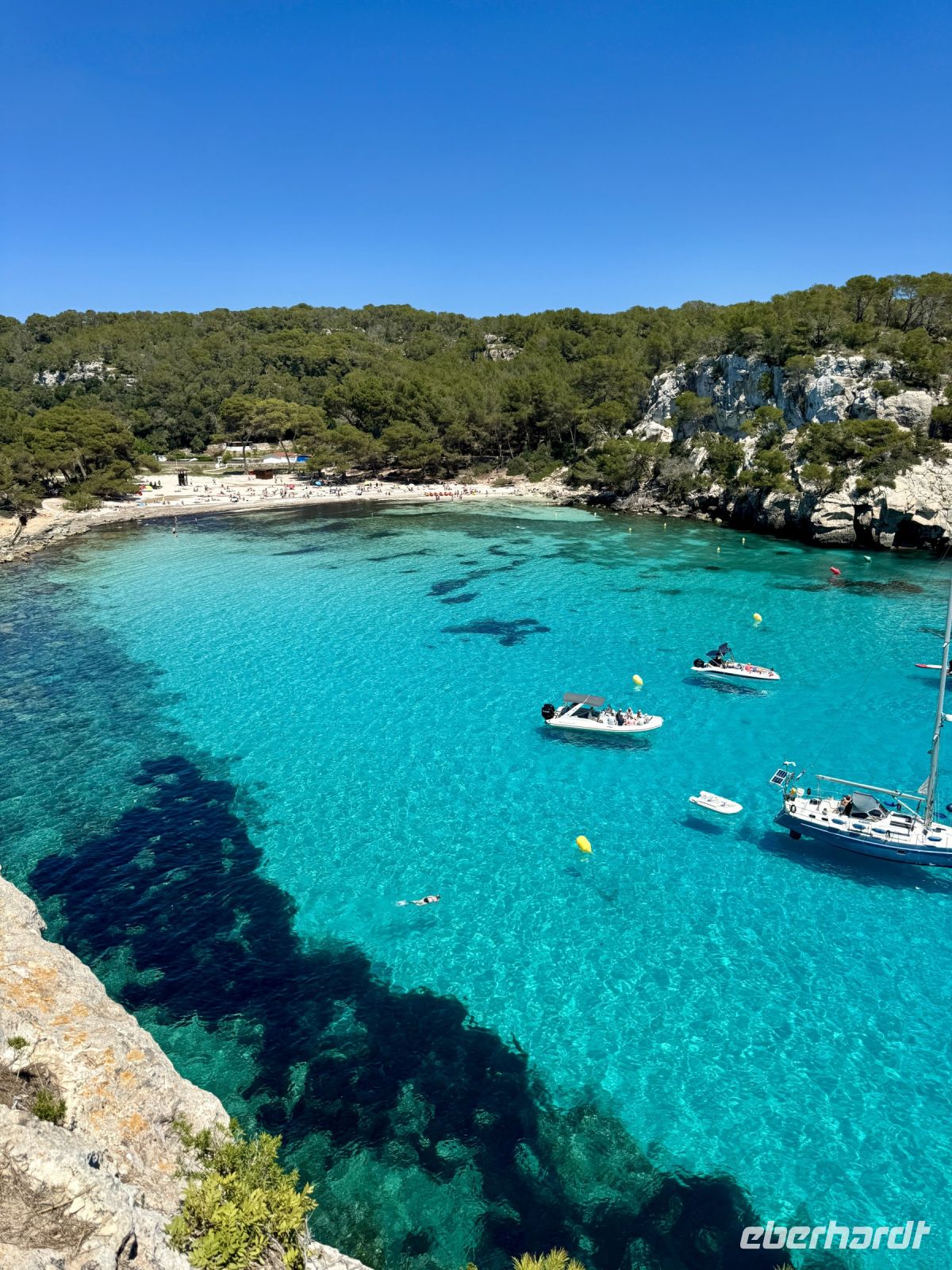 Wir starten unsere Wanderung direkt im Hotel und sind in wenigen Minuten am Meer und steigen wieder direkt auf den Cami de Cavalls ein. Die Wanderung führt die ganze Zeit entlang der traumhaften Küste. Die Sicht ist so klar, dass man bis zum Tramuntana-Gebirge auf Mallorca schauen kann. Über eine unspektakulären Treppeneingang direkt am Weg „tauchen“ wir in eine eindrucksvolle Höhle ab. Vorbei an felsiger Steilküste liegen immer wieder kleine Buchten und Strände eingebettet in diese wunderschöne Landschaft. Nach ca. 10 Kilometern erreichen wir die Cala Turqueta, die eigentlich wunderschön eingebettet in hohe Felsen liegt. Allerdings haben hier heute zwei große Ausflugsboote geankert, so dass wir nach einer kurzen Mittagspause etwas gestärkt weiterlaufen. Nach circa 2,5 Kilometern erreichen wir die Cala Macarella, die wohl schönste Bucht der Insel. Wer mag, kann noch einen kleinen Anstieg nach rechts unternehmen, denn dort befindet sich die versteckte Cala Macarelleta, der Strand und Wasser einfach nur an die Karibik erinnert. Hier genießen wir eine einstündige Mittagspause, erfrischen uns im kühlen Nass oder holen uns ein erfrischendes Getränk nach der bisher längsten Wanderung dieser Woche. Dann nehmen wir die letzten 2,5 Kilometer in Angriff. Die Cala Macarella verlassen wir über Holztreppen, die nach oben führen. Am ausgeschilderten Aussichtspunkt hat man noch einmal einen atemberaubenden Blick über die romantische Doppelbucht. Wir laufen weiter durch dichte Kiefernwälder und haben unser Ziel schon bald vor Augen. Die größte und touristisch besiedelte Bucht Cala Galdana liegt im gleichnamigen Ferienort und ist ebenso stattlich in eine wunderschöne Felslandschaft eingebettet. Nach einer gelungenen Wanderung von starken 16 Kilometern haben wir hier noch etwas Zeit zum Erholen, bevor uns ein vorab bestellter Bus zurück zu unserem Hotel bringt.