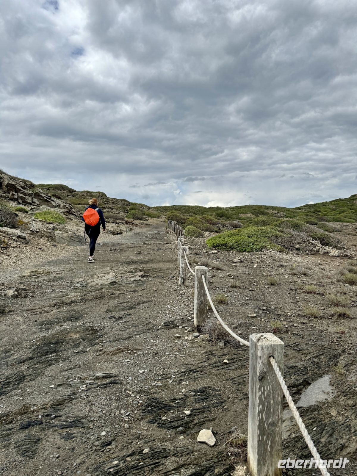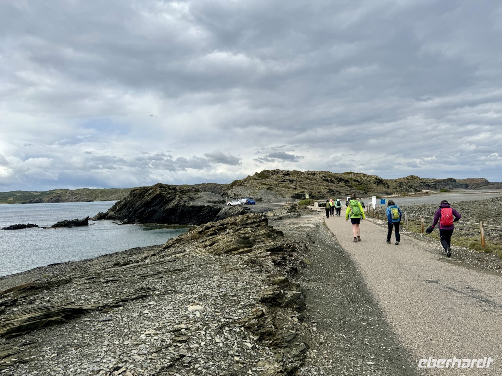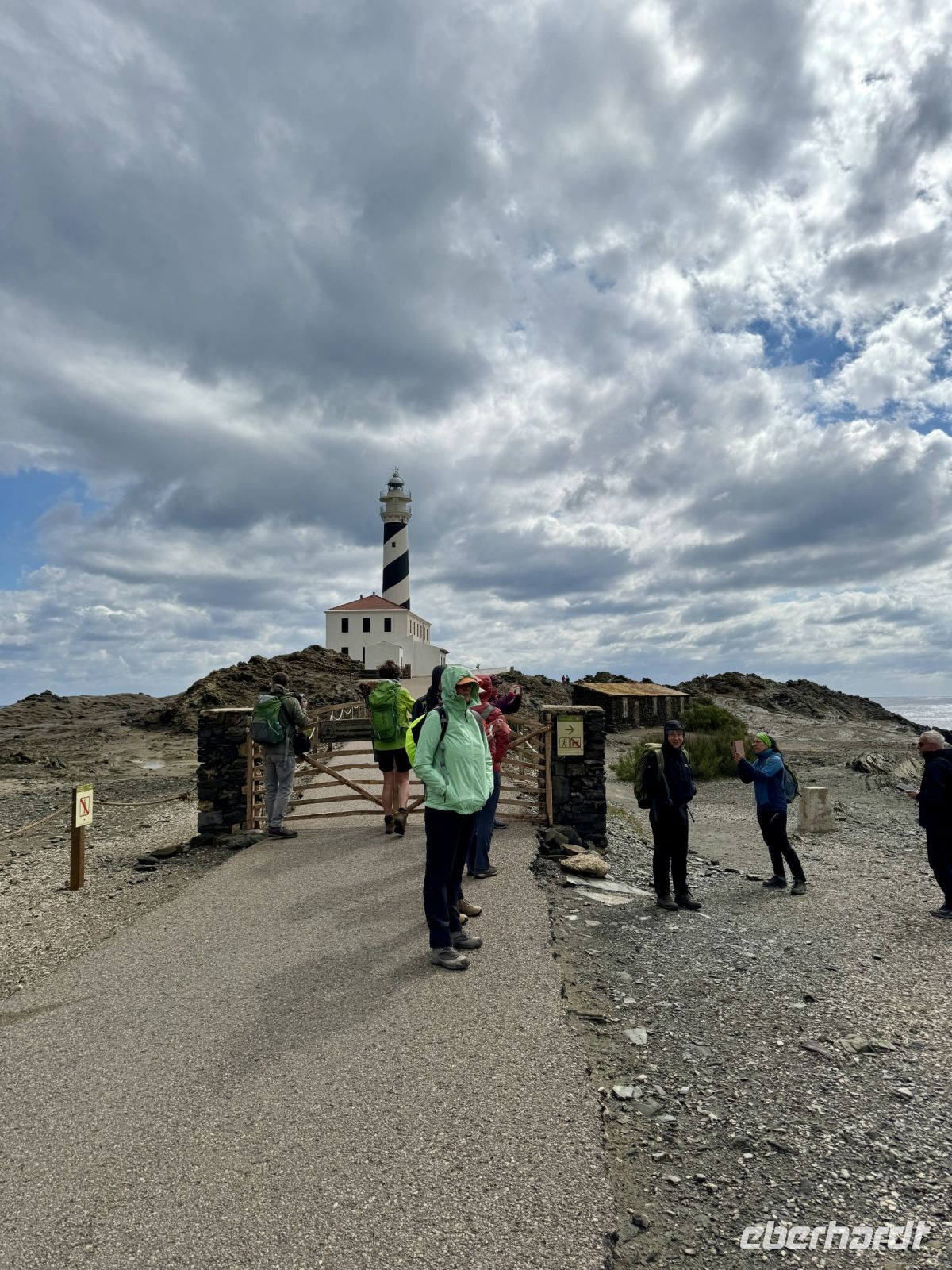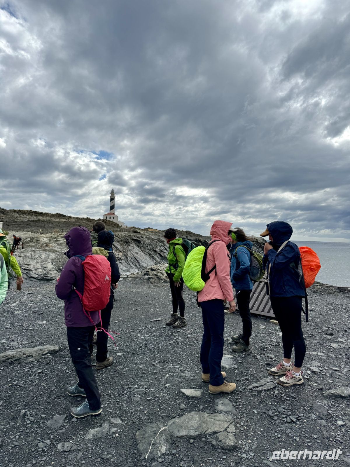 Bisher war uns der Wettergott hold und schenkte uns perfektes, sonniges Wanderwetter um die 20 Grad Celsius. Doch passend zur heutigen Wanderung an der rauen Ostküste steigen starten wir unsere Wanderung bei stürmischem und regnerischem Wetter. Aber dank guter Regenkleidung lassen wir uns die gute Laune nicht verderben. Wir beginnen unsere Wanderung im Norden am Cap de Favirtx mit dem gleichnamigen Leuchtturm. Die Küstenlandschaft besteht hier aus Felsenklippen aus schwarzem und grauem Schiefer. Die hiesigen Winde lassen das Gebiet um den Leuchtturm oft überschwemmen und wenn das Salzwasser verdunstet, bleiben die weißen „Salinas“ zurück.