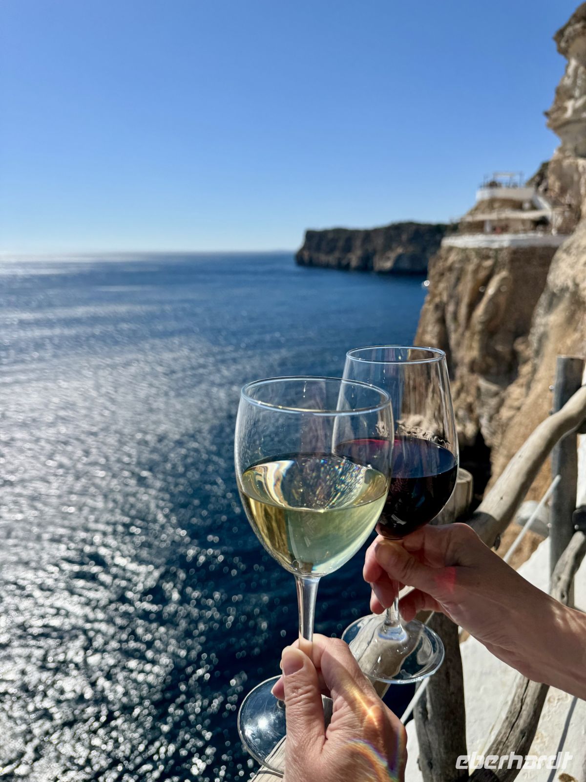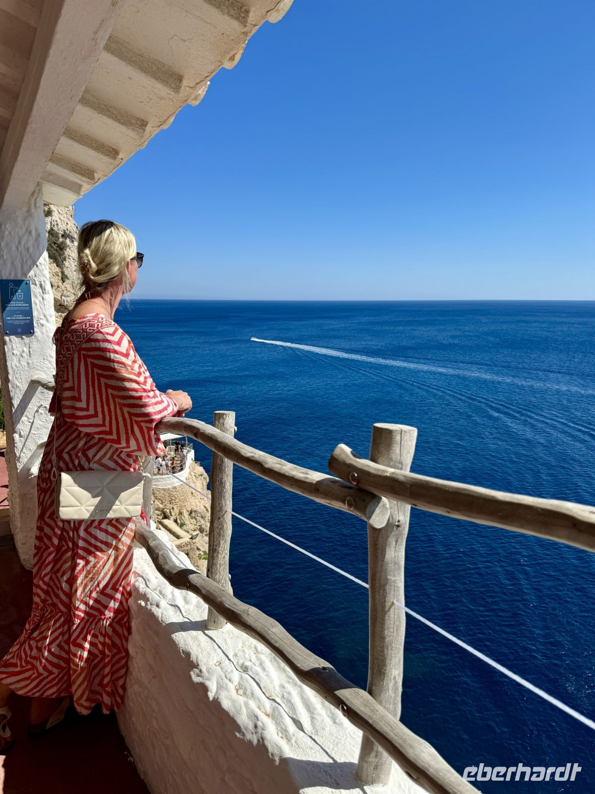 Wir fahren wieder die uns inzwischen gut bekannte und einzige Hauptstraße, die Ciutadella mit Mahón verbindet, entlang und an dieser gelegen befindet sich auch im Inselinneren die Käserei Sa Roqueta in Ferreries. Wir besichtigen den Familienbetrieb mit seinen 60 Kühen und auch einigen Schweinen. Wir werfen einen Blick in die Käseproduktion, wo man auch die Möglichkeit hat, seinen eigenen Käse herzustellen. Dafür bleibt uns heute keine Zeit, aber zum Verkosten der hauseigens hergestellten Produkte nehmen wir uns diese natürlich. Wir probieren Käsesorten verschiedener Reifegrade, Sobrasada, Brot und Wein. Ein wenig träge von so viel gutem Essen fahren wir zum Glück ein Weilchen gen Osten in die Hauptstadt Mahón. Wir bummeln gemeinsam mit Isabel durch die hübschen Gassen der Altstadt und bestaunen den mit 5,5 Kilometern Länge größten Naturhafen Europas. Im Anschluss besuchen wir das bunte Treiben des (Fisch-) Marktes und lassen das Flair Mahóns in einem Straßencafé bei Sangria und Kaffee auf uns wirken. Anschließend laufen wir gemeinsam zur bekannten Gin Xoriguer-Fabrik und haben hier die Möglichkeit, Gin pur oder als verschiedene Sorten von Likören und Kräuterschnäpsen zu verkosten. Gut gelaunt geht es weiter nach Binibequer. Wir schlendern durch die Gassen des weißen Dorfes und trinken noch ein Schlückchen Pomada. Letzter Halt unserer heutigen Rundfahrt ist der Besuch der Cova den Xoroi in Cala en Porter. Diese Location bietet eine atemberaubende Aussicht auf das stahlblaue Meer. Hier verabschieden wir Isabel und treten allein die Rückfahrt zum Hotel an.