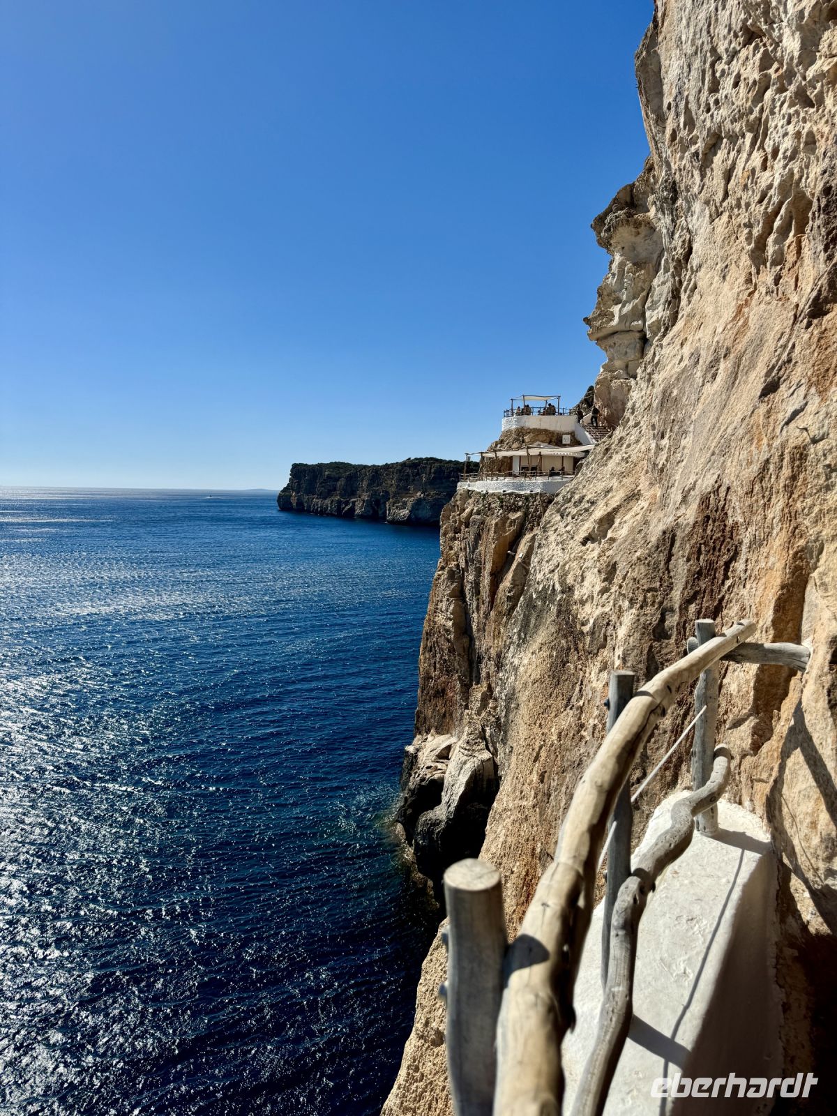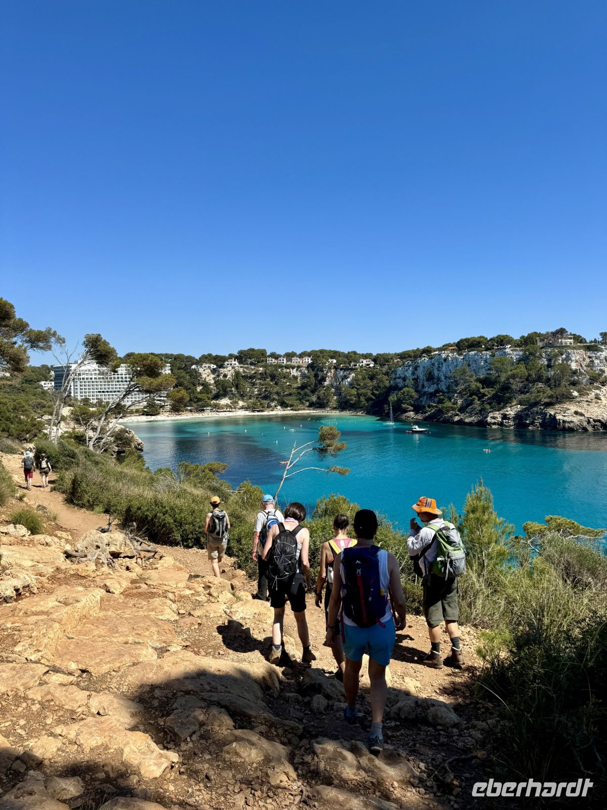 Weiter geht unsere Wanderung nun direkt an der Küste entlang Richtung Westen. Der Weg ist nun teils steinig und es geht mal bergauf und mal bergab. Trotz der malerischen Aussicht muss man sich gut auf den Weg konzentrieren. Nach ca. 2 Kilometern kehren wir wieder um Richtung Playa Binigaus und laufen nun noch ein kleines Stück bis nach Sant Tomas. Hier genießen wir in einem Café an der Promenade eine kühle, wohlverdiente Erfrischung oder einen leckeren „Café con leche“. Reichlich 9 Kilometer Wanderung liegen hinter uns. Der Bus bringt uns zurück zum Hotel nach Cala en Bosch, wo wir den Nachmittag entspannt ausklingen lassen und erneut ein leckeres Abendessen genießen.
