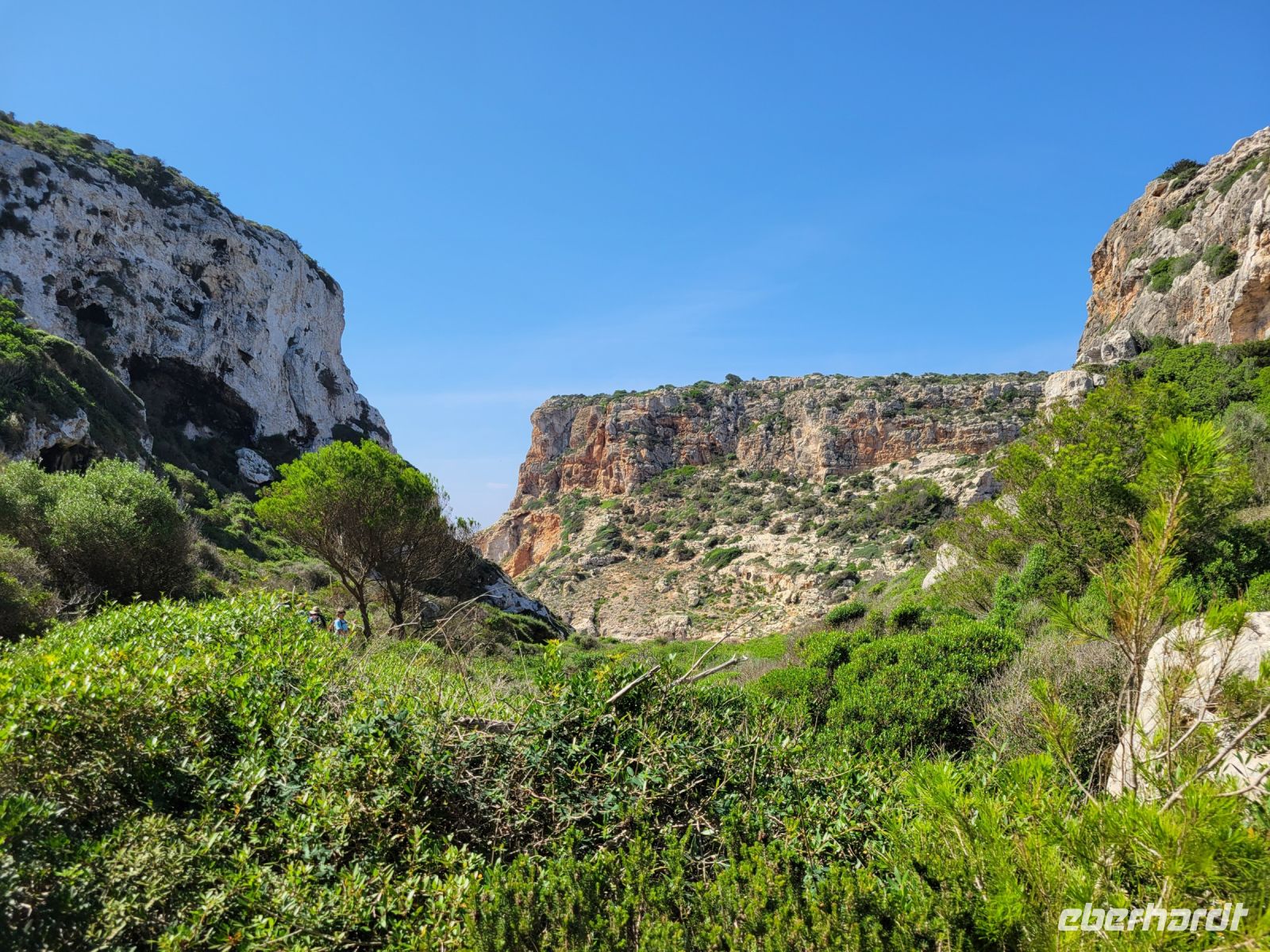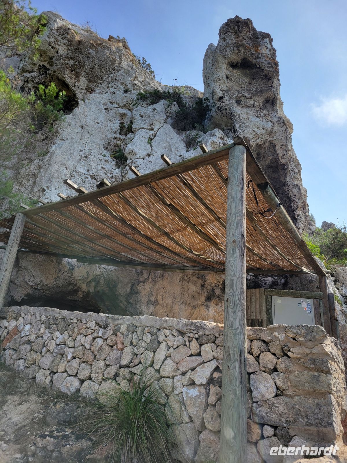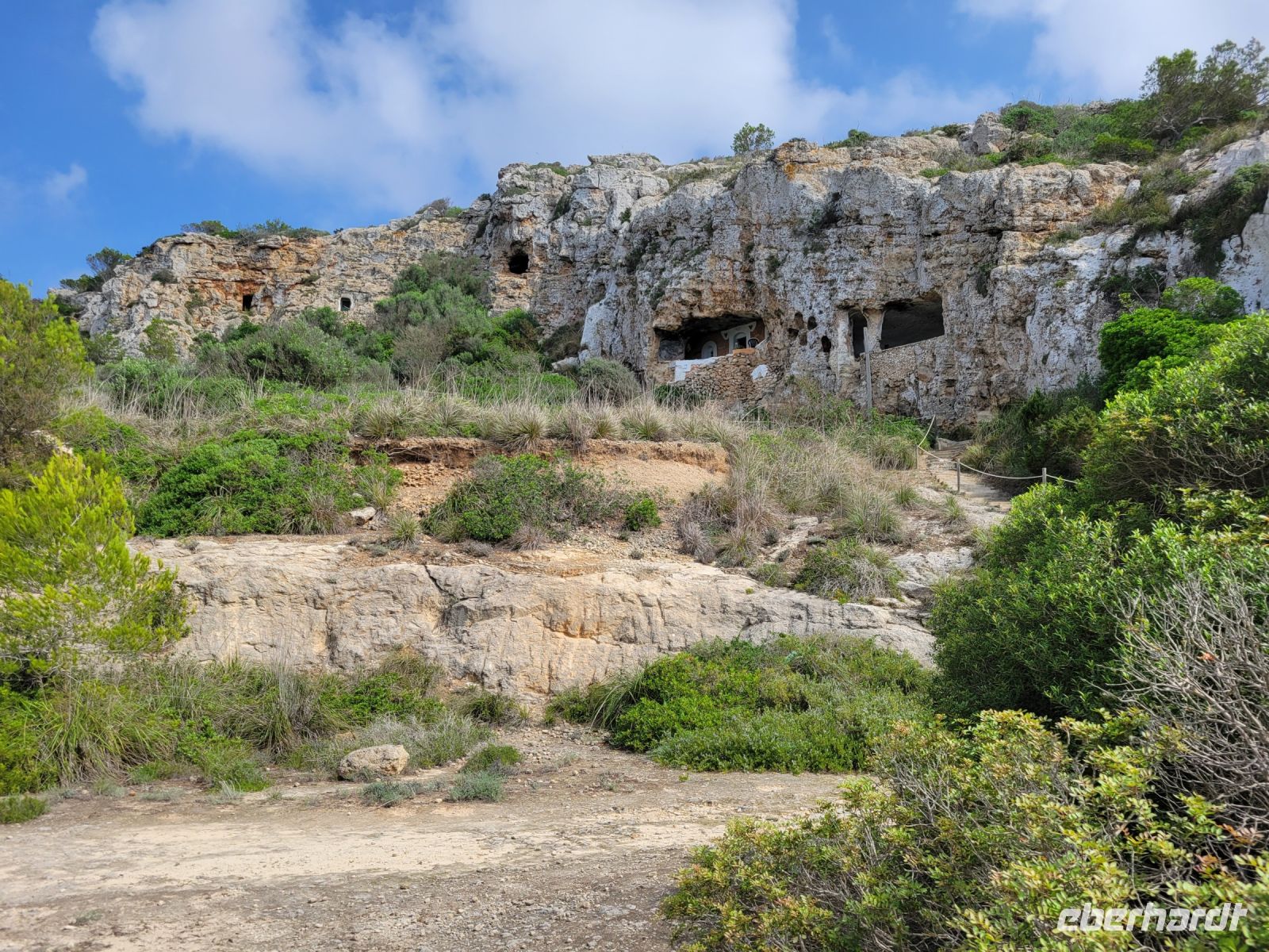 Dann treffen wir schon bald auf die eindrucksvolle Höhle Cova de Coloms (Taubenhöhle), auch bekannt als „Die Kathedrale“. Sie liegt in der Schlucht von Binigaus und gilt mit ihren etwa 110 Metern Länge und 24 Metern Höhe als größte zugängliche Höhle Menorcas. In prähistorischer Zeit wurde sie möglicherweise als Begräbnisstätte genutzt.