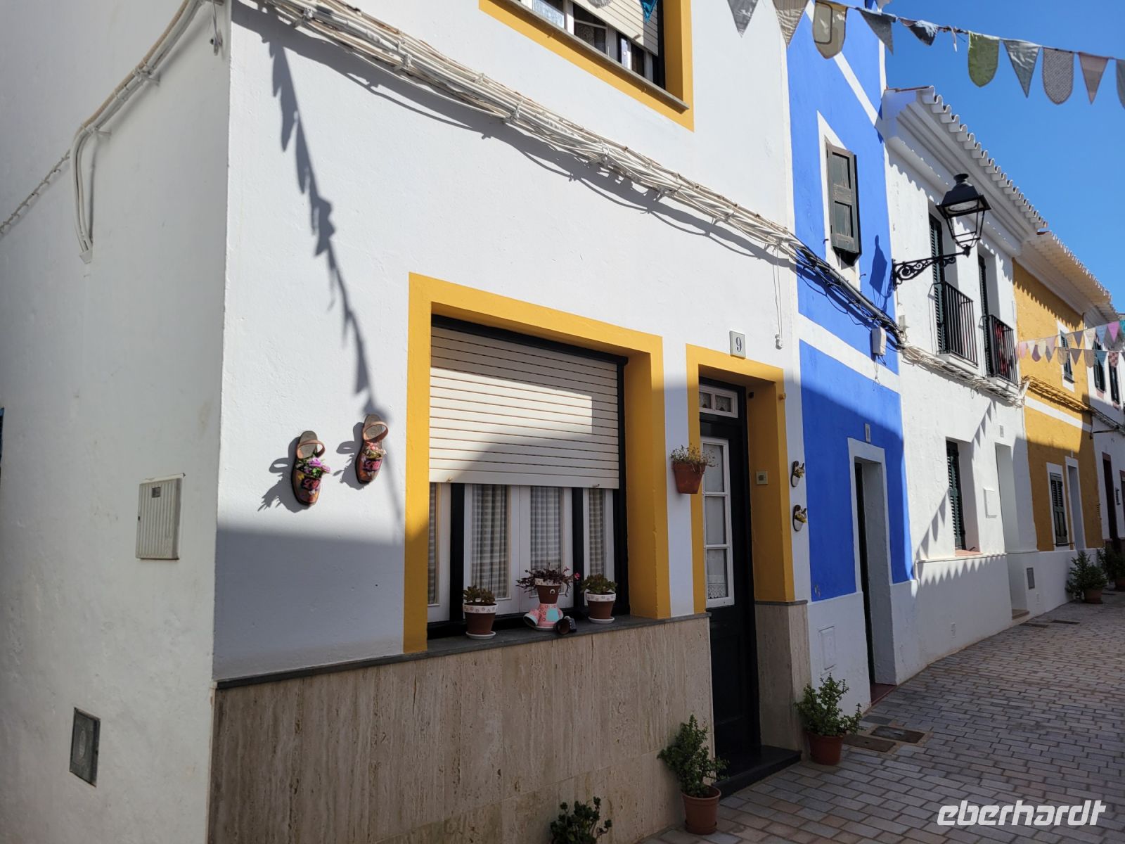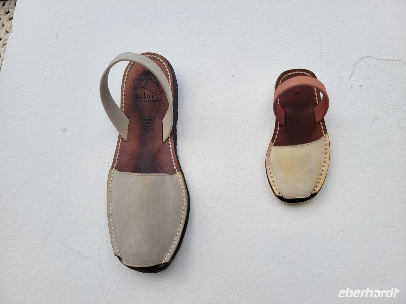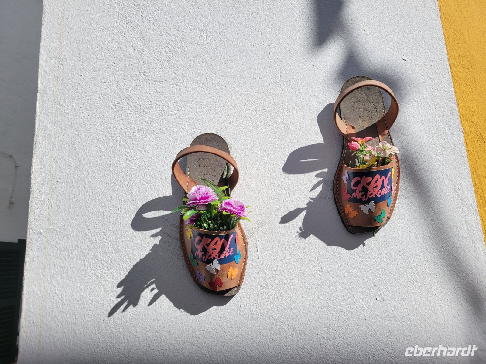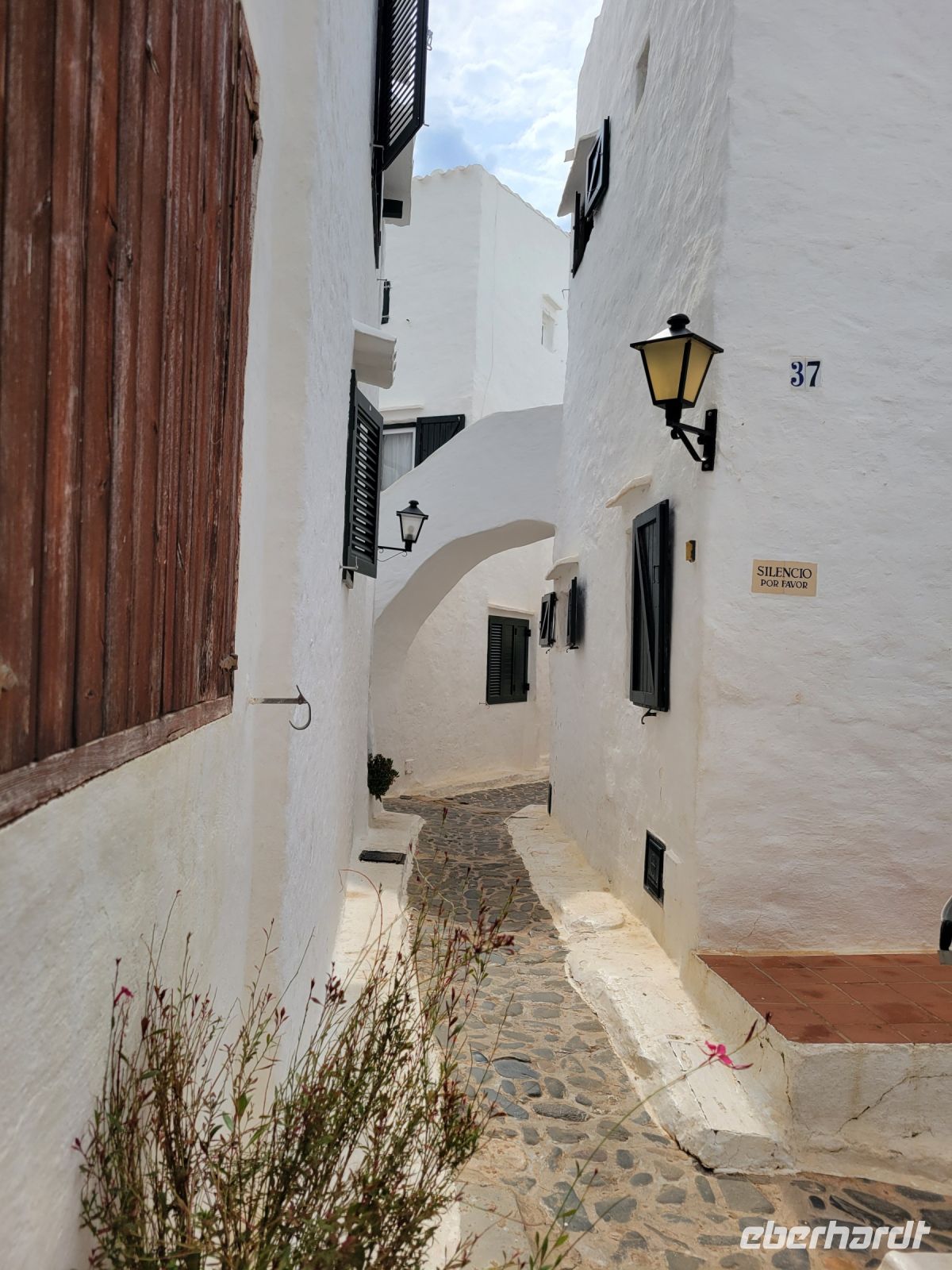 Bei aufgeklartem Wetter mit der „rein gewaschenen“ Luft fahren wir zunächst in östliche Richtung und wenden uns dann nach rechts bis zum kleinen Dorf Es Migjorn Gran. Es heißt aus dem Katalanischen übersetzt „der große Süden“, und so liegt es auch malerisch im Süden von Menorca und ist Ausgangspunkt für unsere heutige Wanderung. Bevor wir starten, haben wir noch etwas Zeit, den Ort, mit seinem typisch menorquinischen Flair, den anheimelnden Gässchen und traditionell in weiß gekälkten Häusern zu erkunden. Auf den Hauswänden finden sich hier und da Abbildungen von und Dekorationen mit menorquinischen Avarca-Ledersandalen, der traditionellen menorquinischen Fußbekleidung.